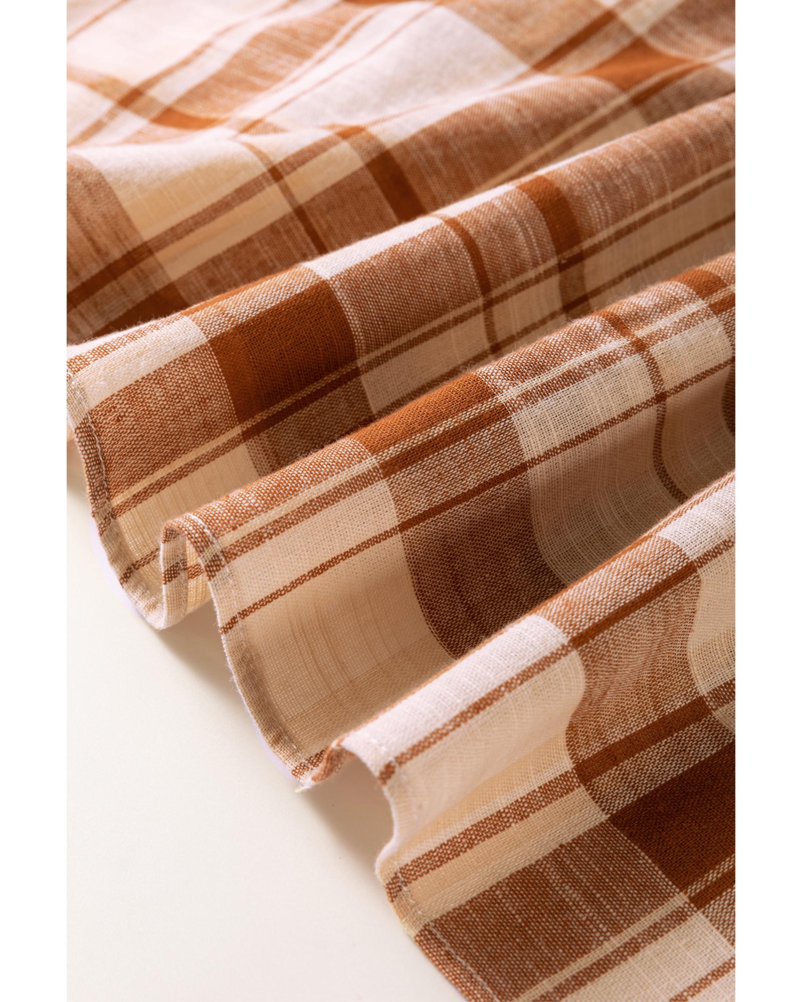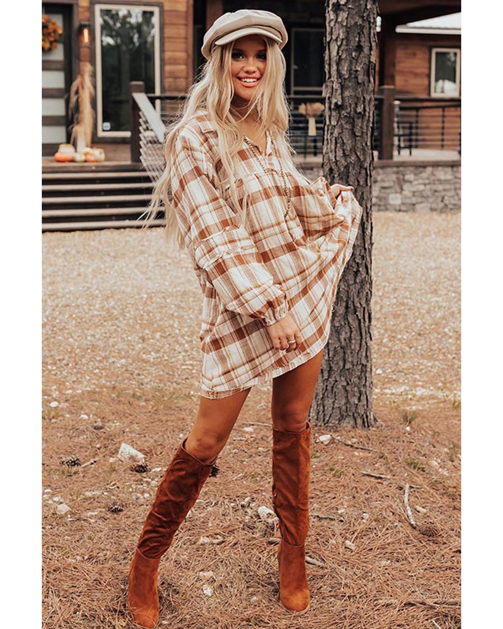 Brown Plaid Print Side Pockets Frilled Babydoll Mini Dress – M
