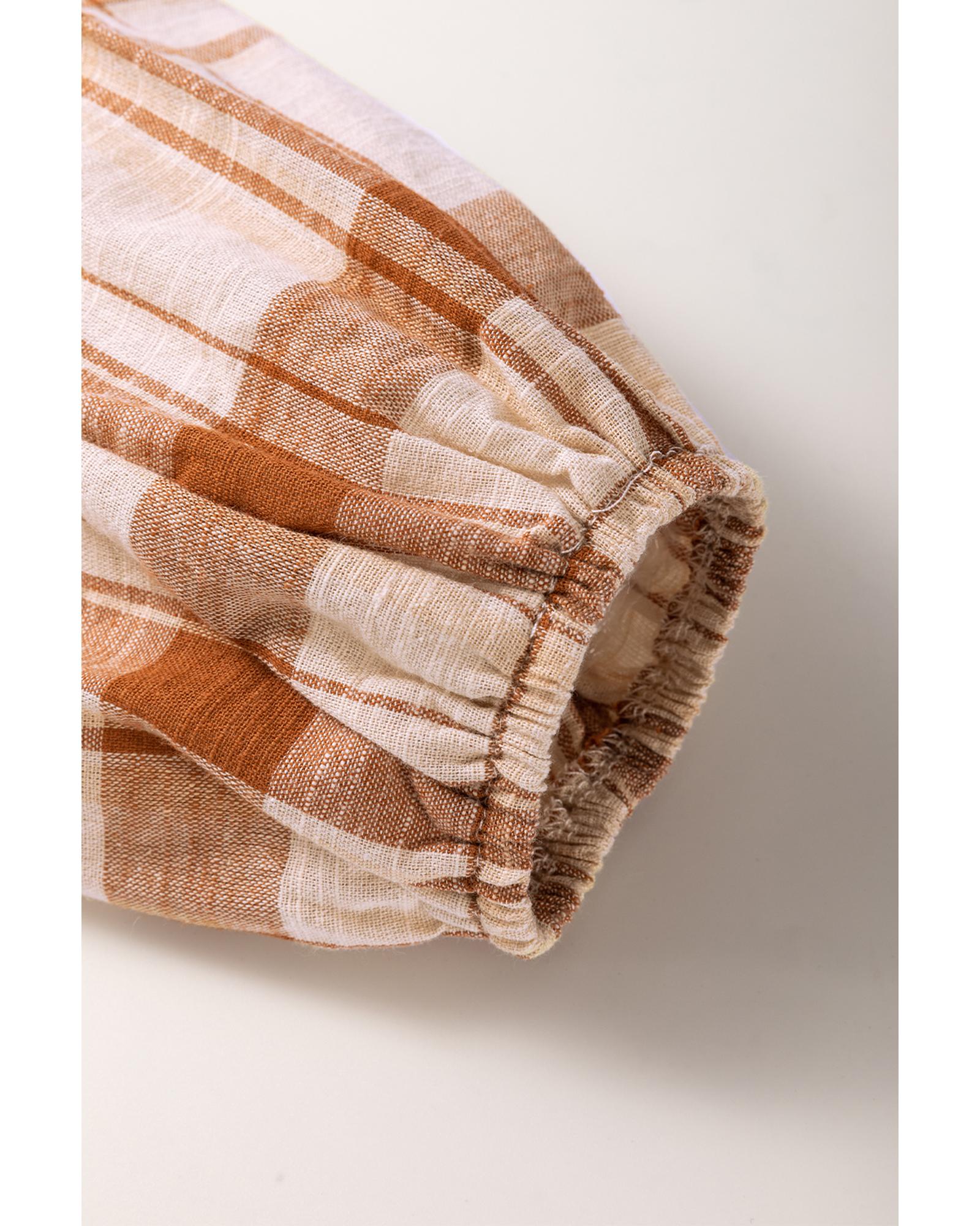 Brown Plaid Print Side Pockets Frilled Babydoll Mini Dress - L
