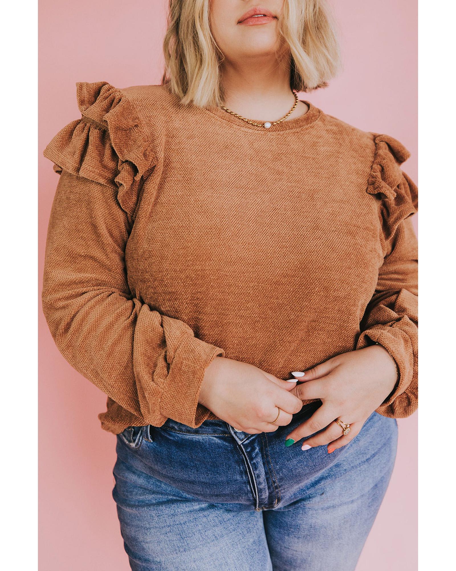Brown Plus Size Solid Ruffled Tiered Long Sleeve Top – 1X