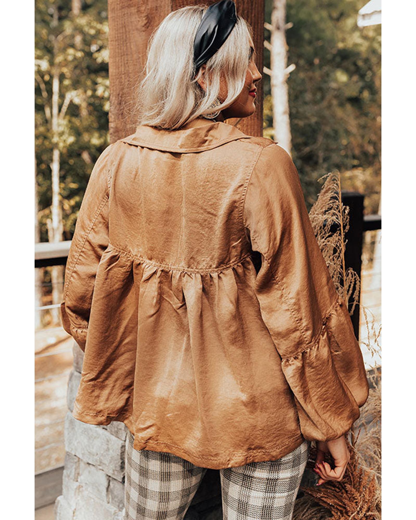 Brown Puff Sleeve Collared Pleated Babydoll Blouse – L