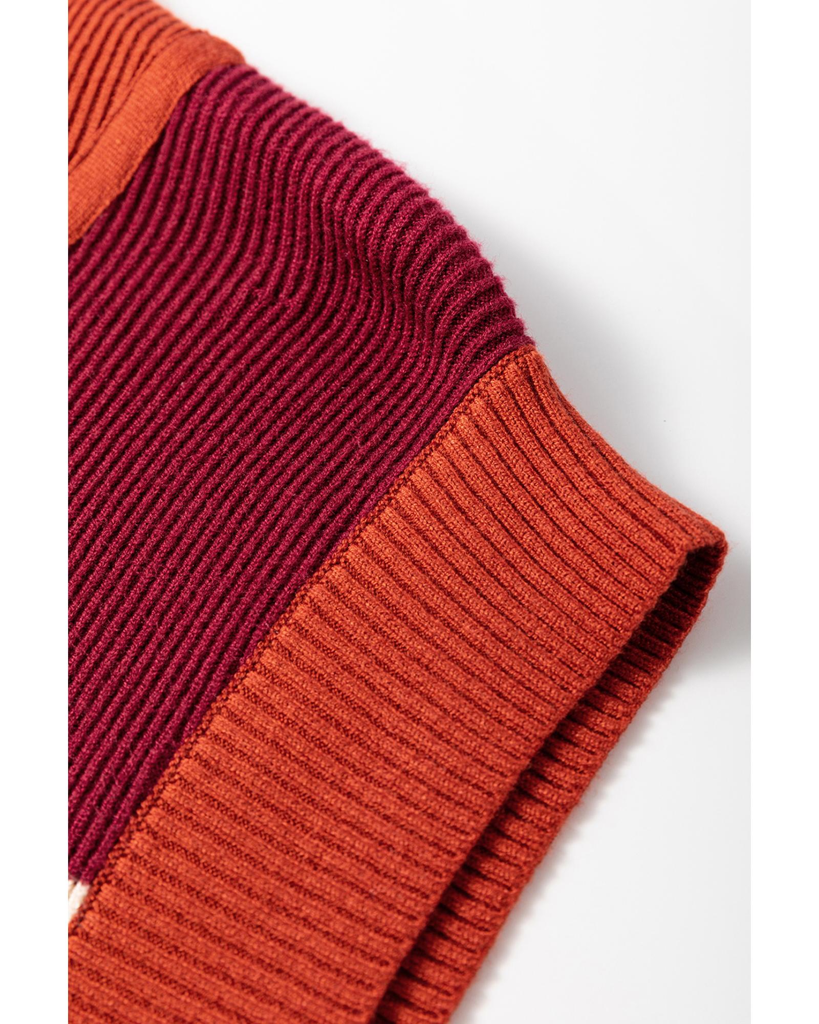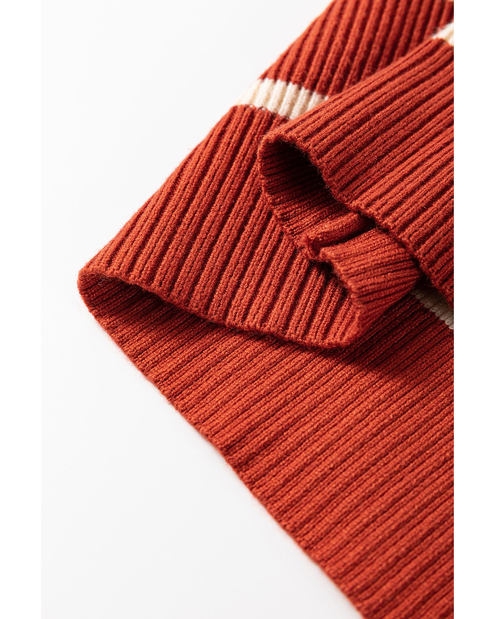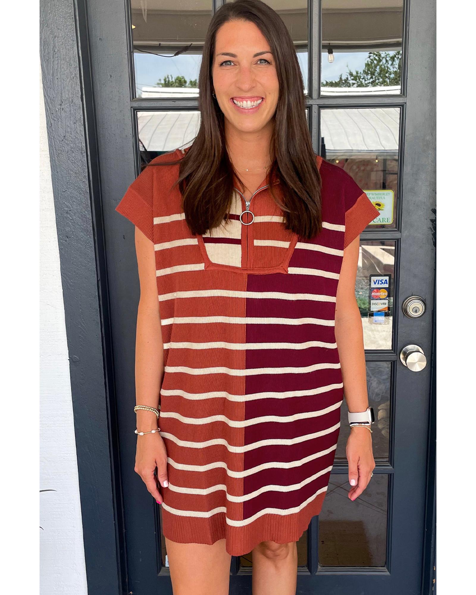Brown Stripe Color Block Quarter Zip Collar Short Sleeve Sweater Dress – L