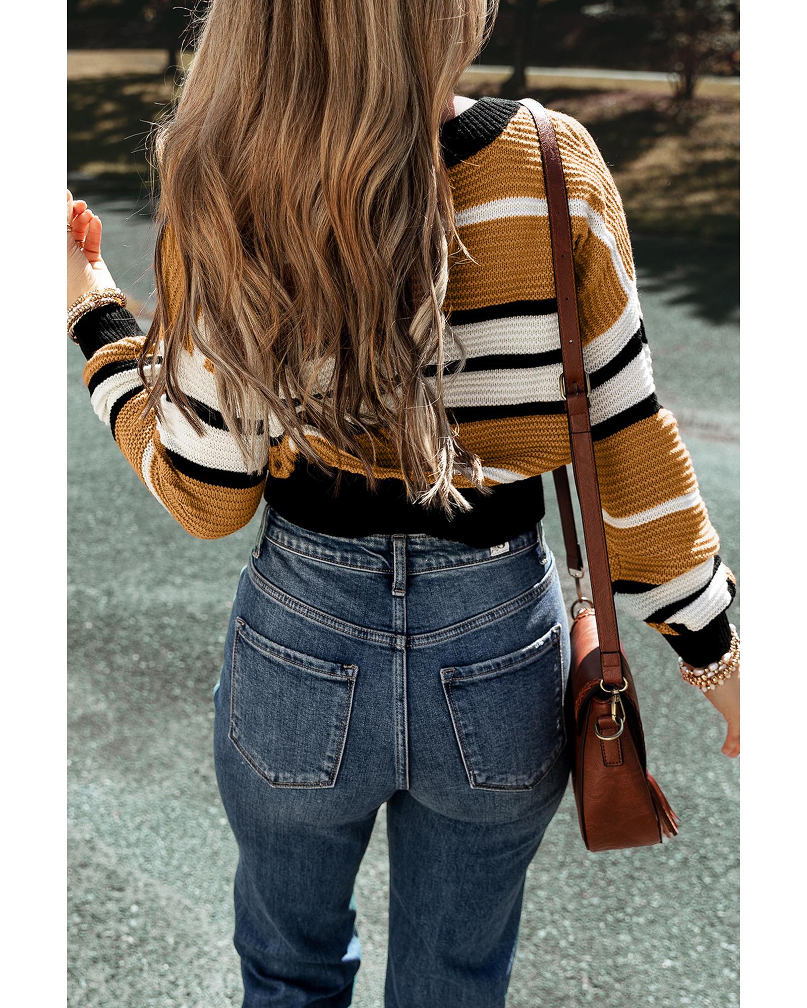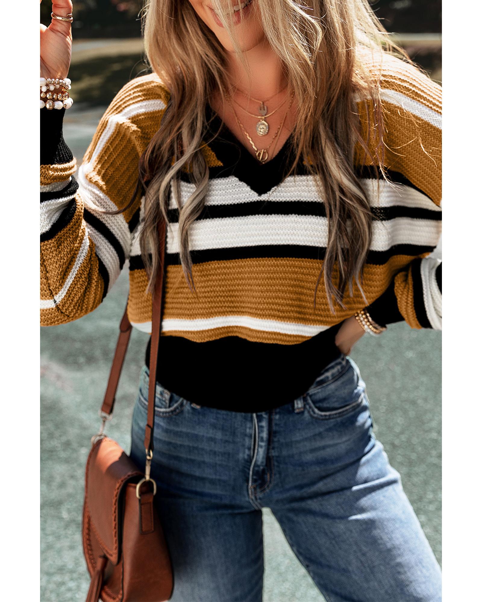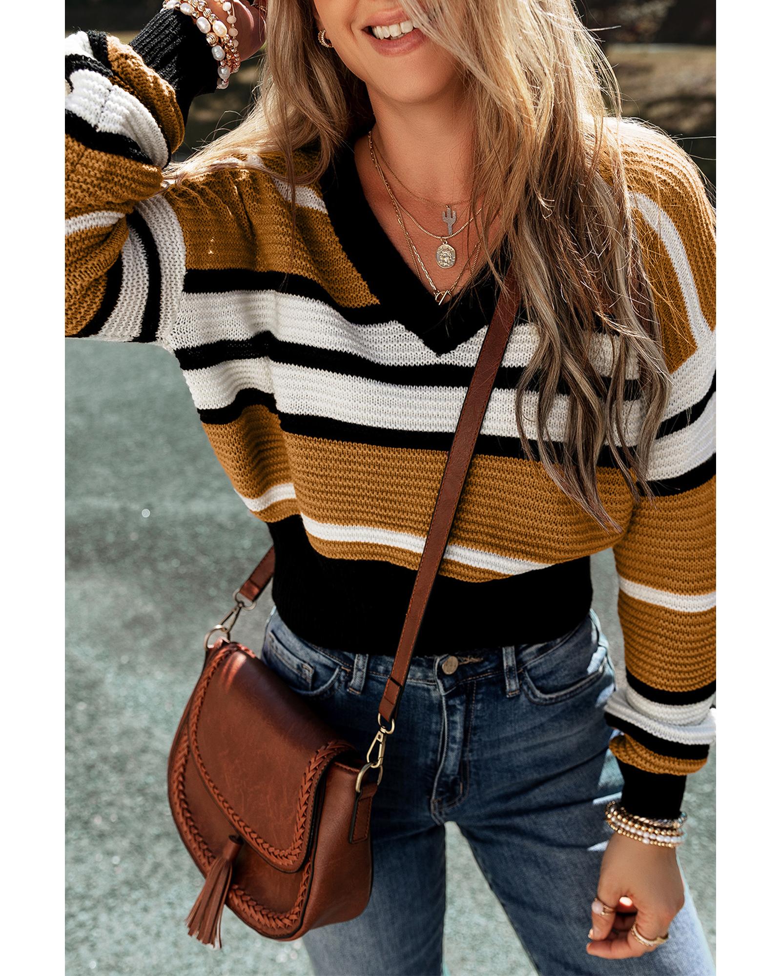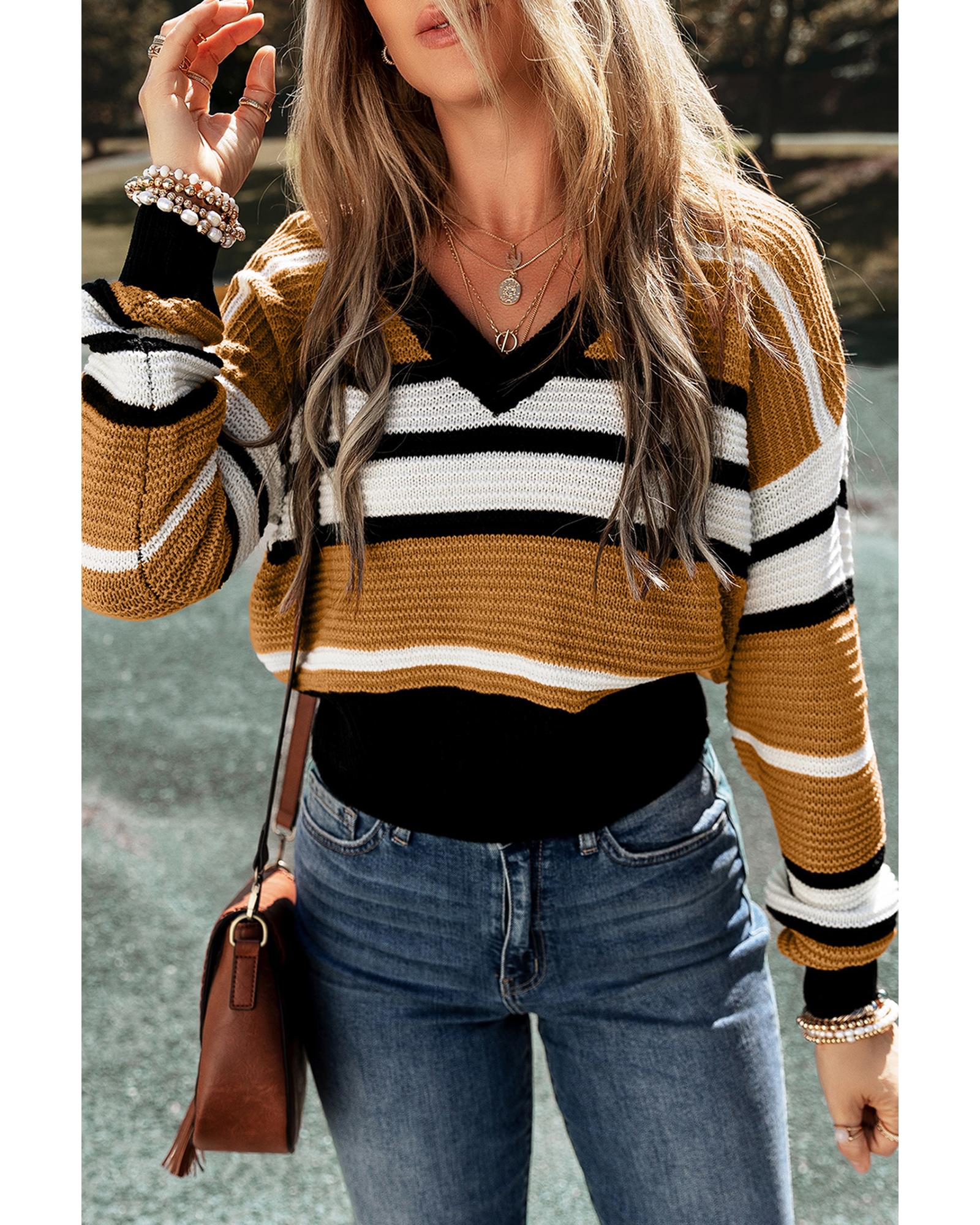 - Brown Stripe Contrast Stripes V Neck Textured Knit Sweater for women