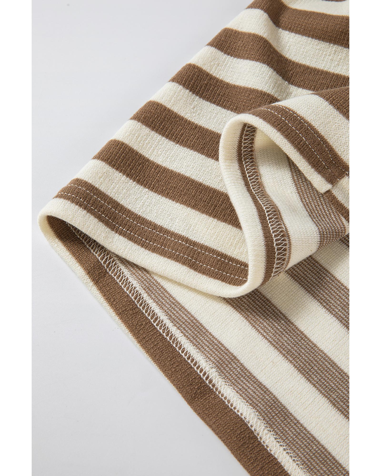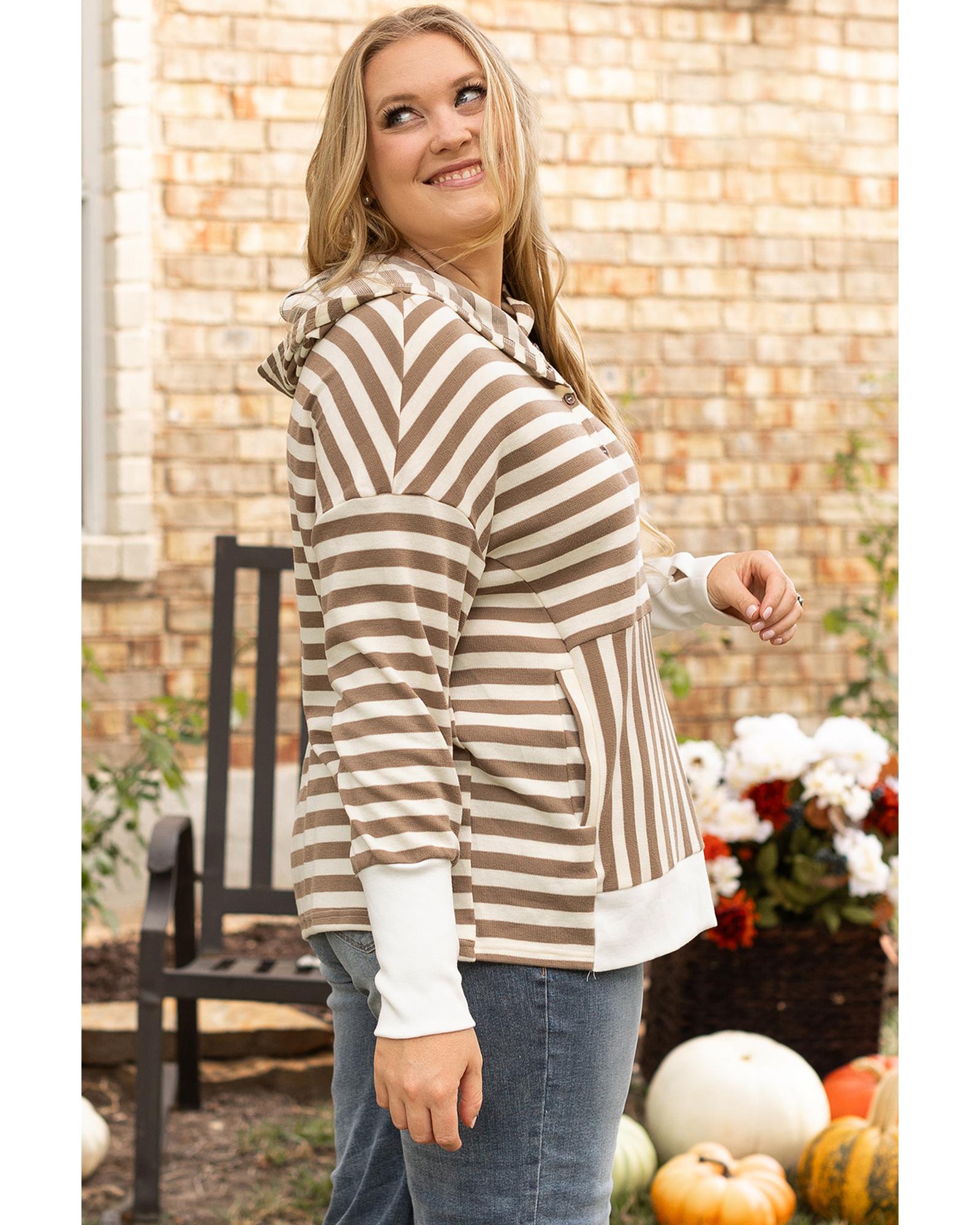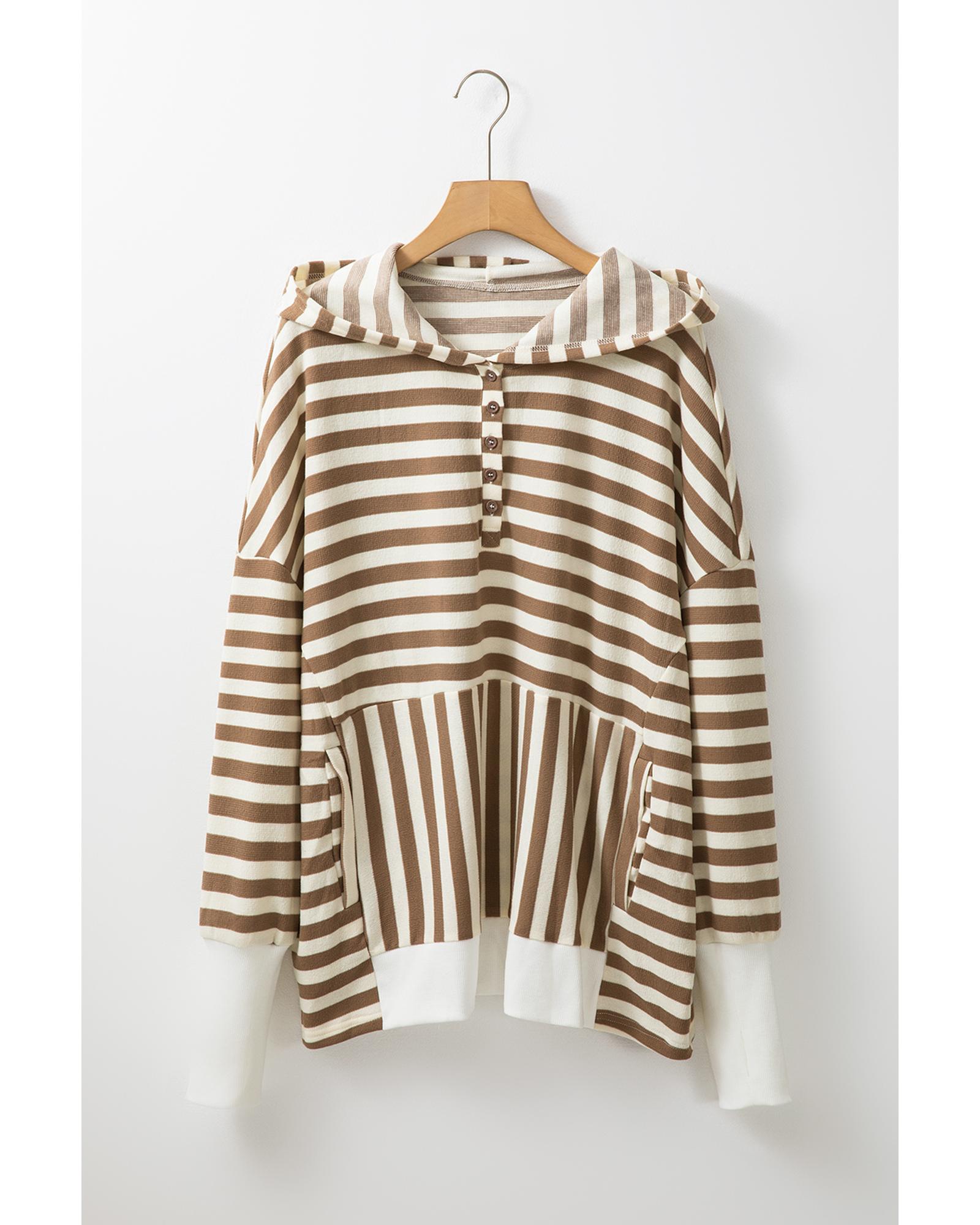 Brown Stripe Quarter Buttons Drop Sleeve Plus Size Hoodie – 3X