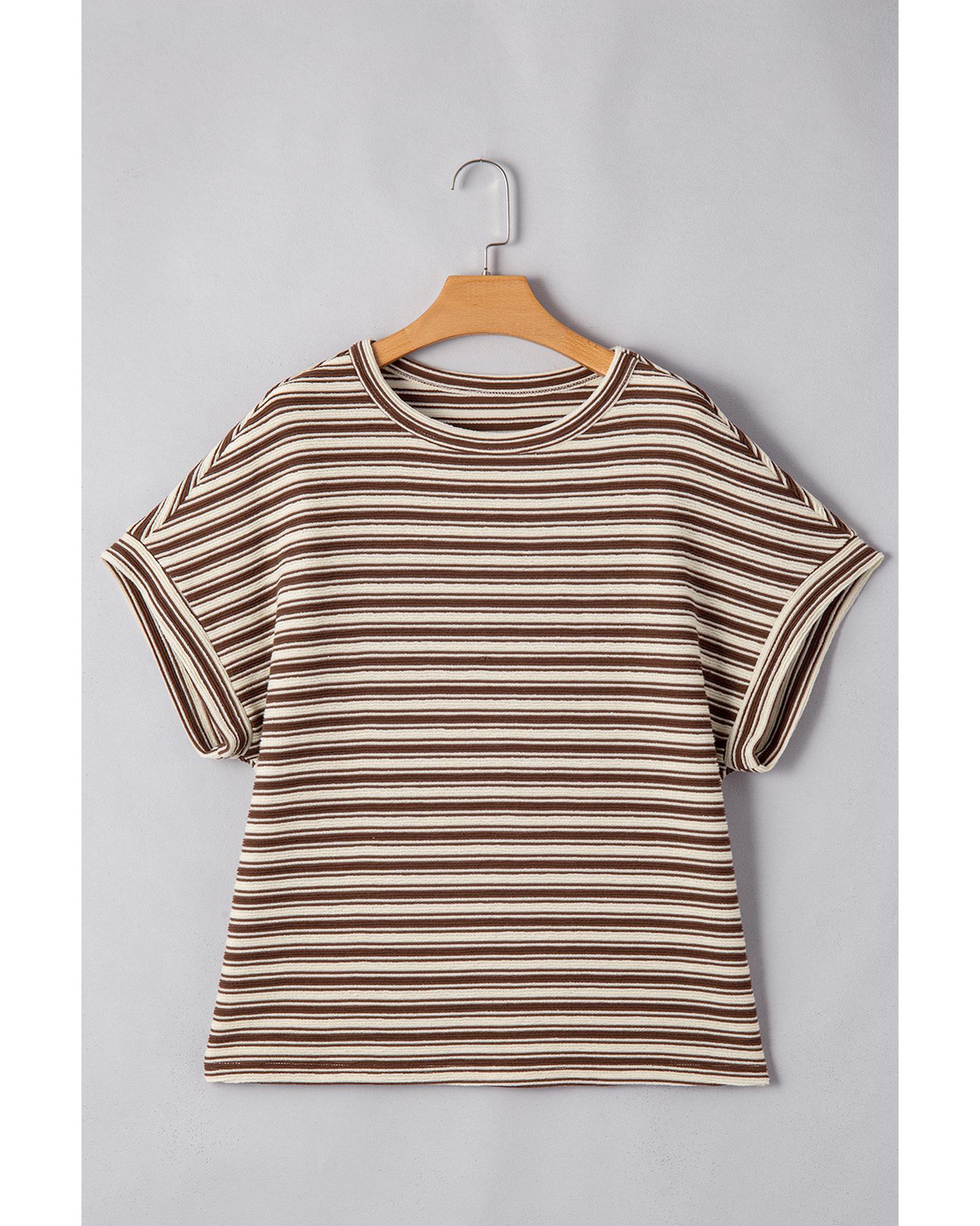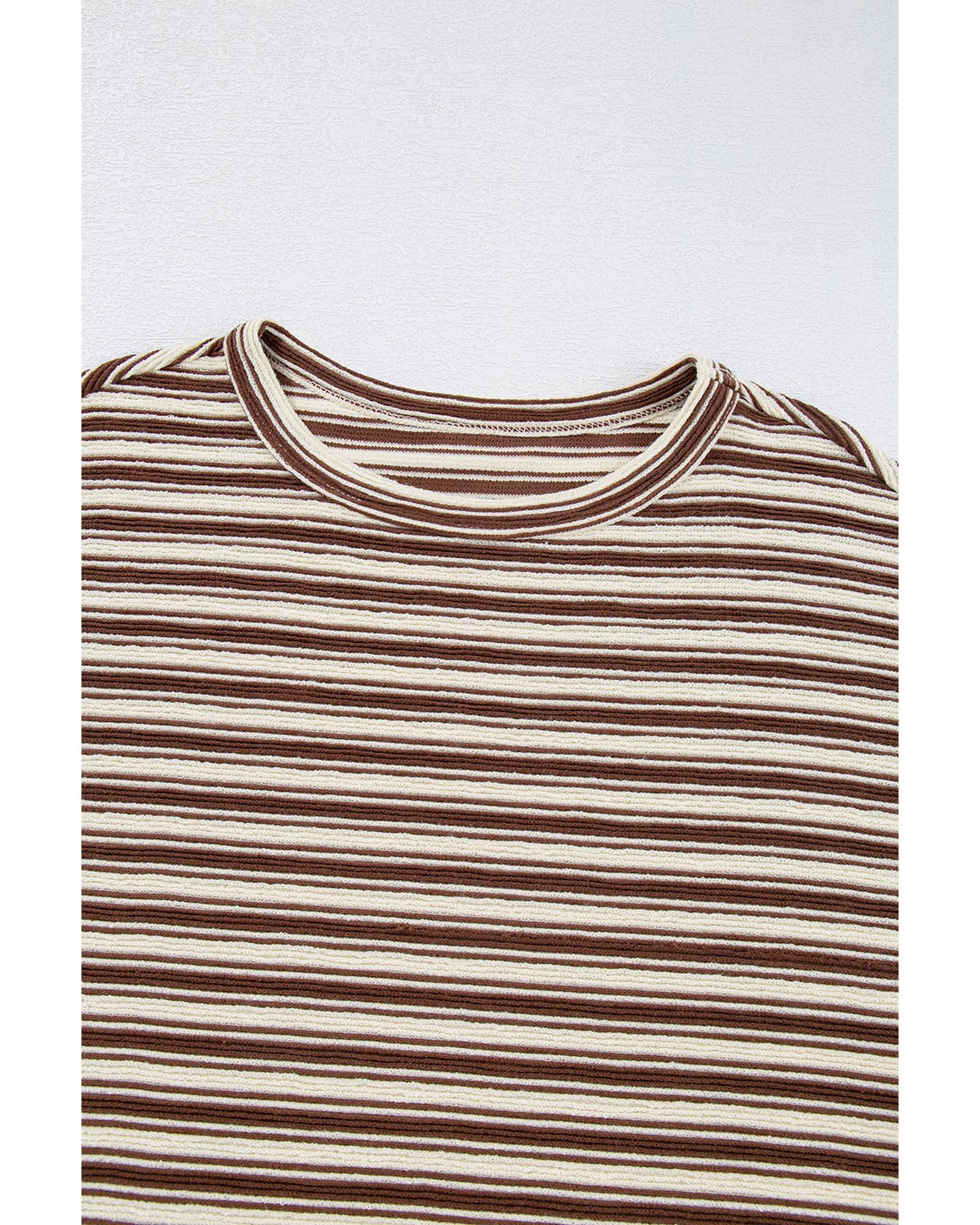 Brown Stripe Textured Side Slits Crew Neck T Shirt – S