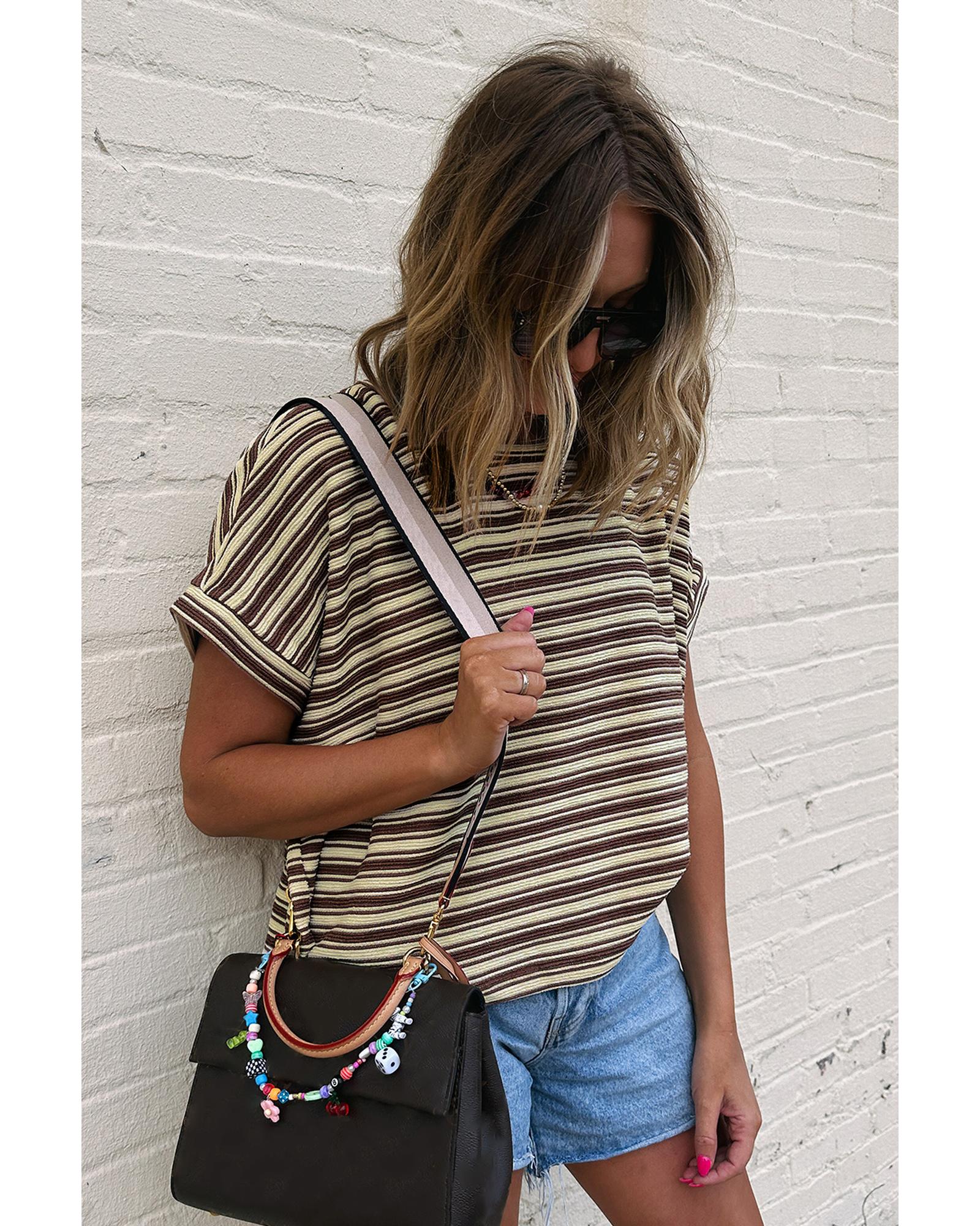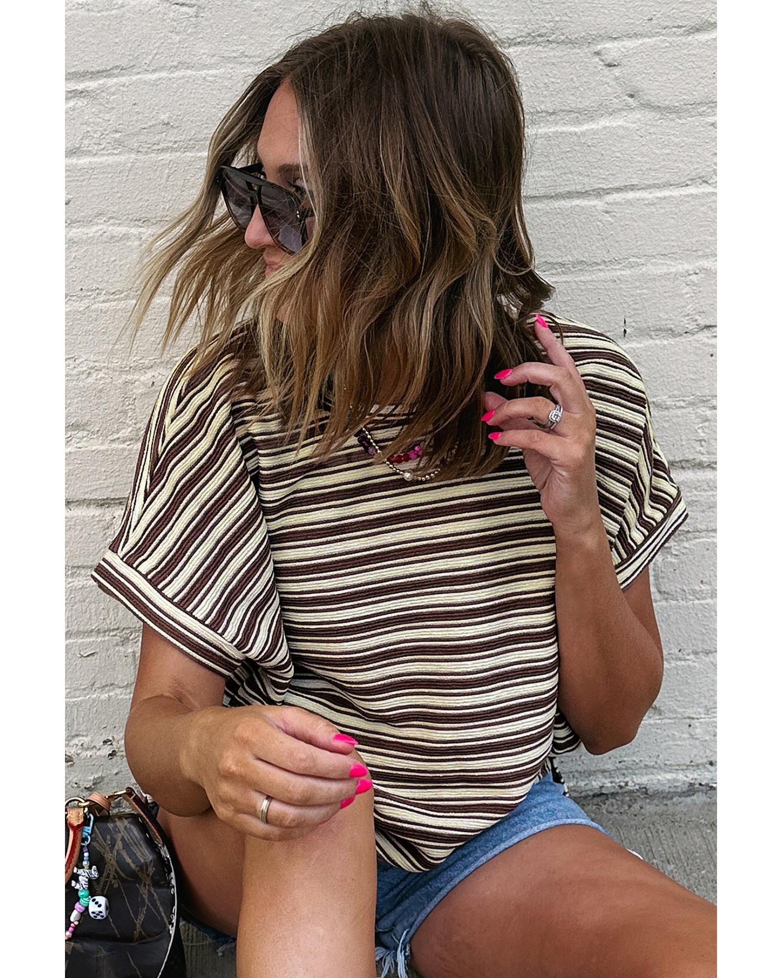 Brown Stripe Textured Side Slits Crew Neck T Shirt – XL