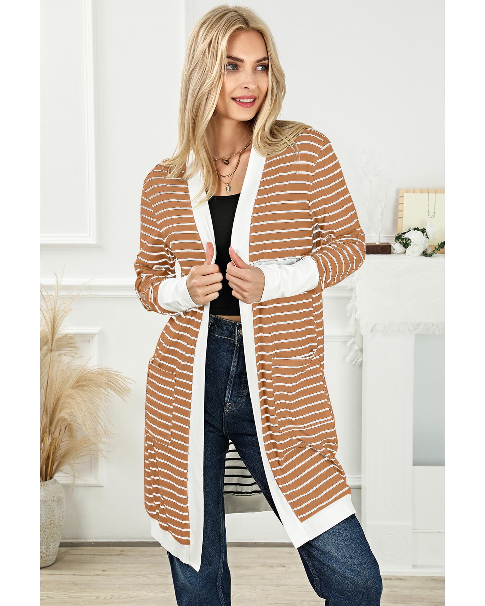 • Elevate your wardrobe with this versatile Brown Striped Side Pockets Open Front Cardigann