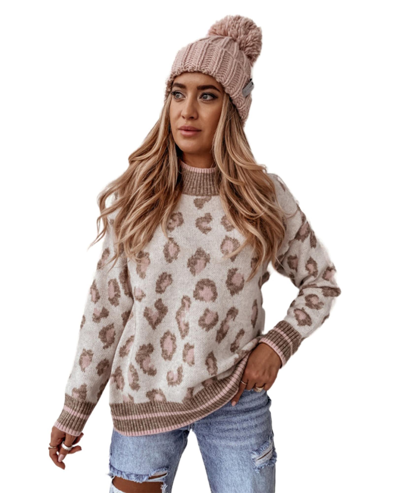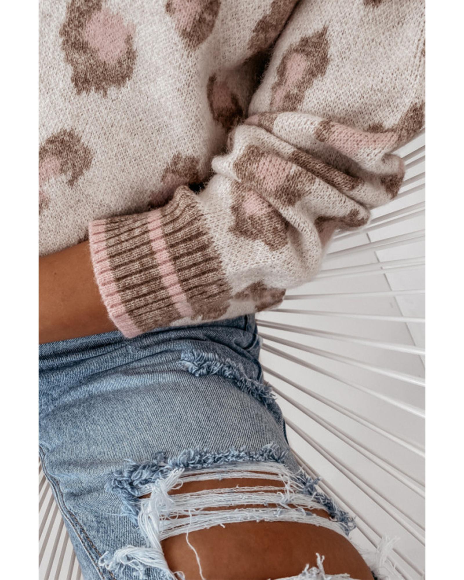 Brown Two-tone Ribbed Trim Contrast Leopard Sweater – M