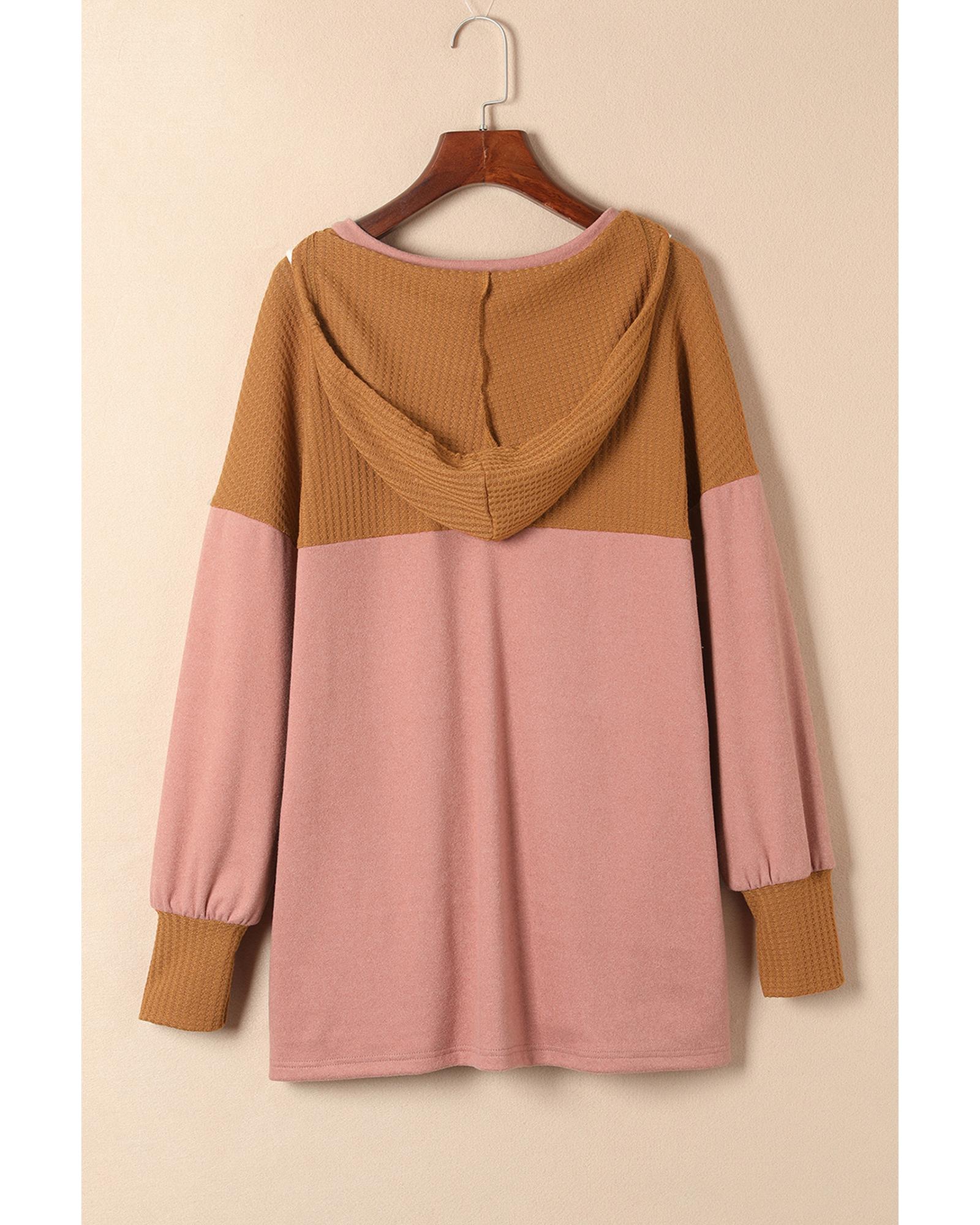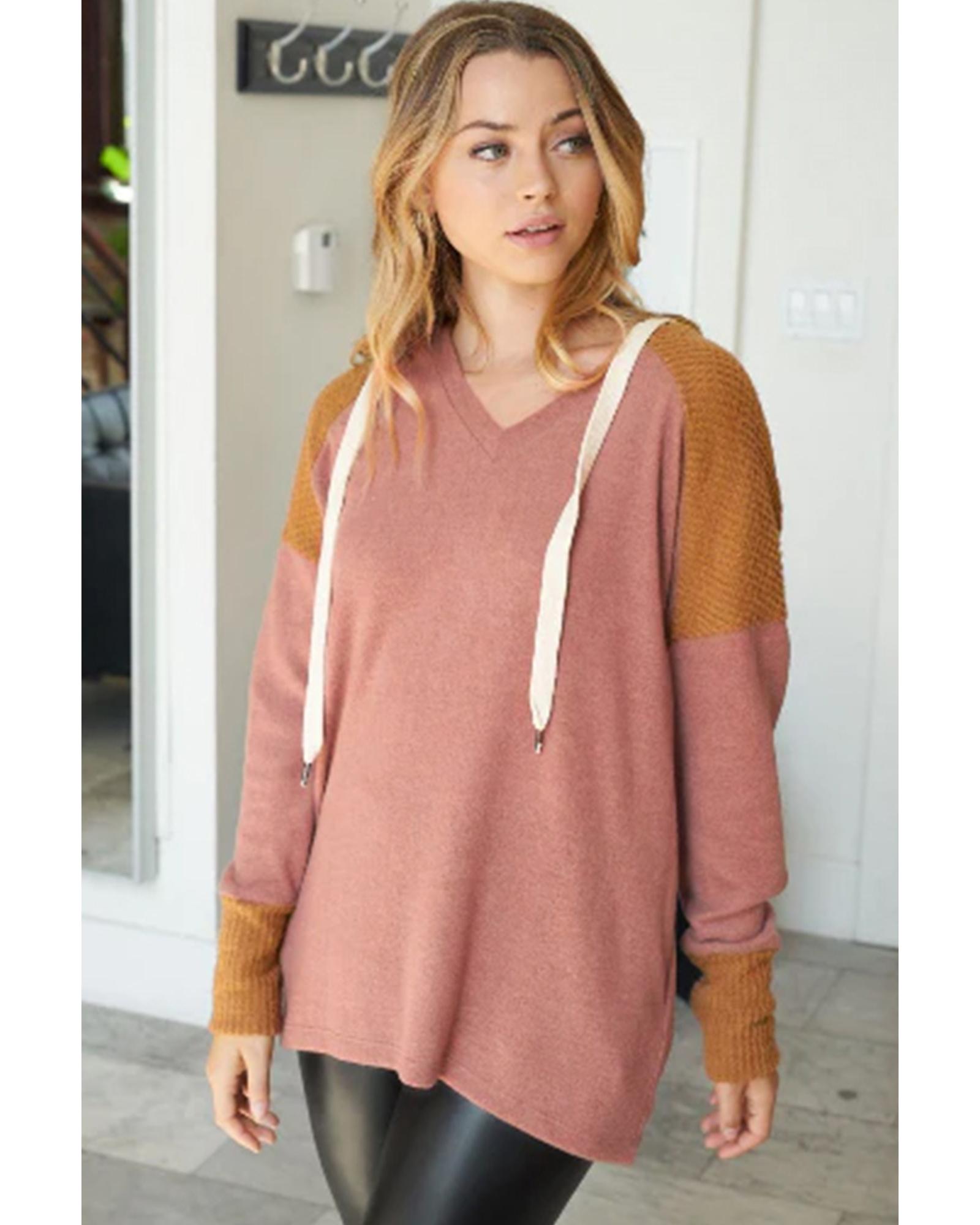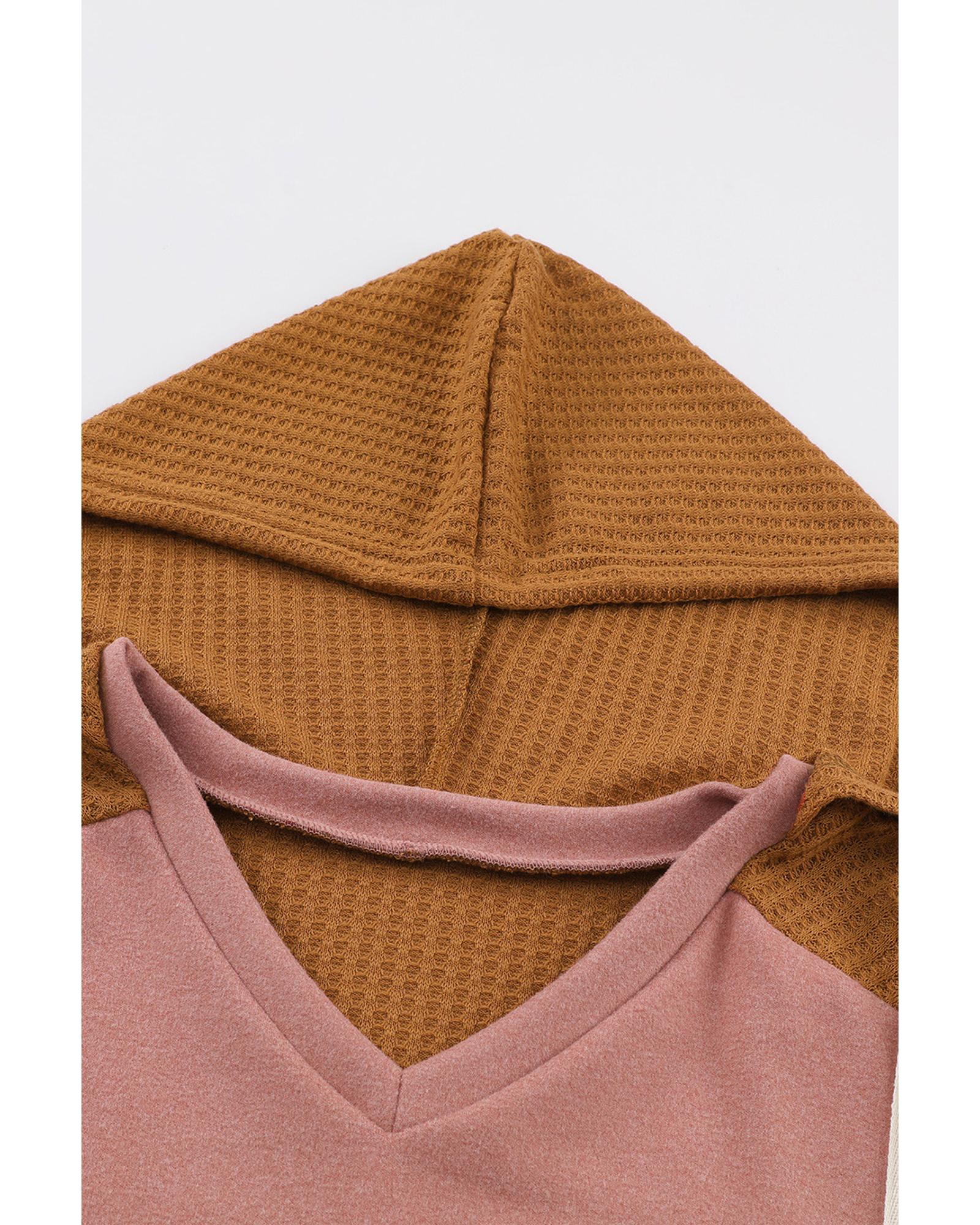 Brown Waffle Knit Patchwork Drawstring V Neck Hoodie – XL