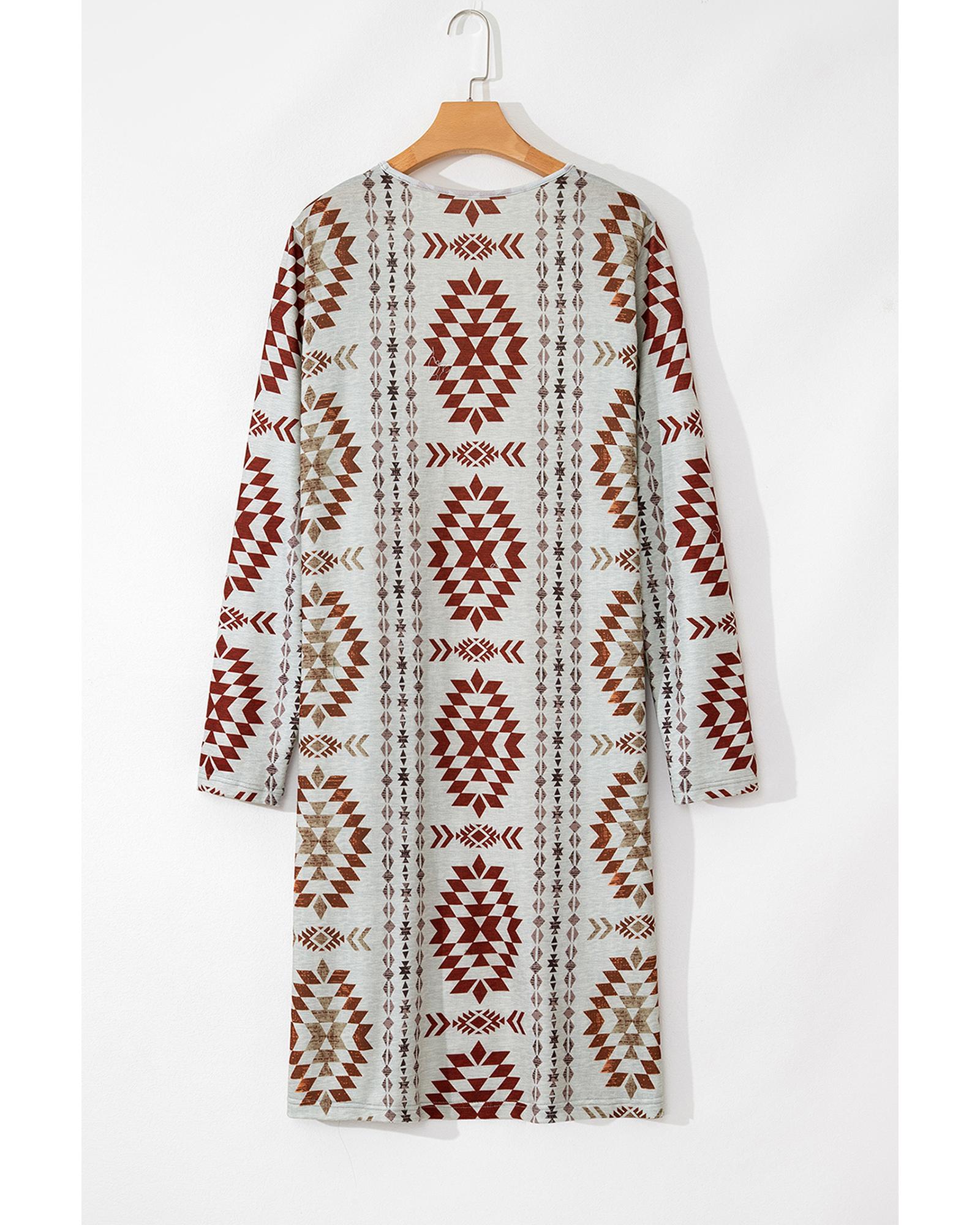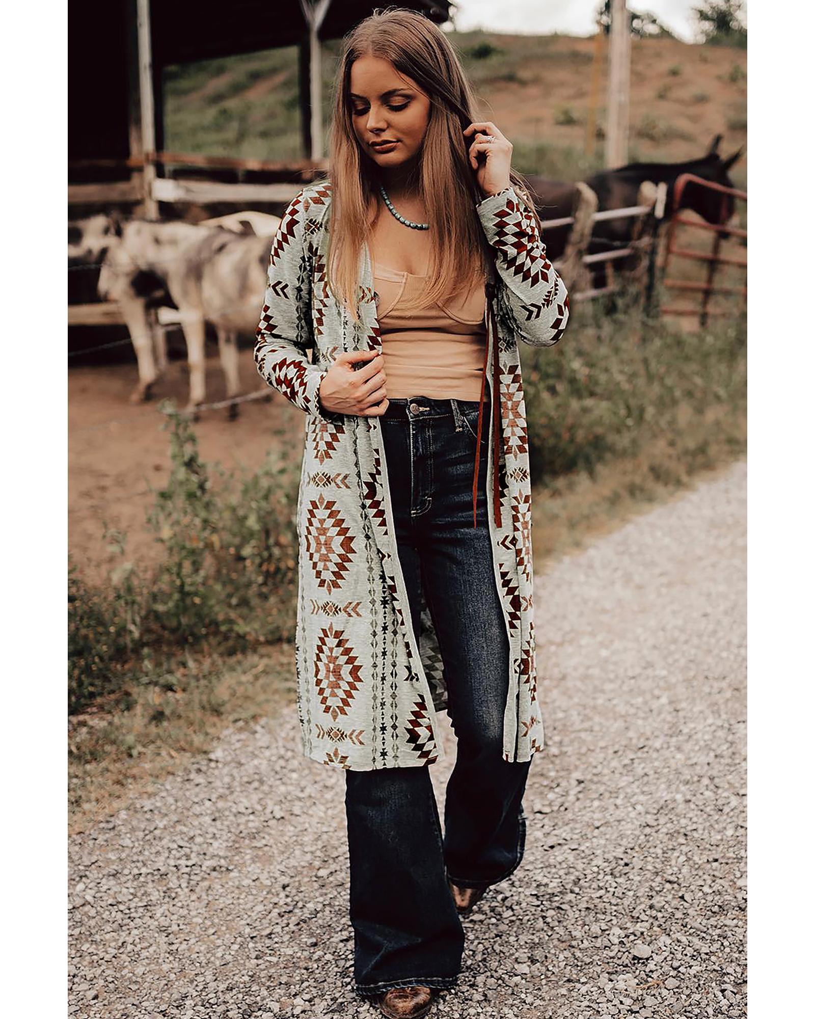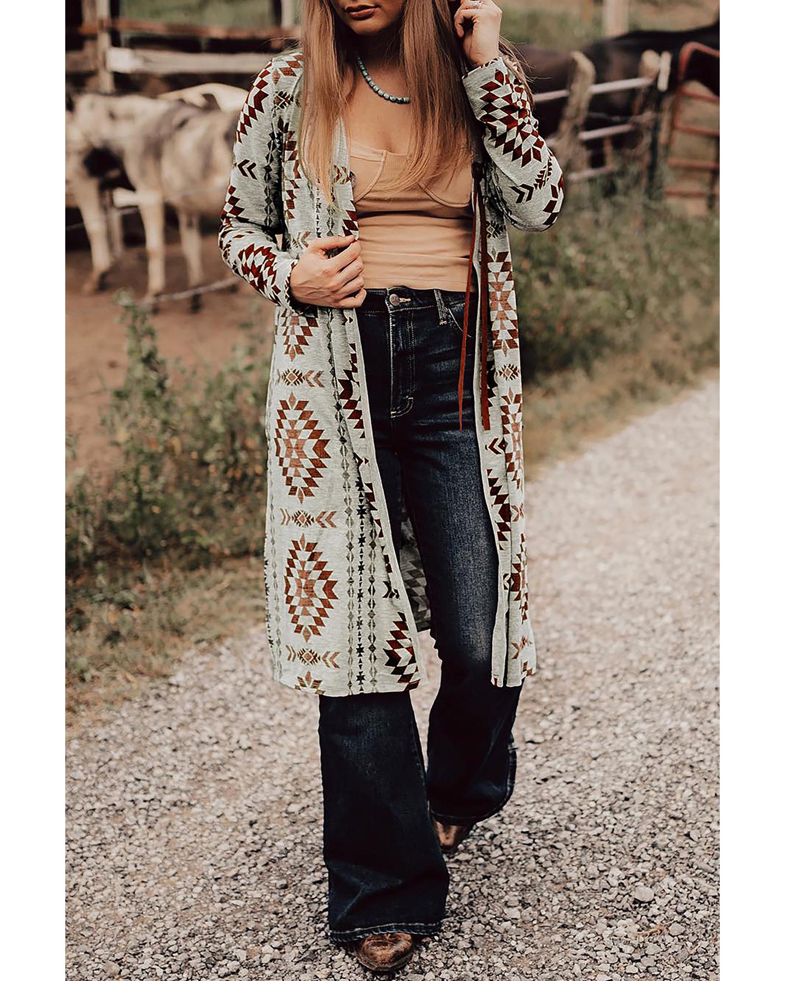 Brown Western Aztec Printed Open Front Long Cardigan – M