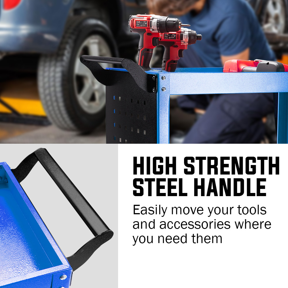 Bullet 3-Tier Steel Tool Trolley Cart, for Workshop, Mechanic, with Pegboard, Screwdriver Bay, Blue