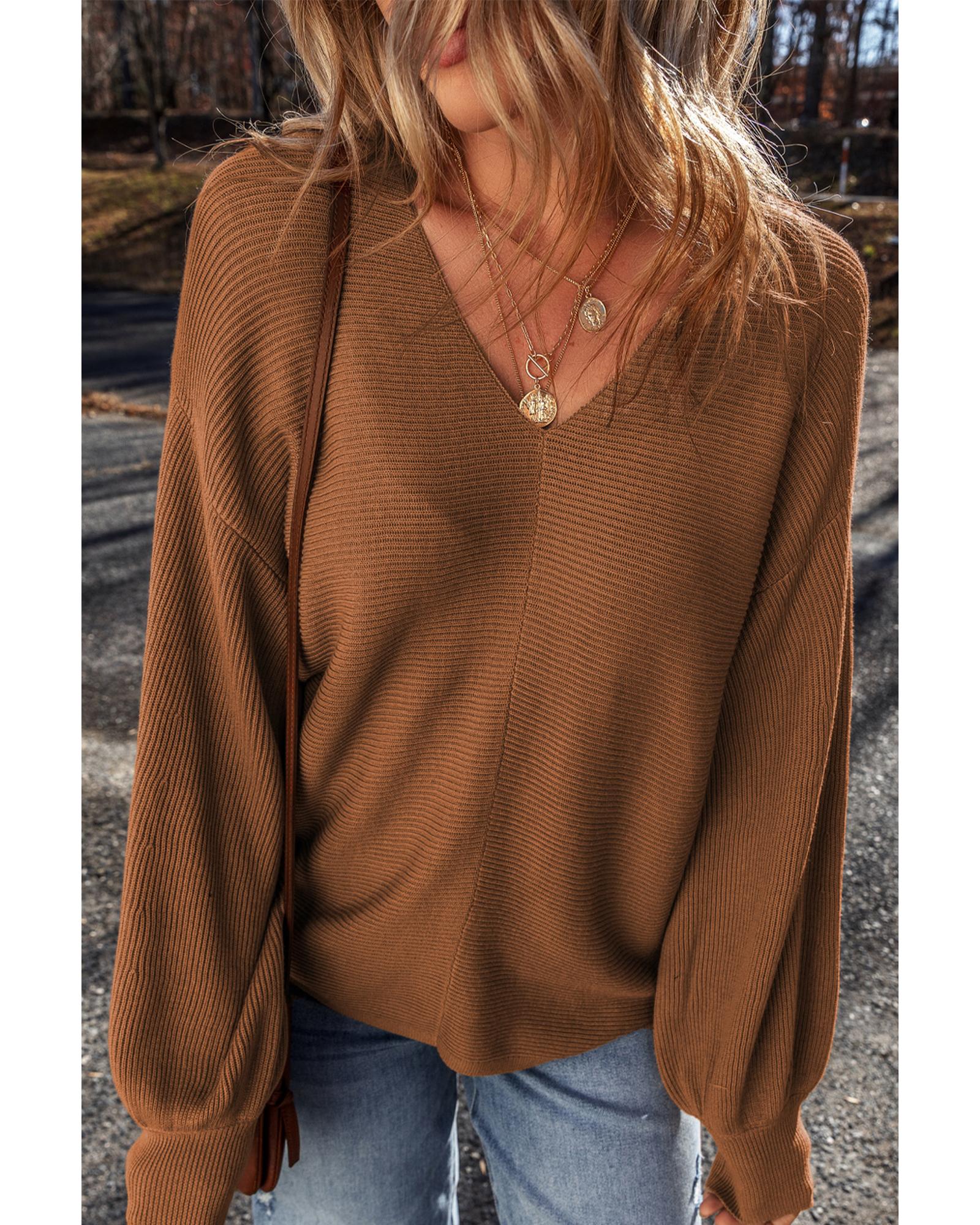 Camel Ribbed Knit Drop Sleeve V Neck Loose Fit Sweater – L