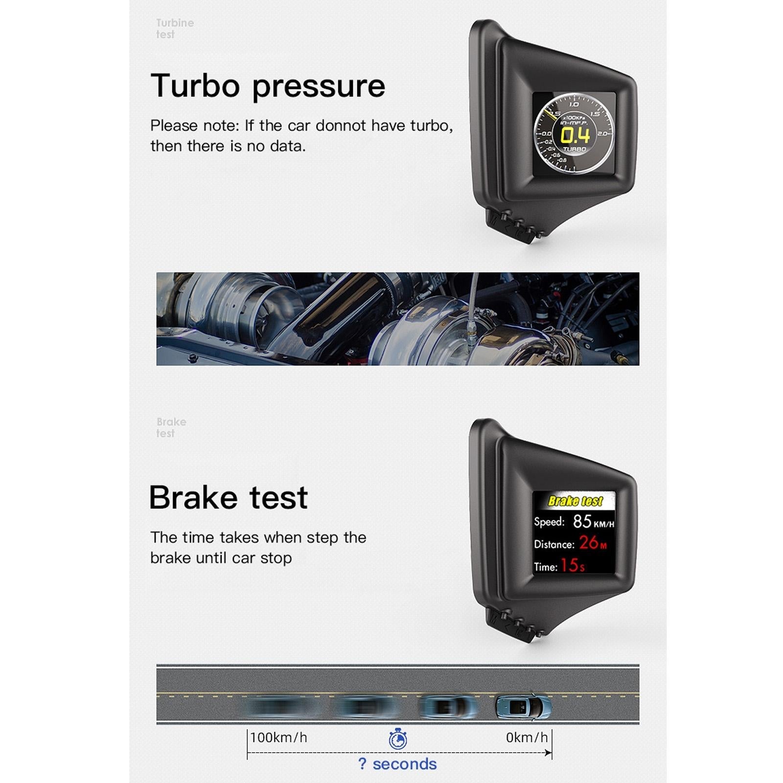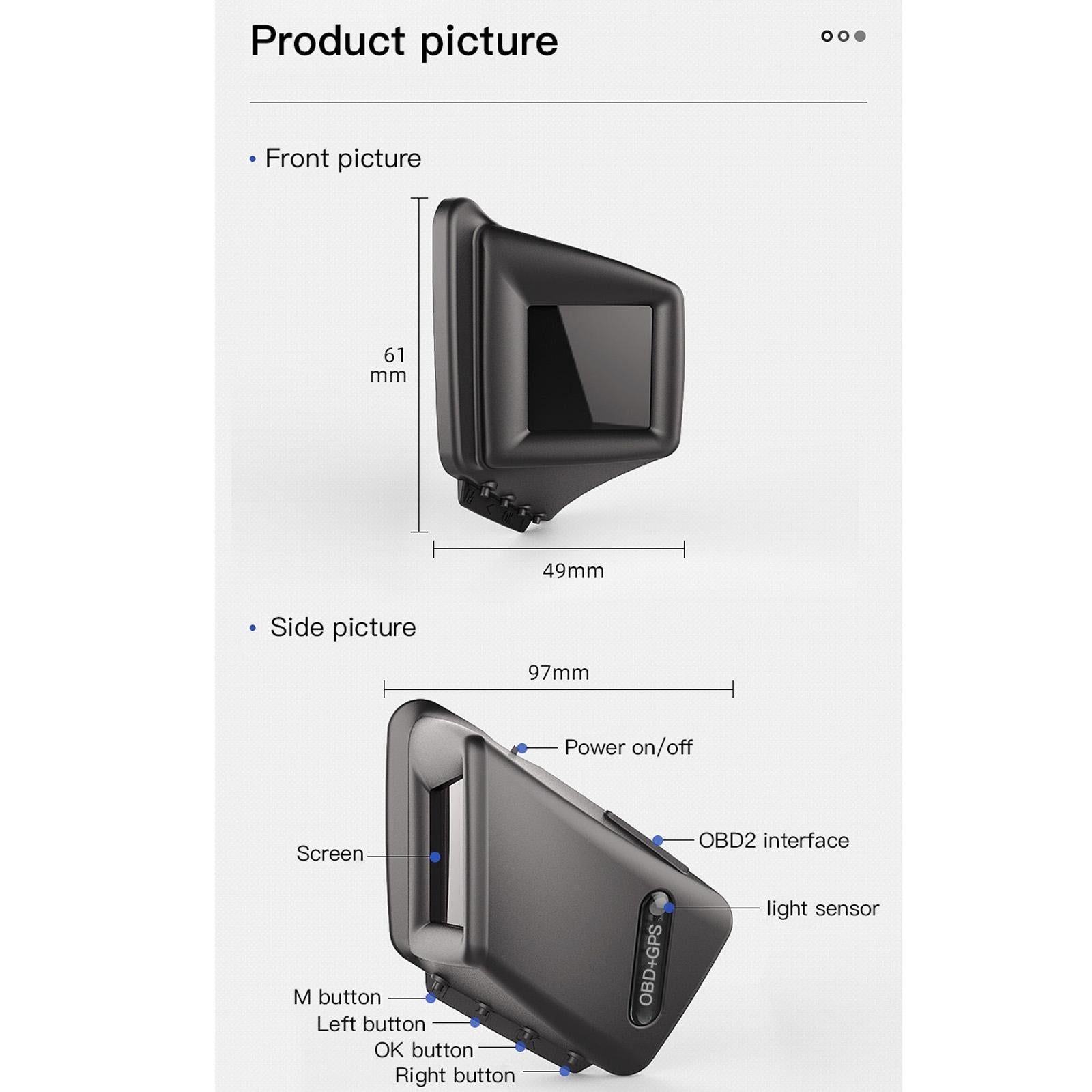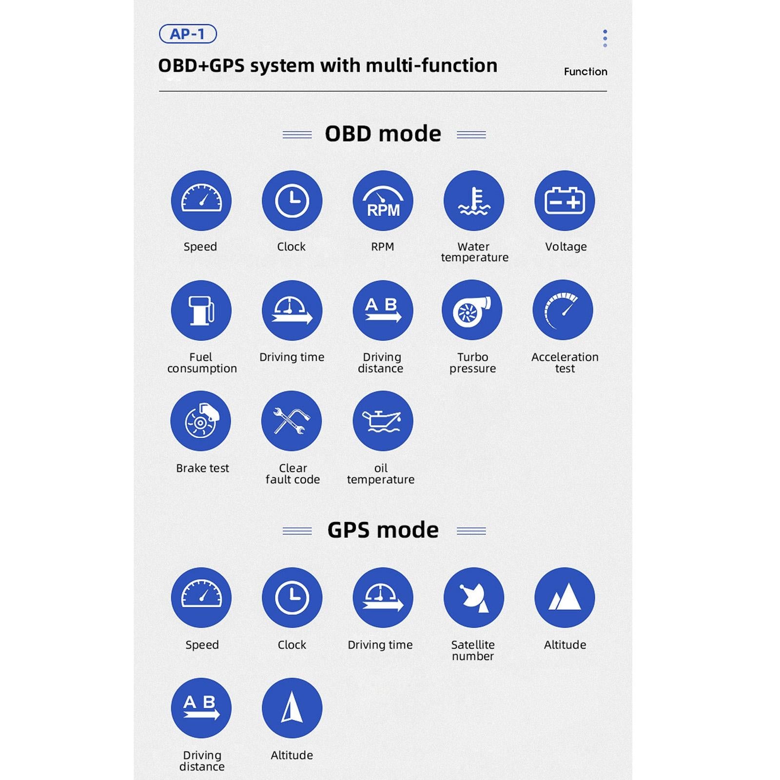 • OBD2 mode: speed, rotation speed, water temperature, voltage, fuel consumption, clock, single travel distance, single travel time, oil temperature, turbine pressure, acceleration test, brake test, overspeed alarm, engine failure alarm, fault code elimination, water temperature alarm, speed alarm, voltage alarm, mile switch, fatigue driving reminder, automatic and manual brightness adjustment