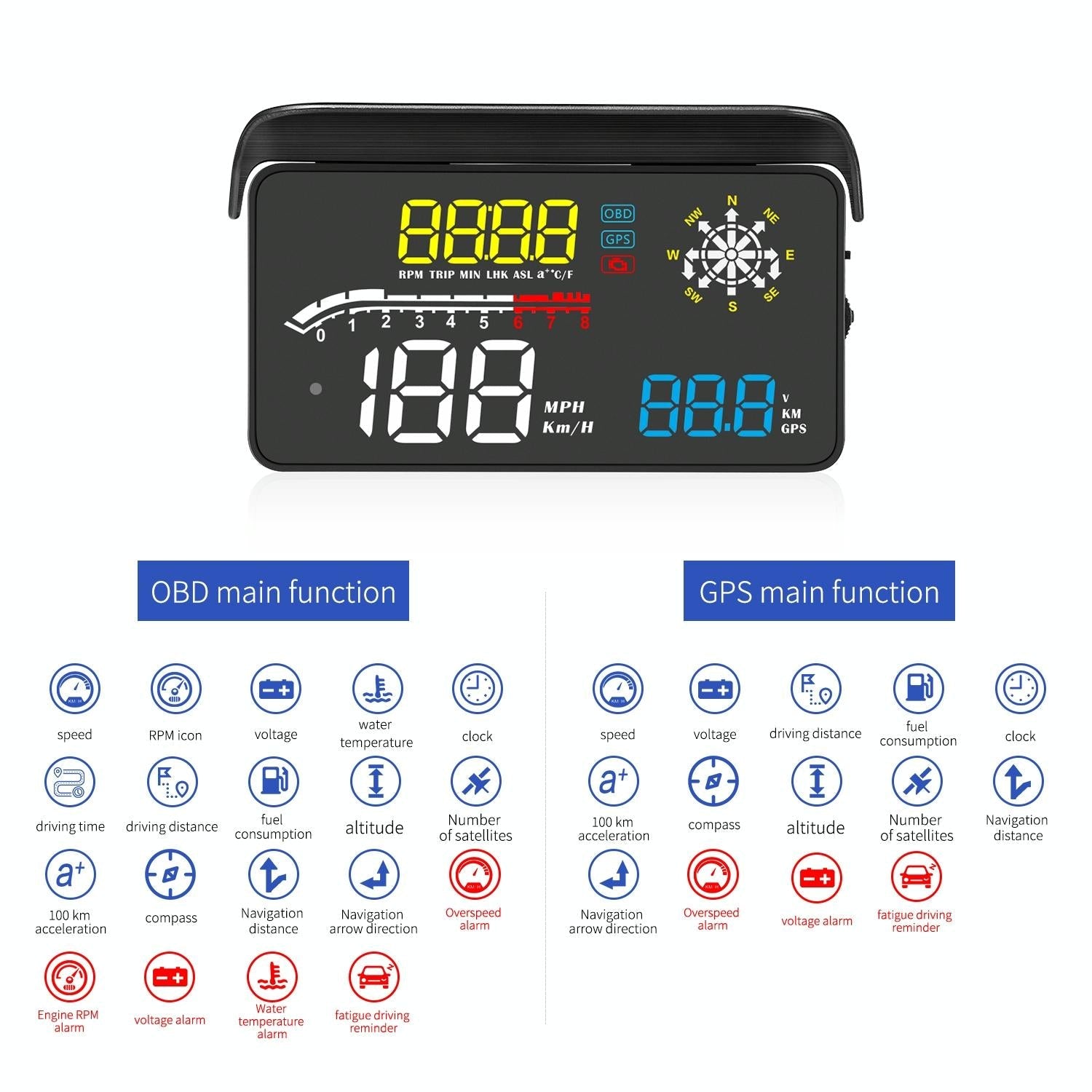 • OBD mode displays vehicle speed, rotation speed, fuel consumption, water temperature, voltage, clock, driving distance, driving direction, altitude, number of satellites, speed icon, and more