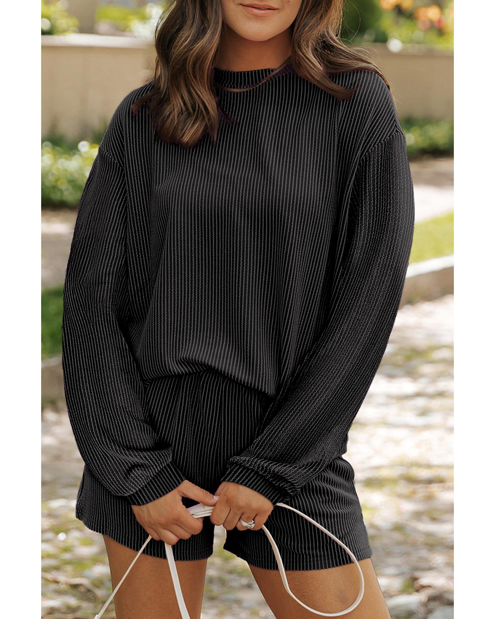 Carbon Grey Corded Knit Long Sleeve Top and High Waist Shorts Set Relaxed and comfortable fit for the long sleeve top Trendy and flattering high waist shorts Effortlessly chic with its loose silhouette Perfect for lounging or casual outings Available in various sizes Medium - high elasticity Refer to the size chart for accurate measurements