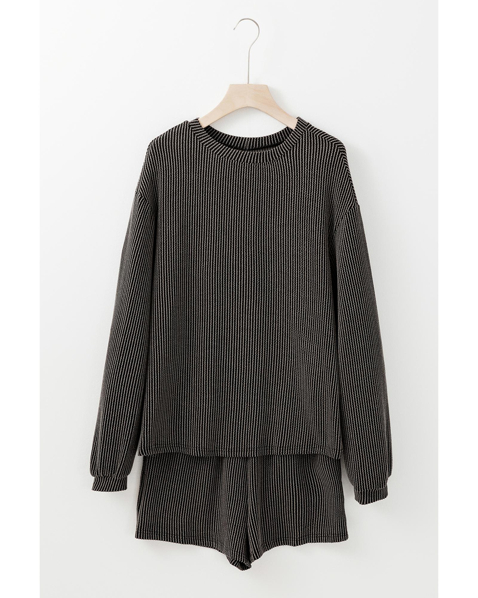 Carbon Grey Corded Knit Long Sleeve Top and High Waist Shorts Set – XL