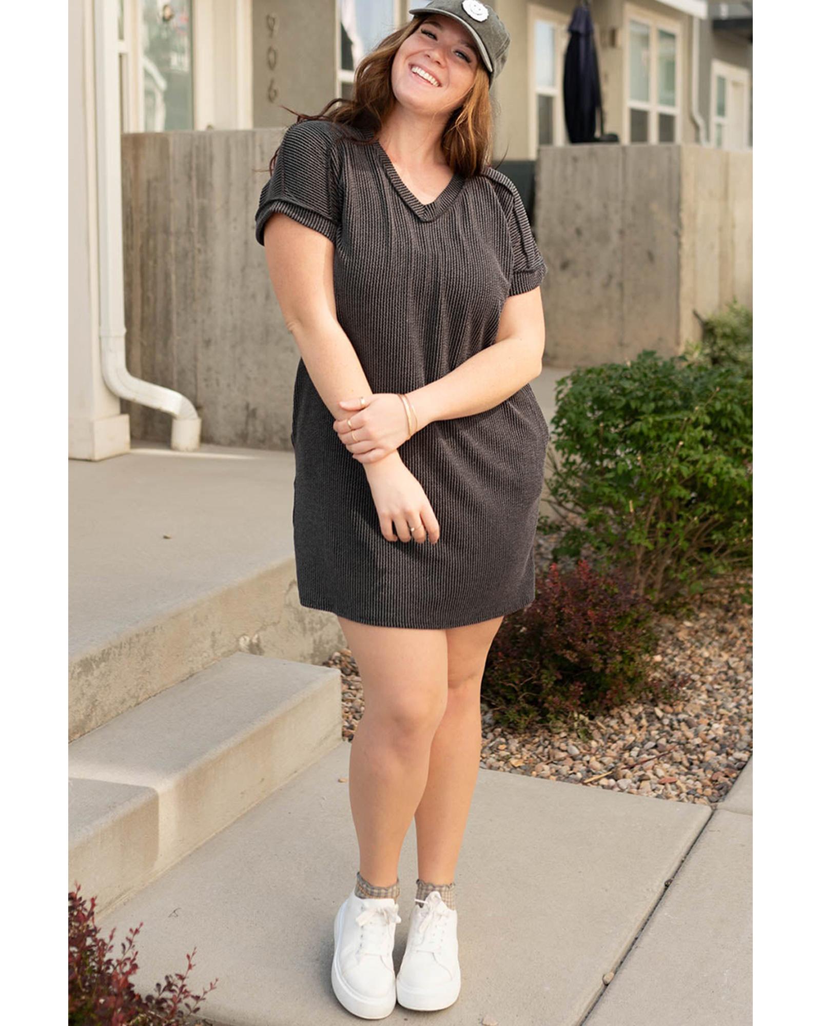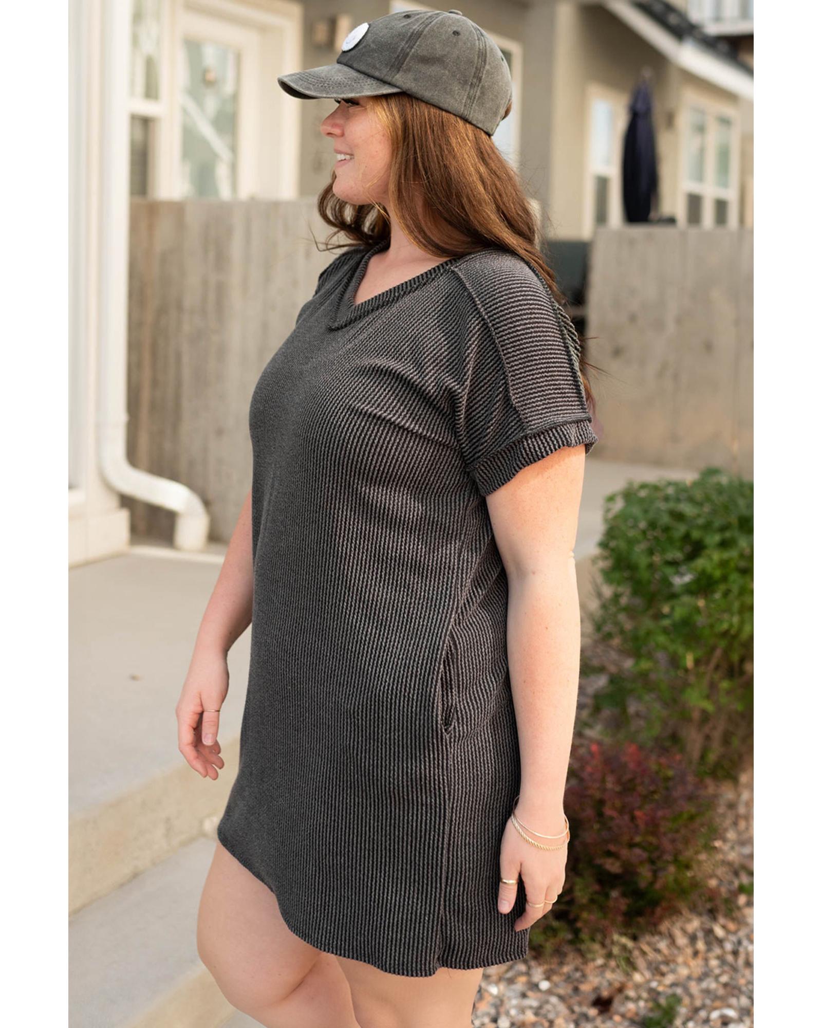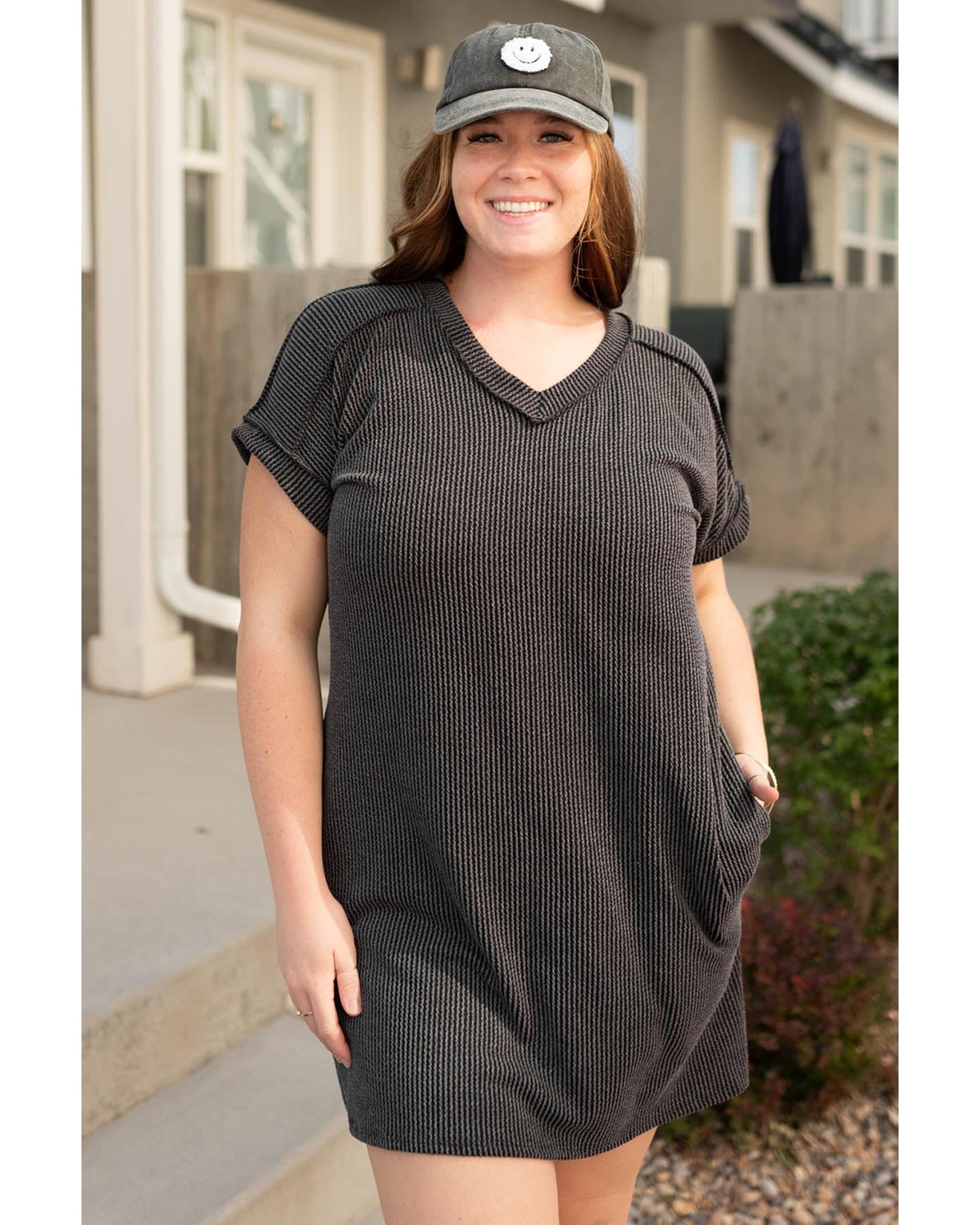 Carbon Grey Corded V Neck Plus Size T Shirt Dress with Pockets – 4X