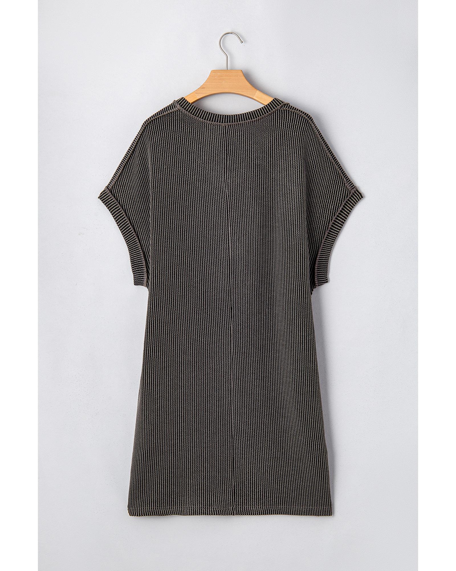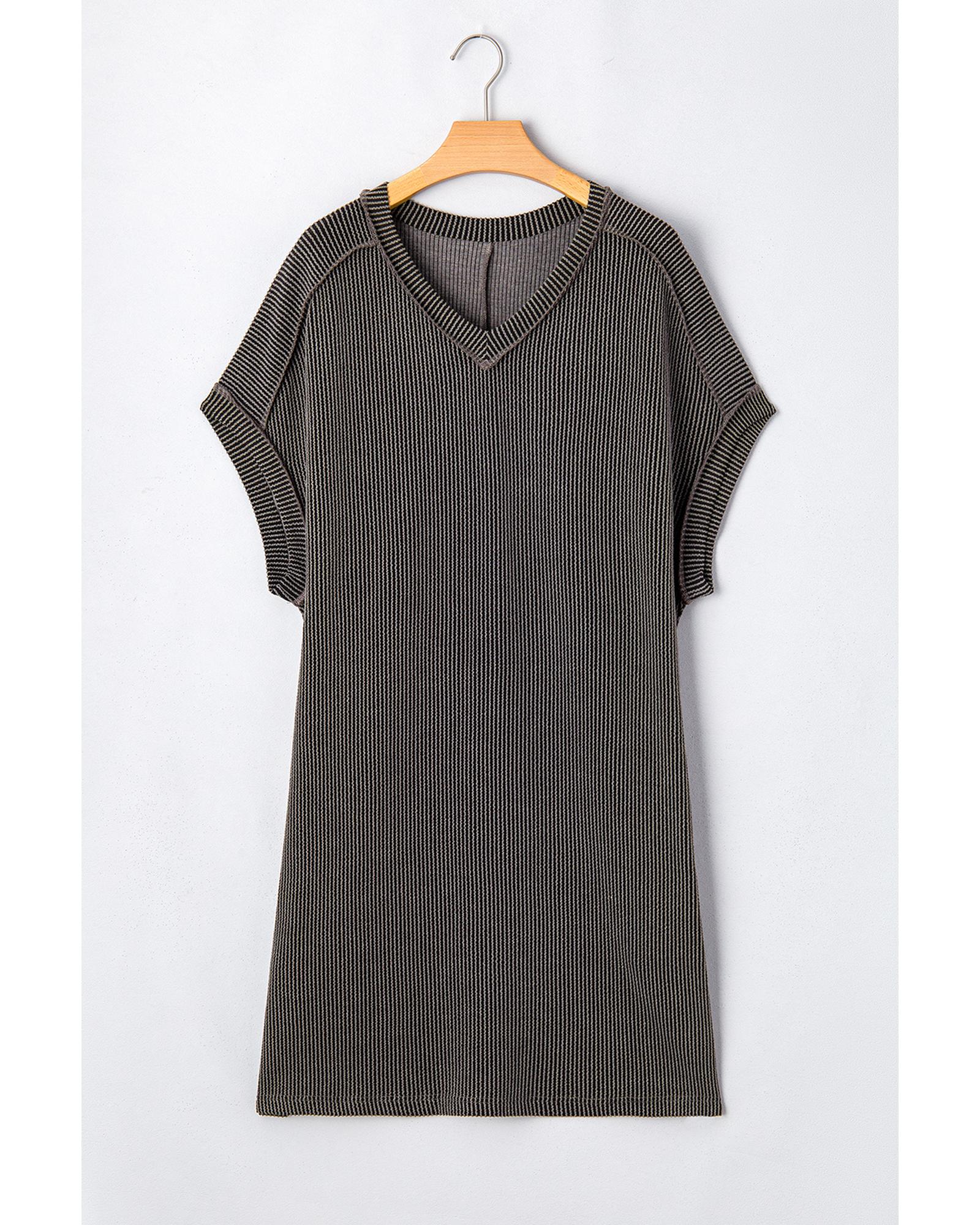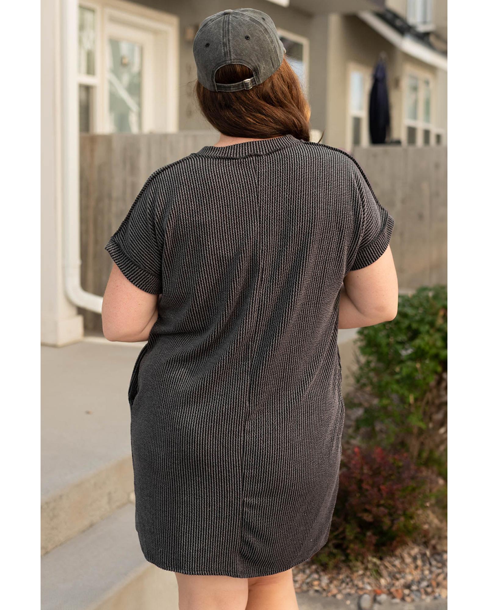 Carbon Grey Corded V Neck Plus Size T Shirt Dress with Pockets – 4X