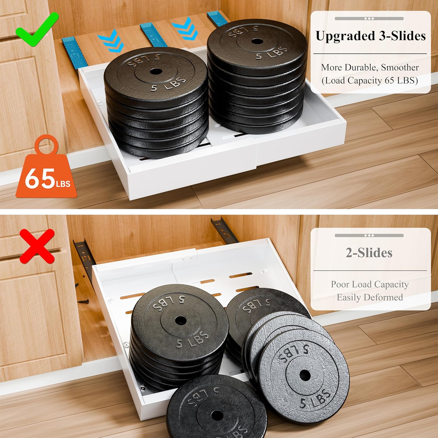 - HEAVY-DUTY BUILD & SMOOTH GLIDE: Crafted from premium carbon steel with a 3-rail damping slide system, these organizers handle up to 65 lbs per shelf. The drawers glide smoothly and quietly even under heavy pots, appliances, or pantry essentials.