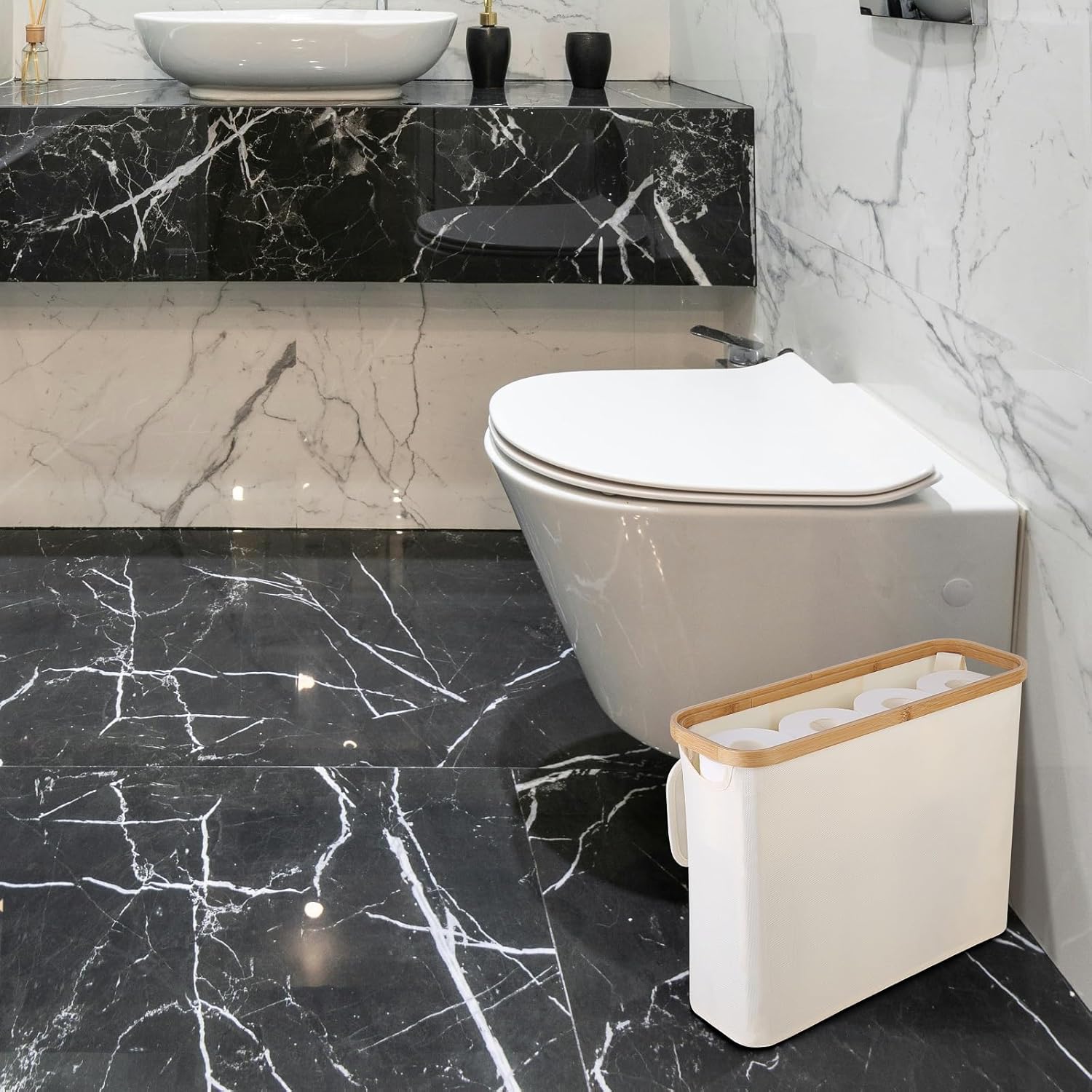 - BAMBOO LID & BUILT-IN HANDLES: A magnetic bamboo lid keeps contents concealed and protected from dust, while the integrated side handles allow for easy transport from room to room.