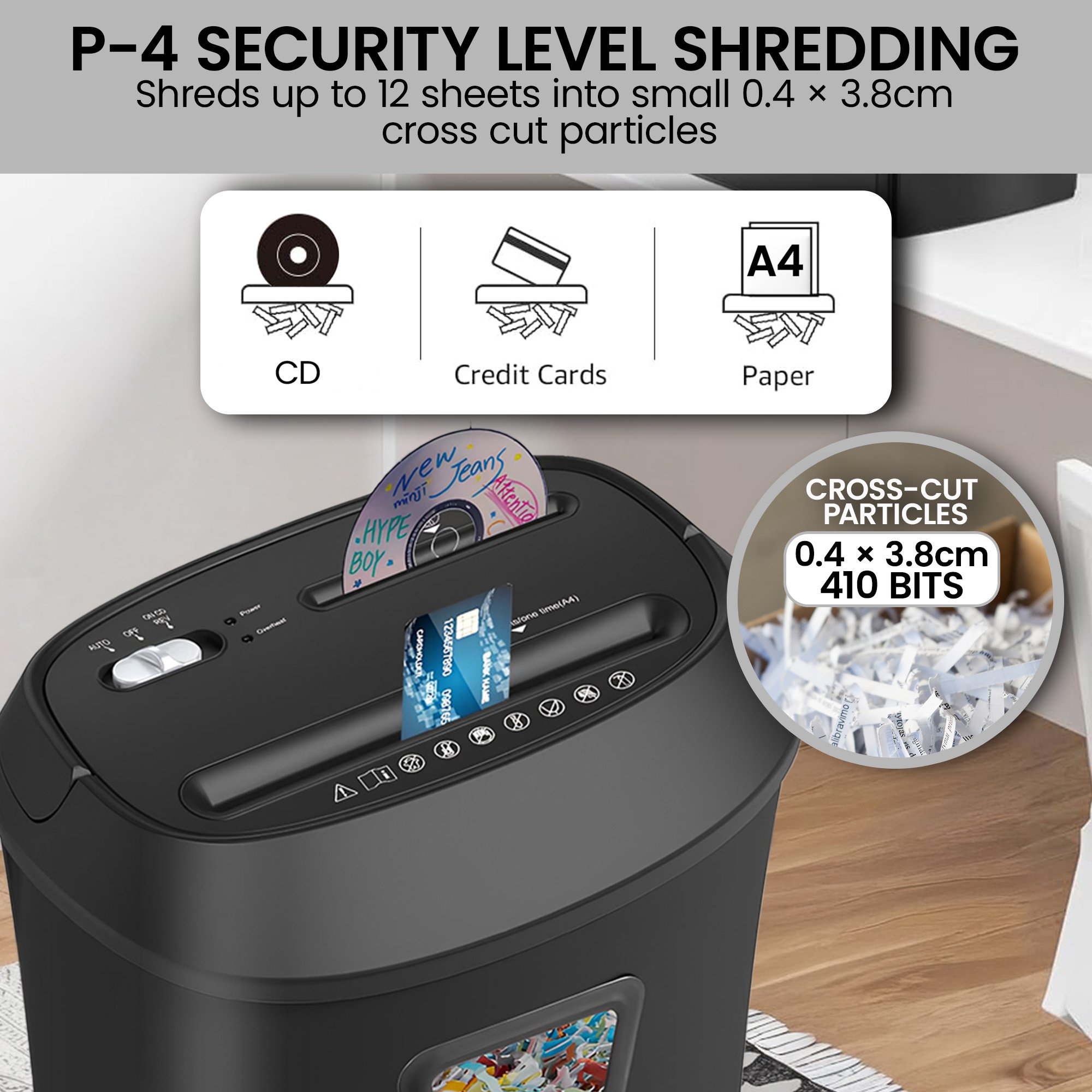 - Can shred up to 12 sheets (80GSM) per pass