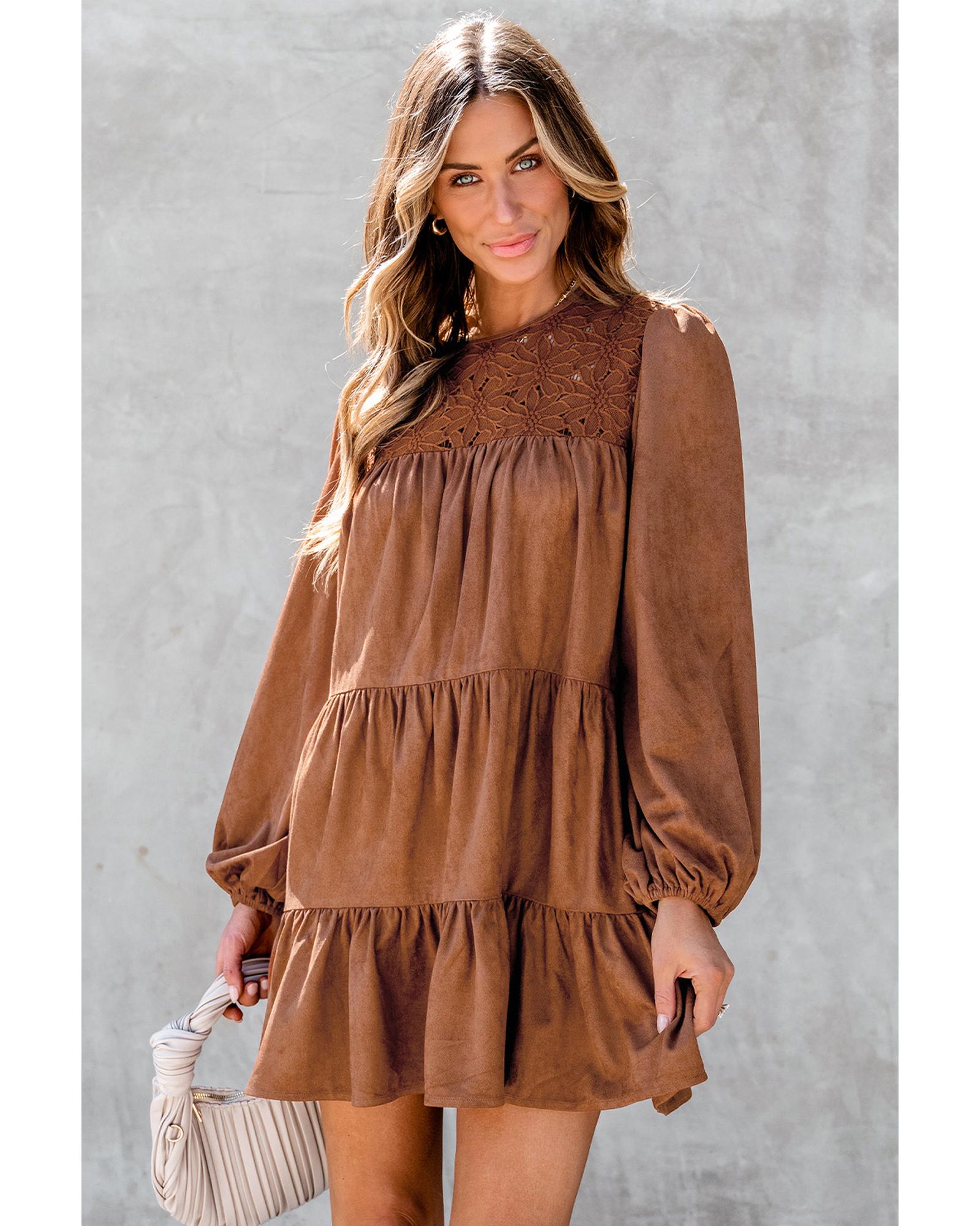 Chestnut Floral Lace Crochet Tiered Ruffled Mini Dress – S