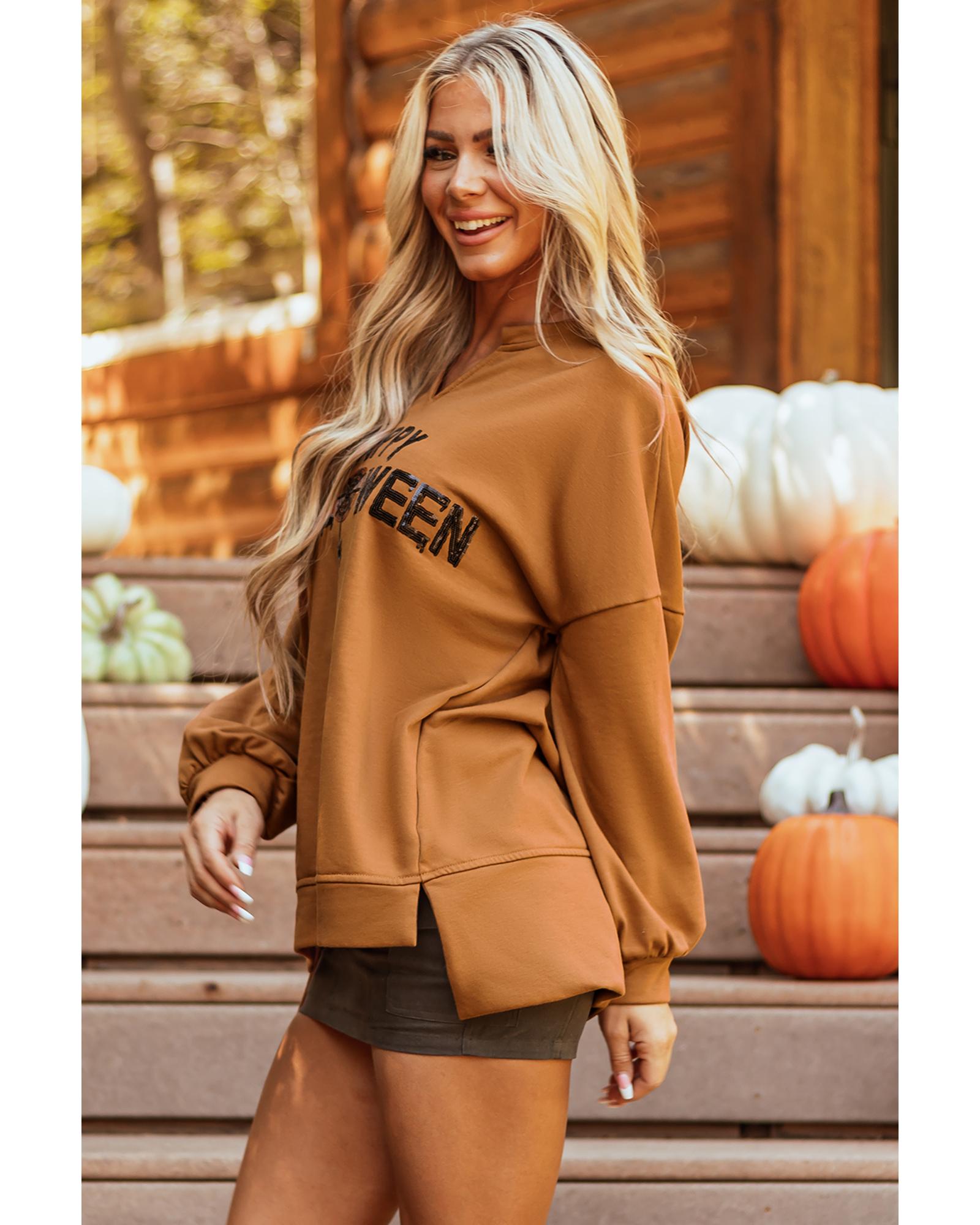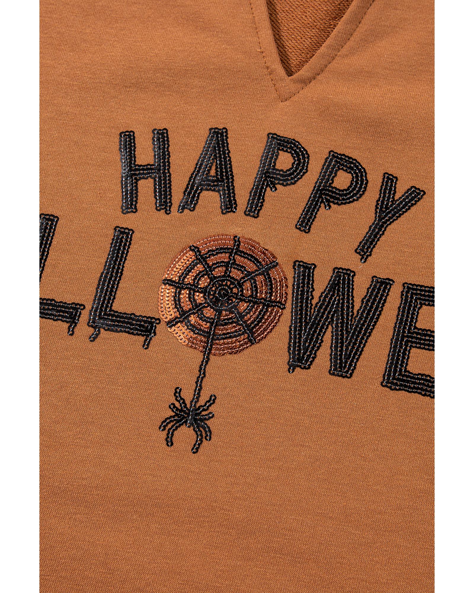 Chestnut Sequin Happy Halloween Graphic Notched Neck Long Sleeve Loose Top – L