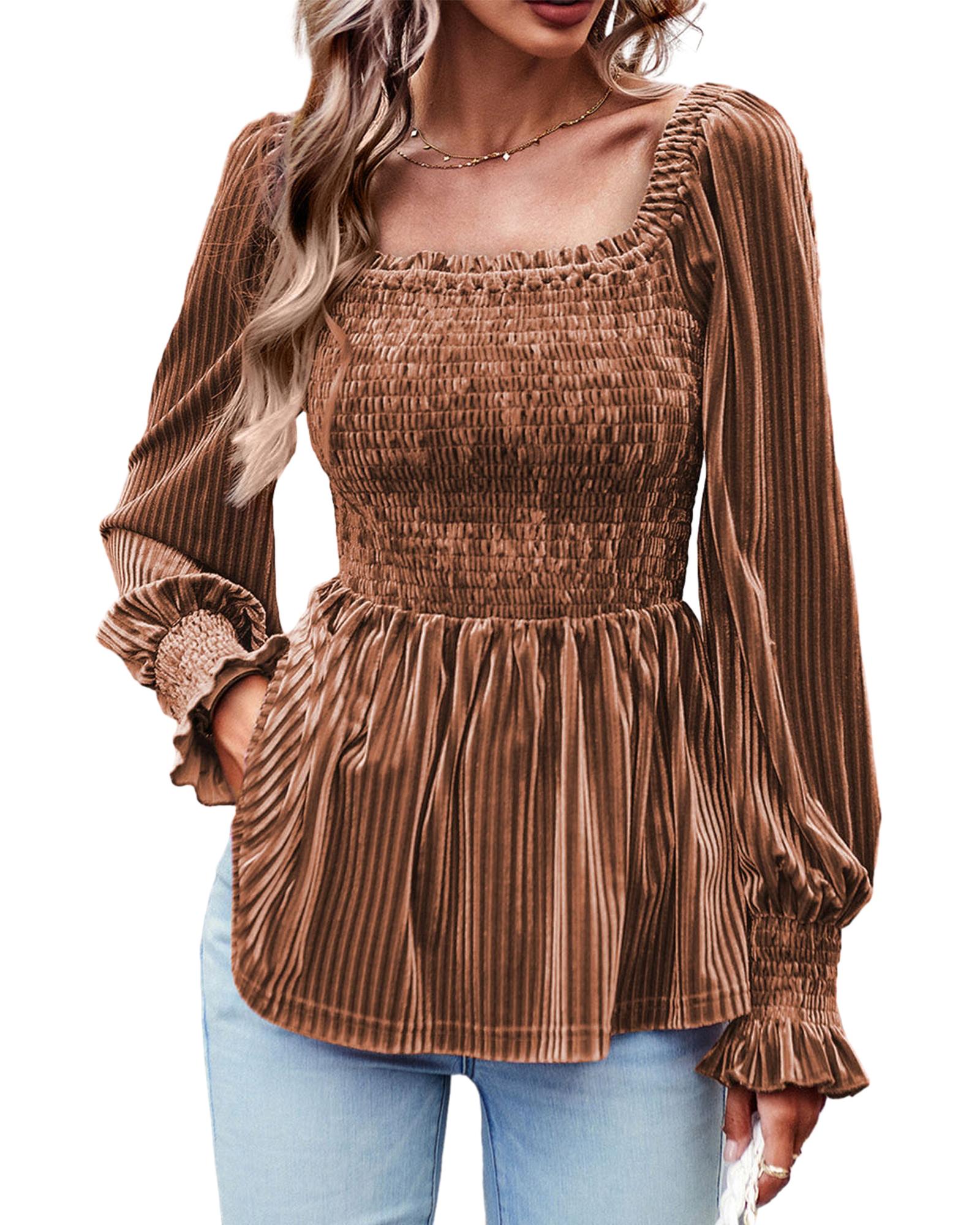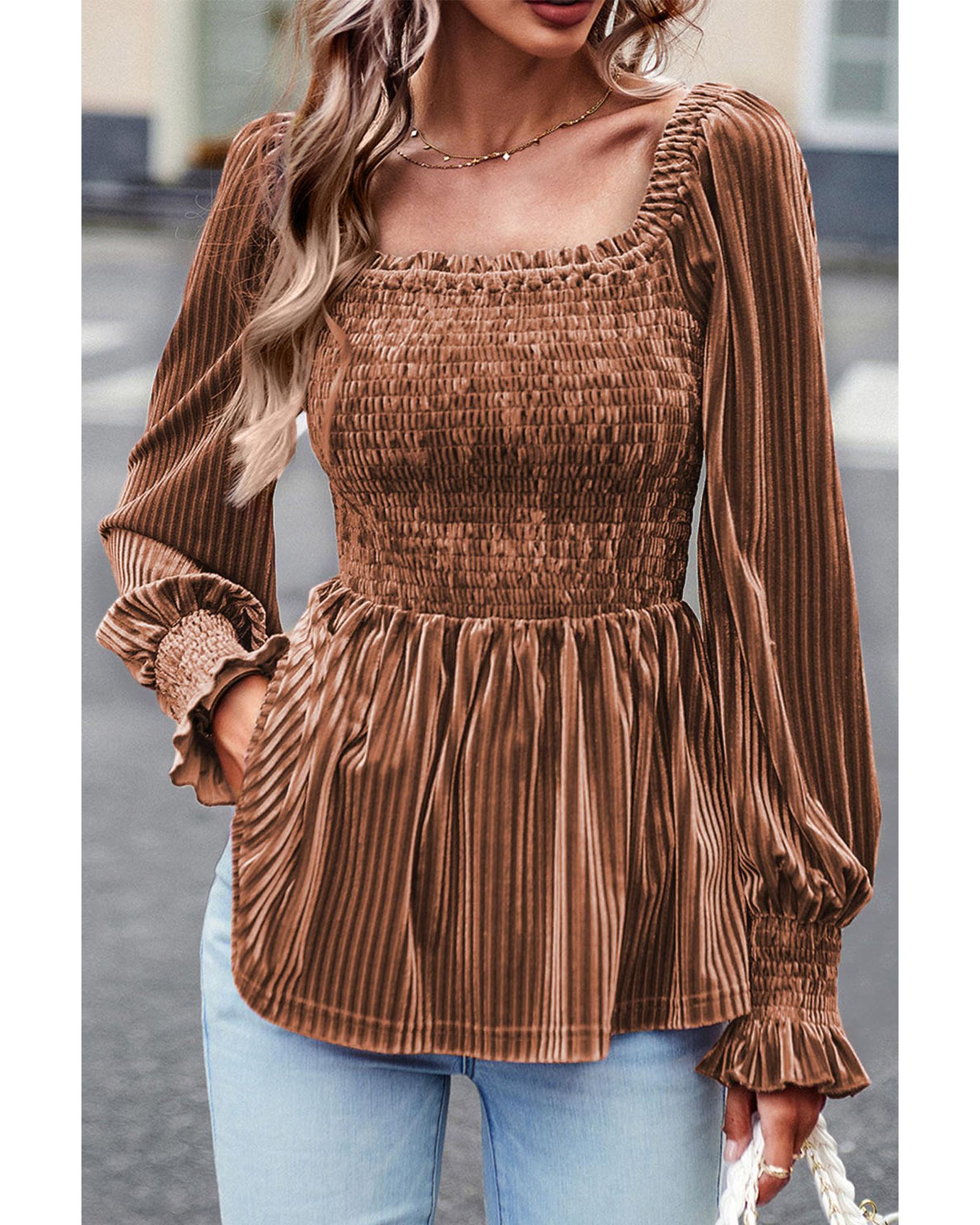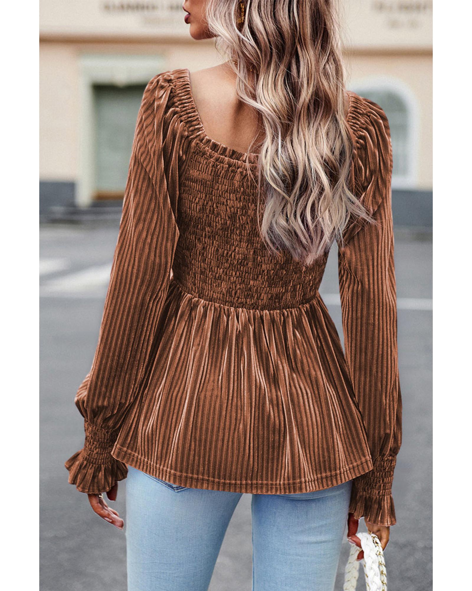 Chestnut Smocked Ribbed Velvet Babydoll Top – M