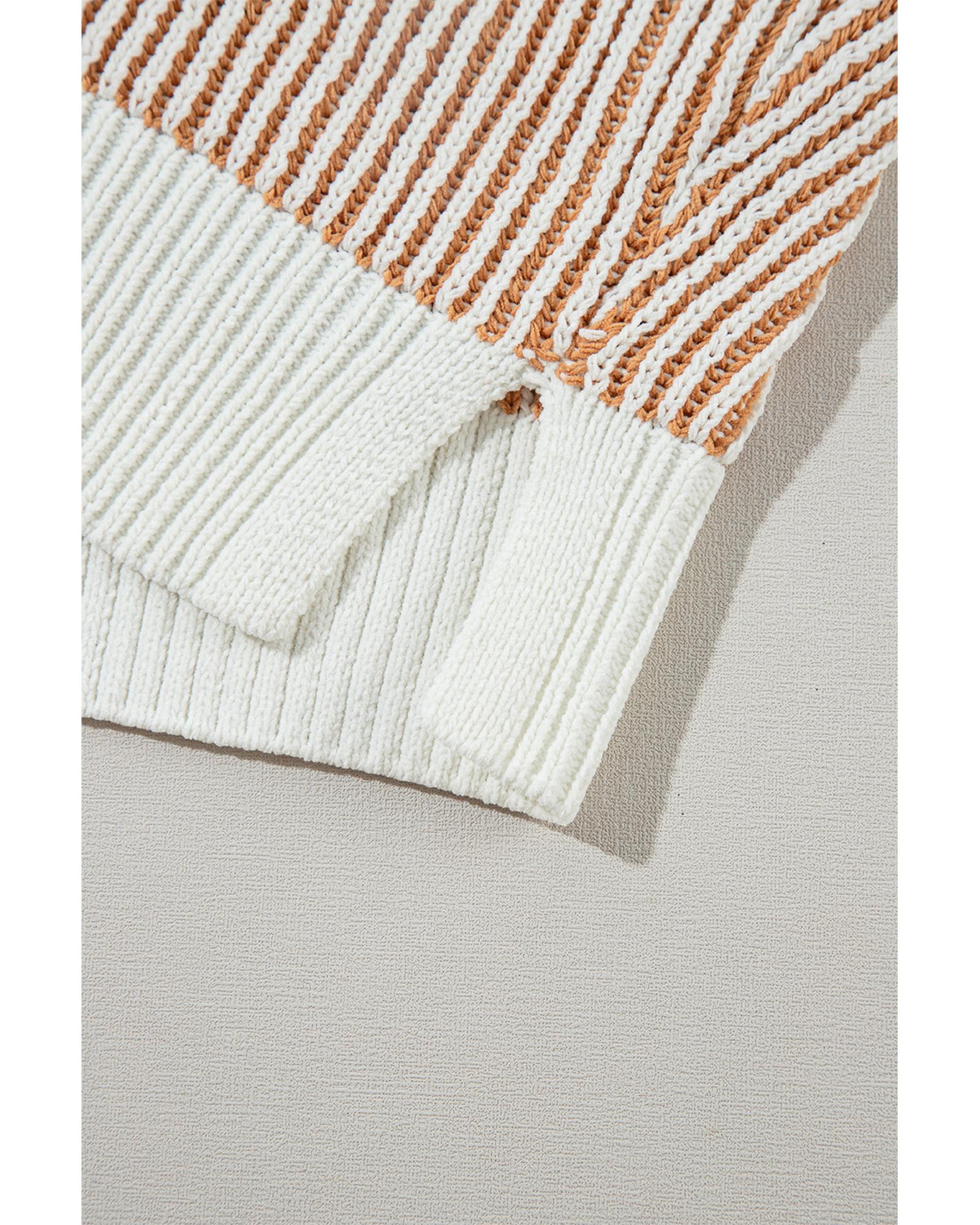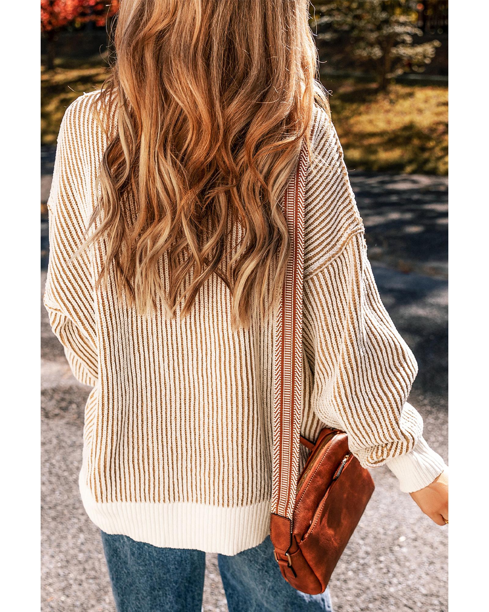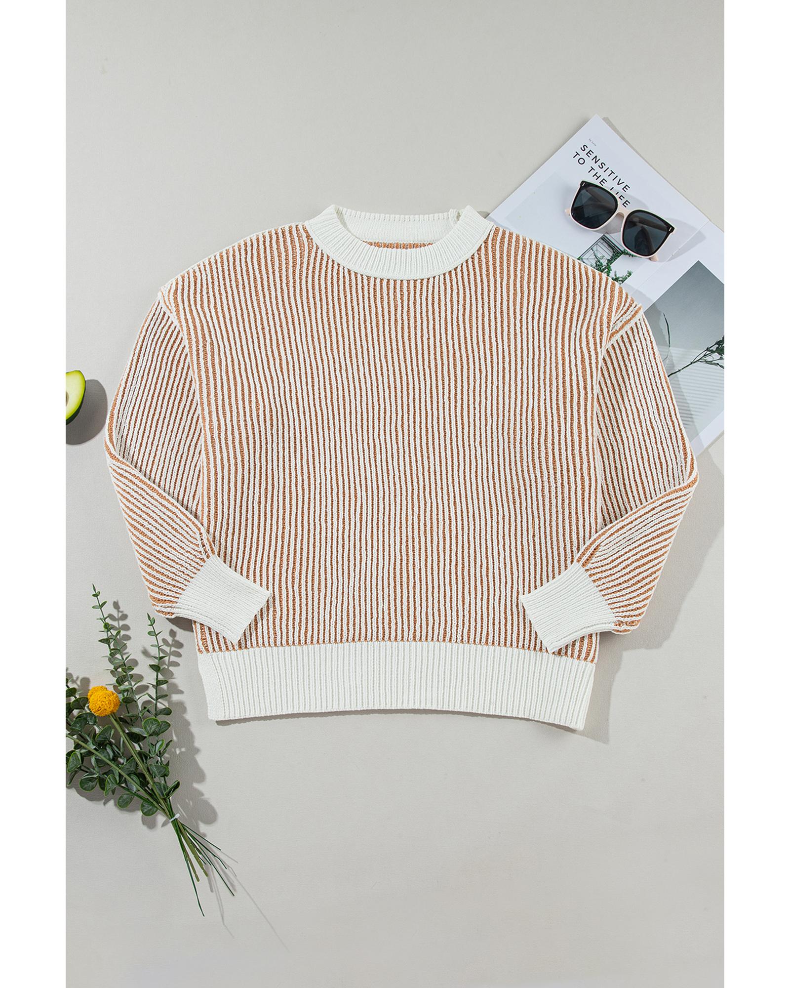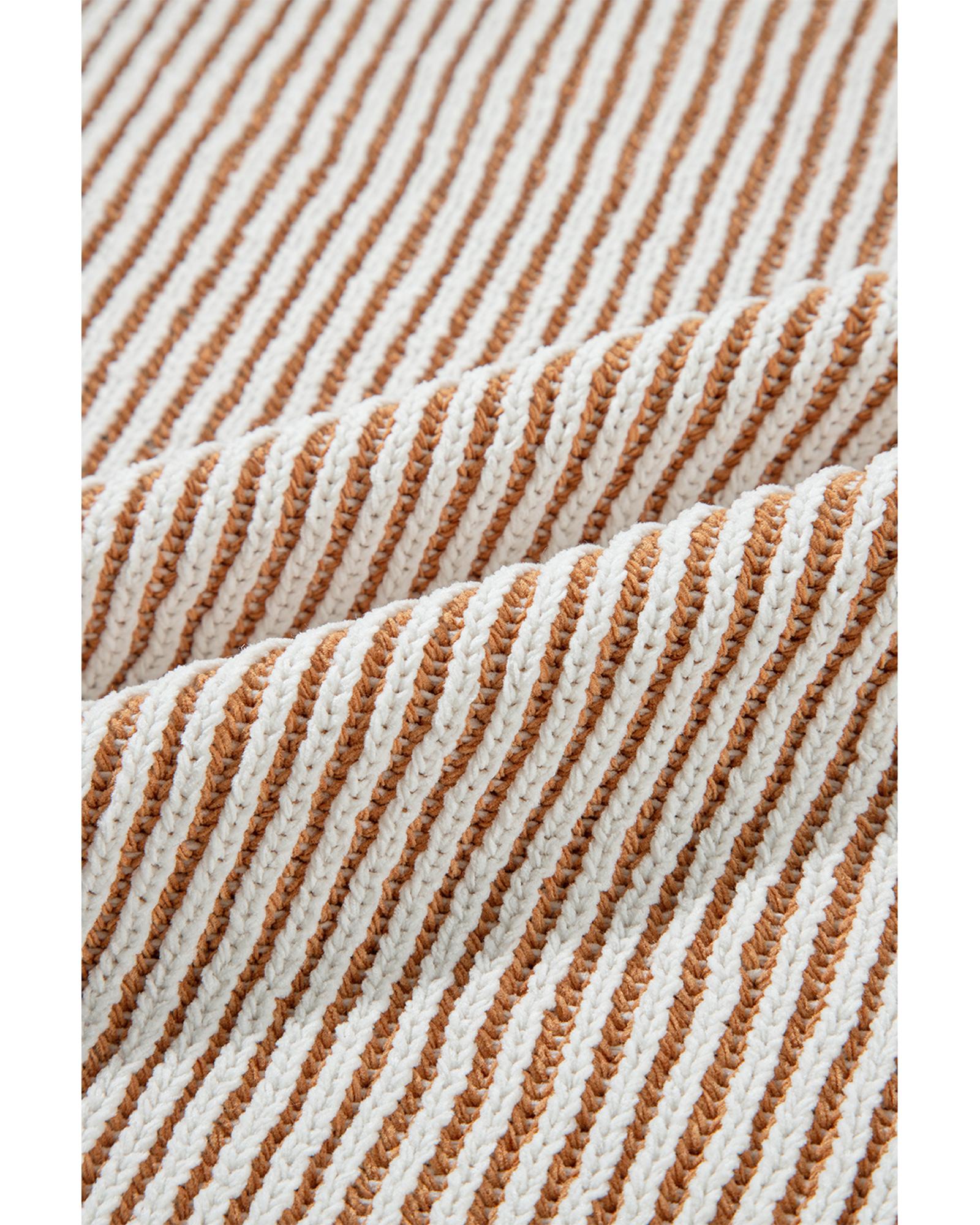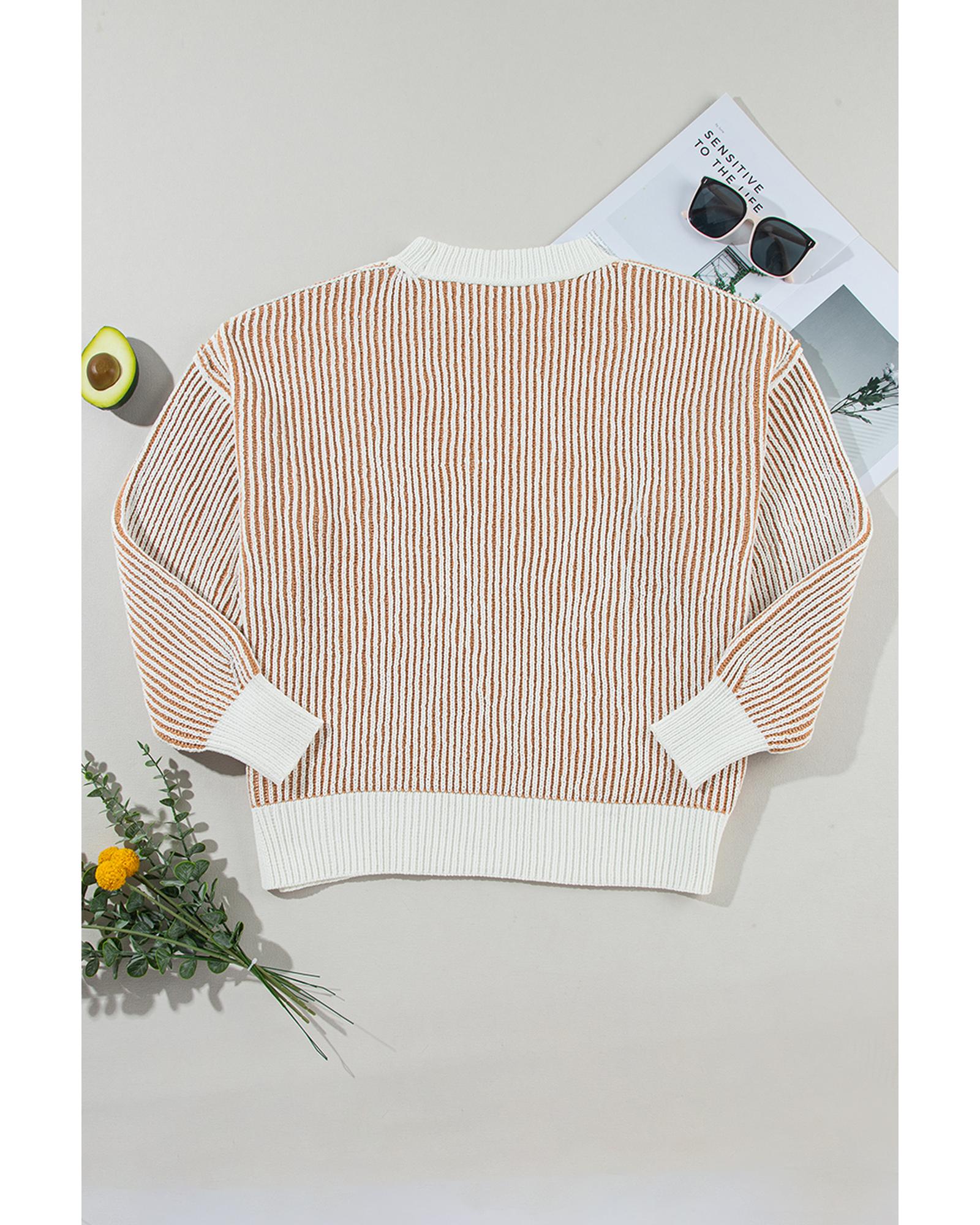 - Chestnut Striped Textured Knit Contrast Edge Loose Sweater