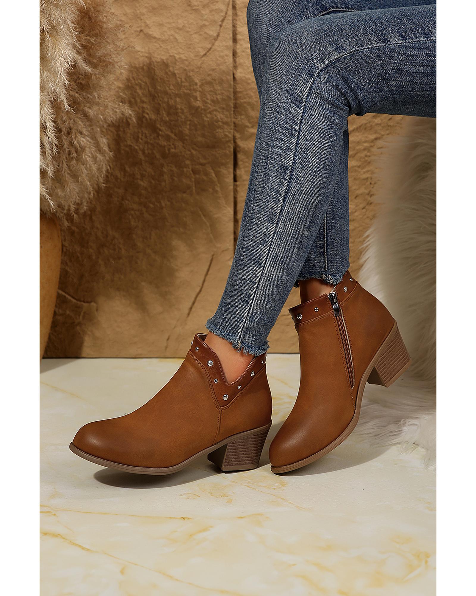 Chestnut Studded Faux Leather Chunky Heel Ankle Boots - 37 EU