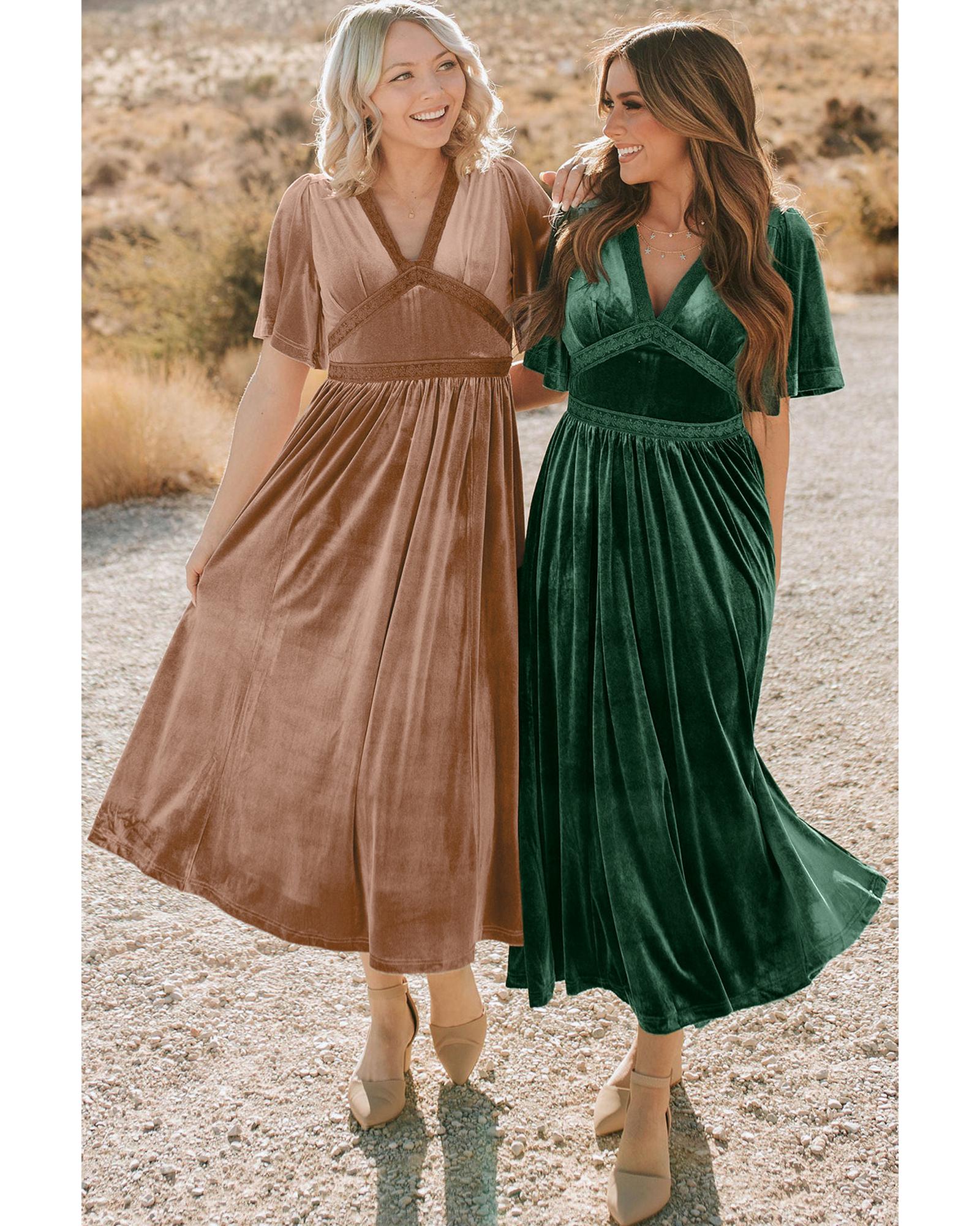 Chestnut Velvet Lacy V Neckline Short Sleeve Empire Waist Flowy Maxi Dress – M