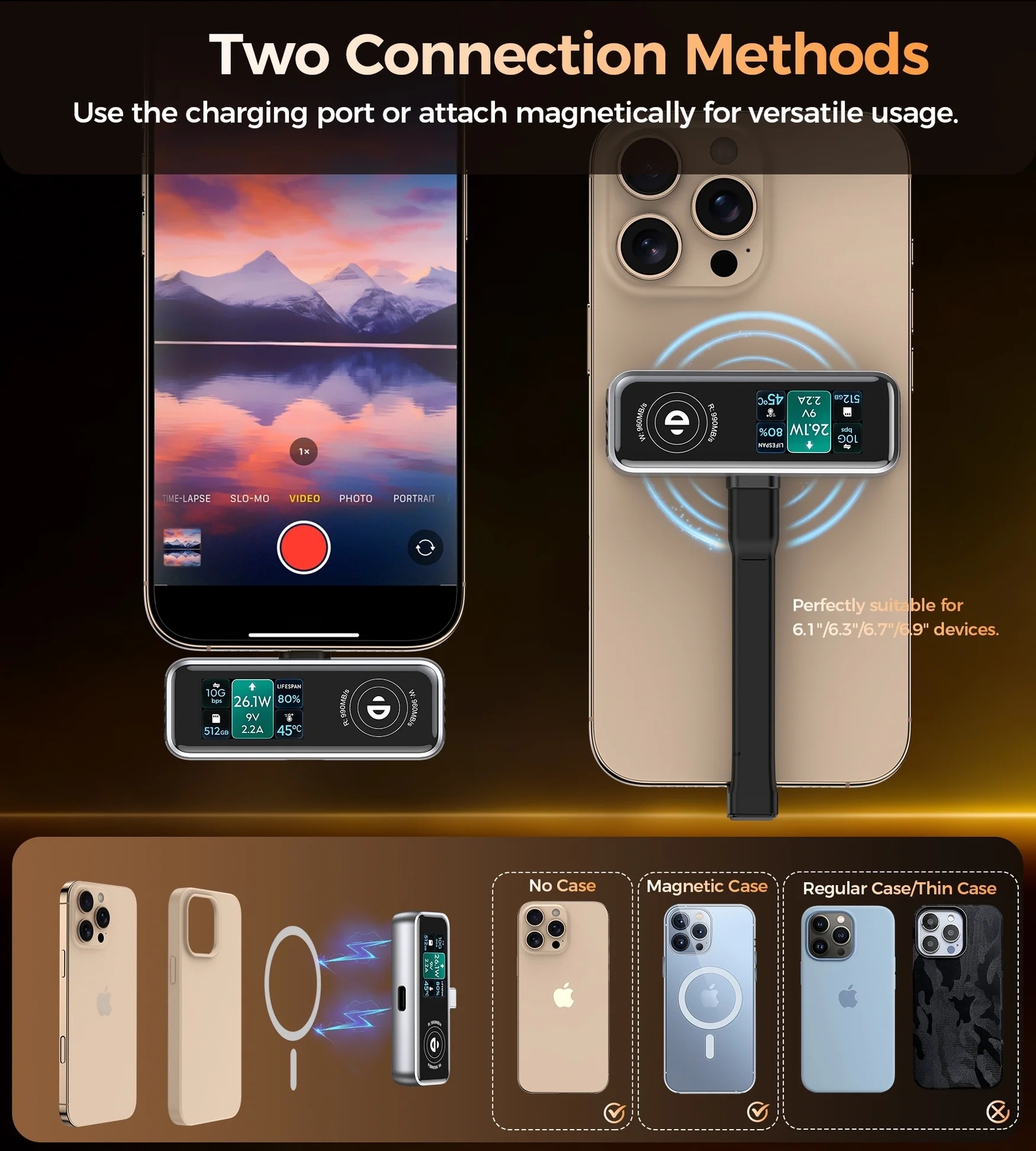 Features a right-angle Type-C cable and MagSafe attachment, ensuring a secure connection at up to 10Gbps with devices sized 6.1″, 6.3″, 6.7″, and 6.9″.