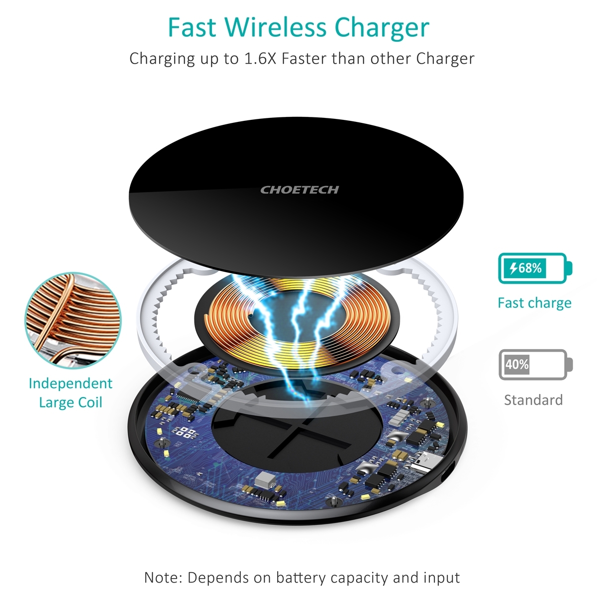 Including QC3. 0 AC Adapter, charge your phone more effectively and provide you a better charging experience. No longer to consider what kind of wall charger is the best for you to use. Built-in upgraded indepent large coil that made of high-purity copper, along with smart chip, will provide larger charging area and higher efficiency.