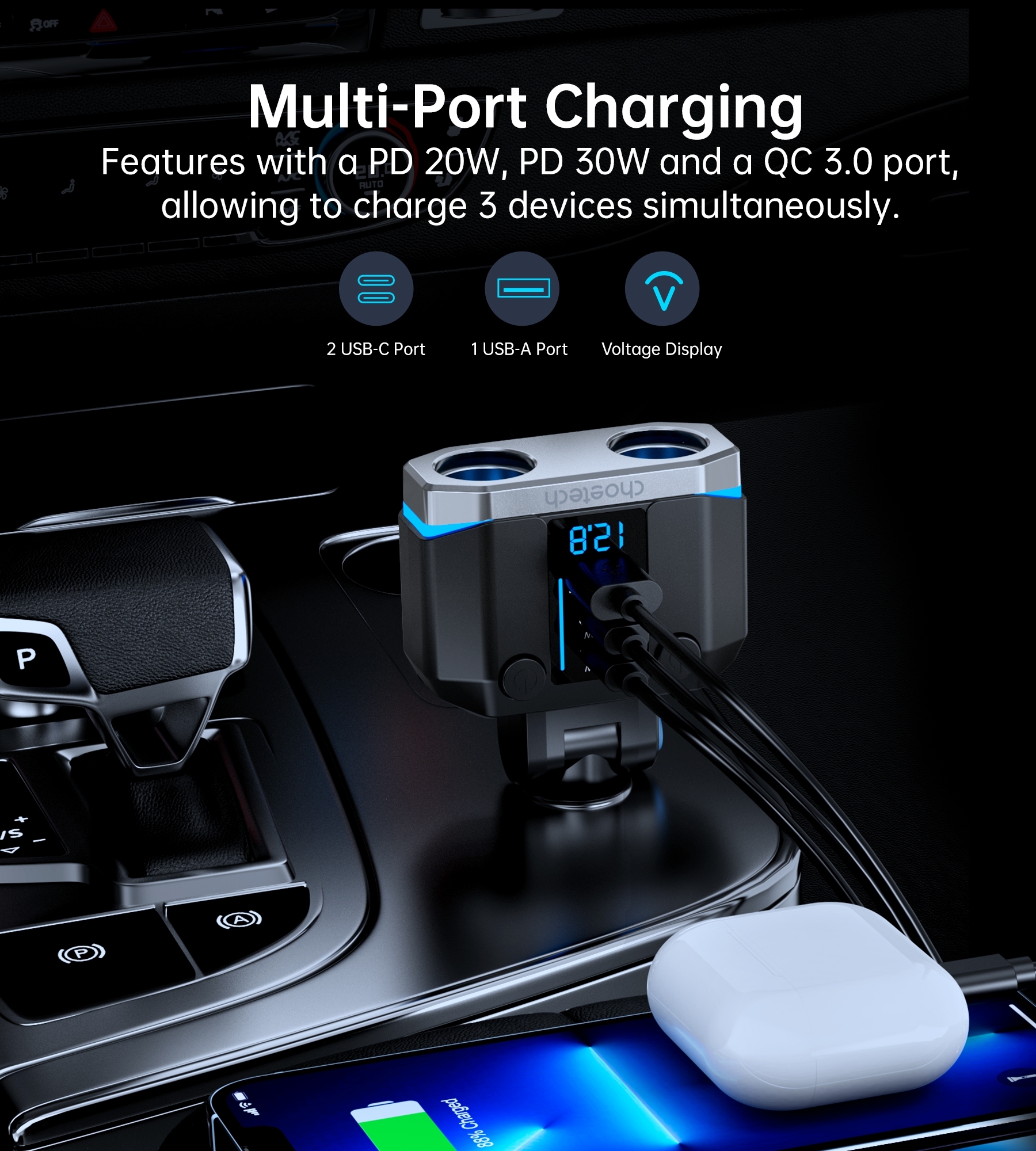 Works with iPhones, Samsung devices, Android gadgets, iPads, and a variety of 12-24V car accessories like GPS, cameras, and more.