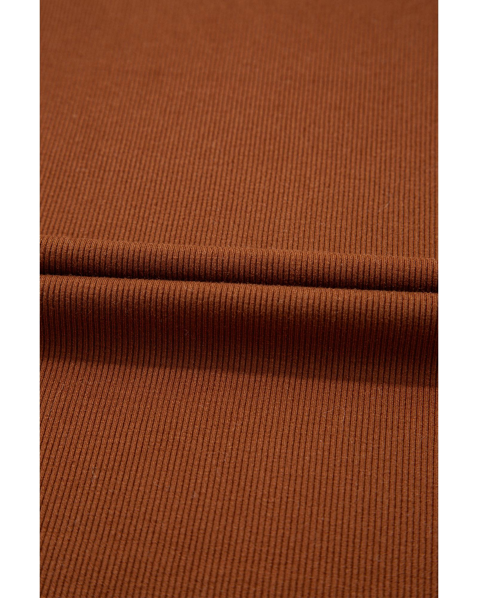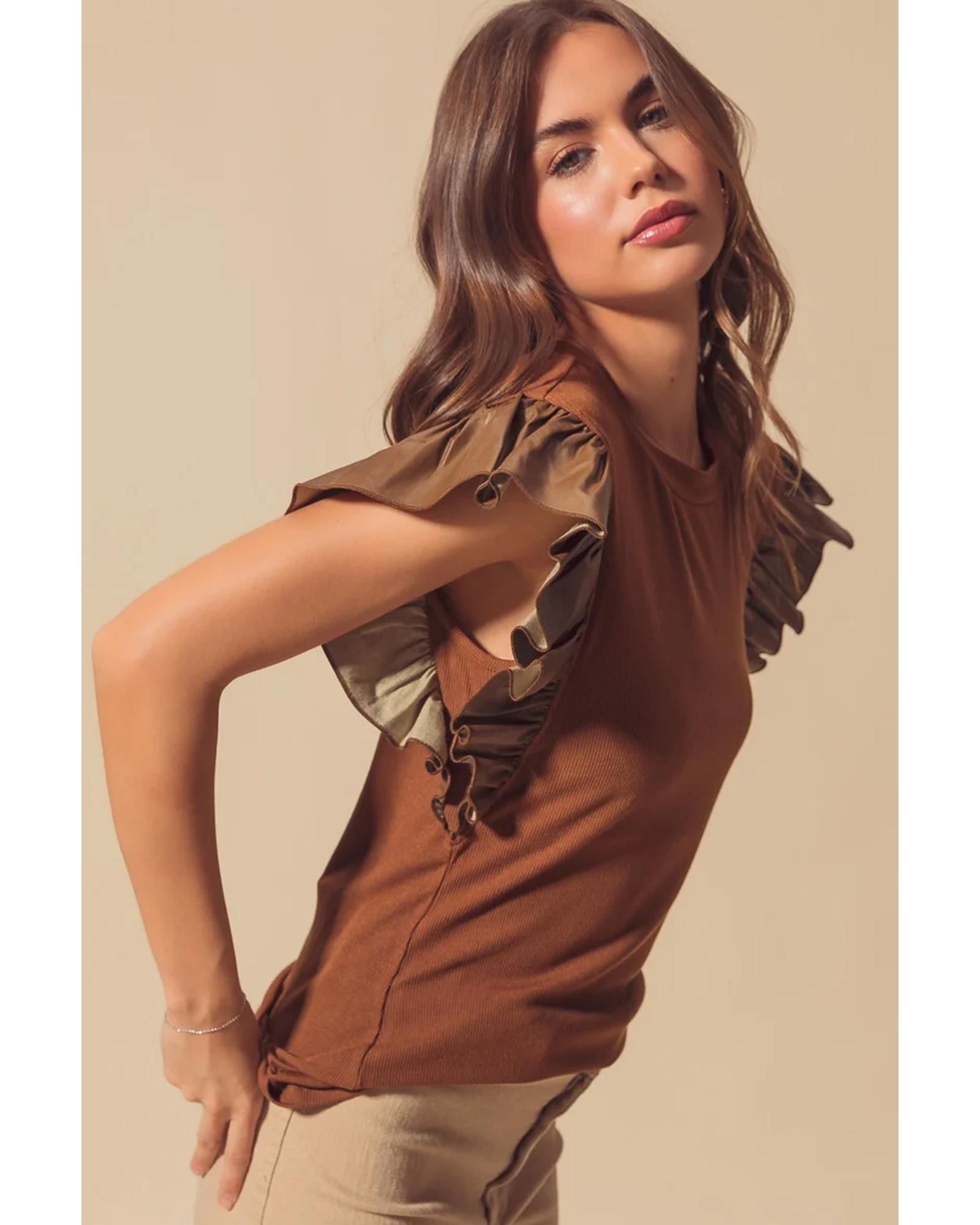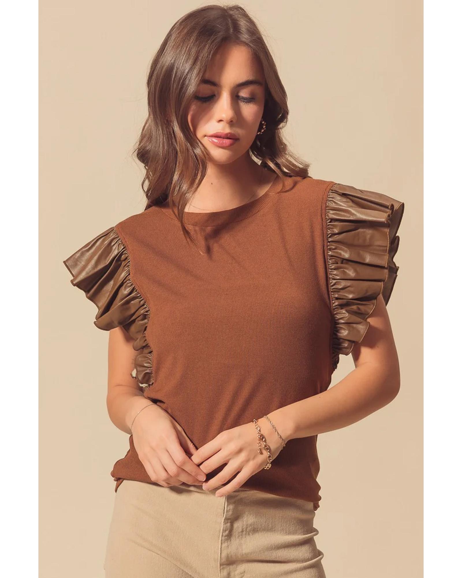 Cinnamon Leather Ruffle Sleeve Patchwork Round Neck Blouse – XL