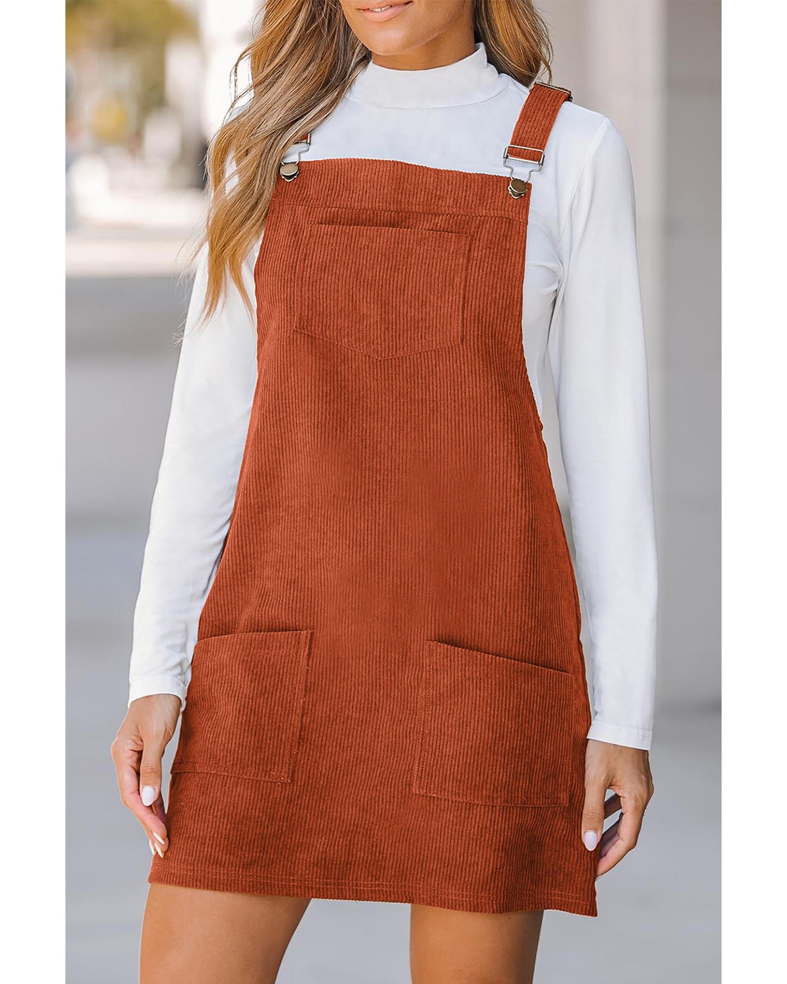 - Timeless Cinnamon Solid Front Pockets Sleeveless Corduroy Overall Dress