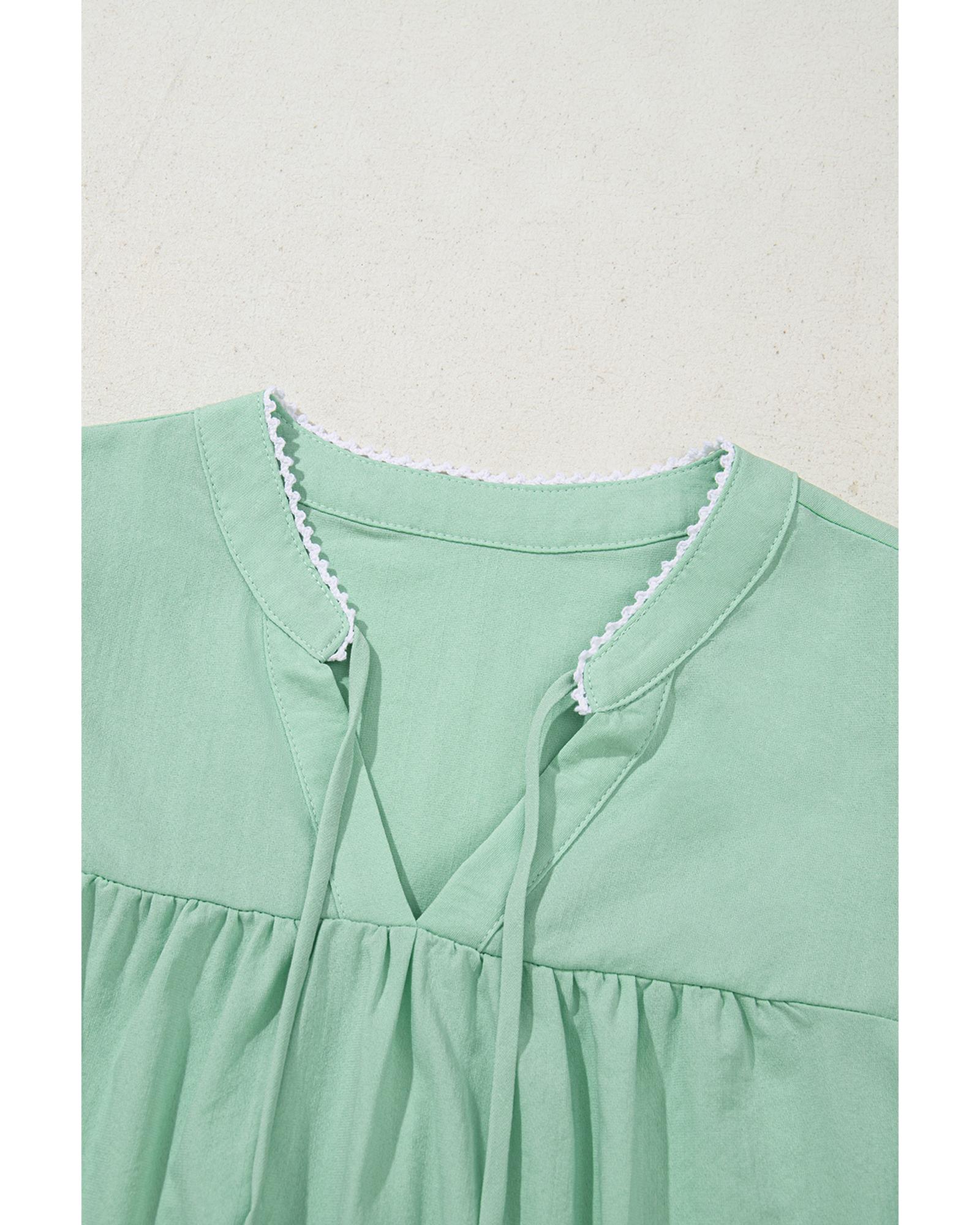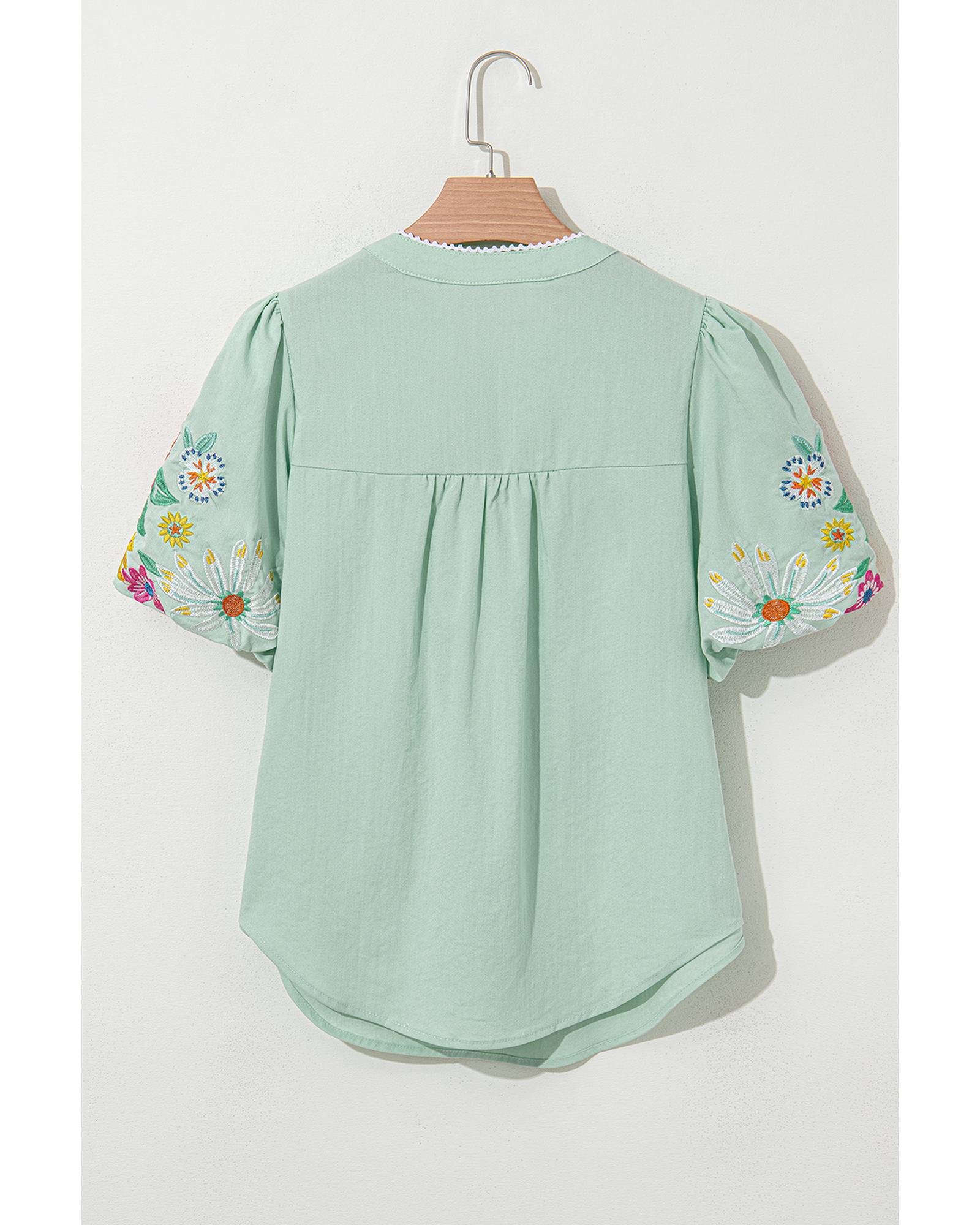 Clearly Aqua Floral Embroidered Puff Sleeve Split Neck Blouse – M