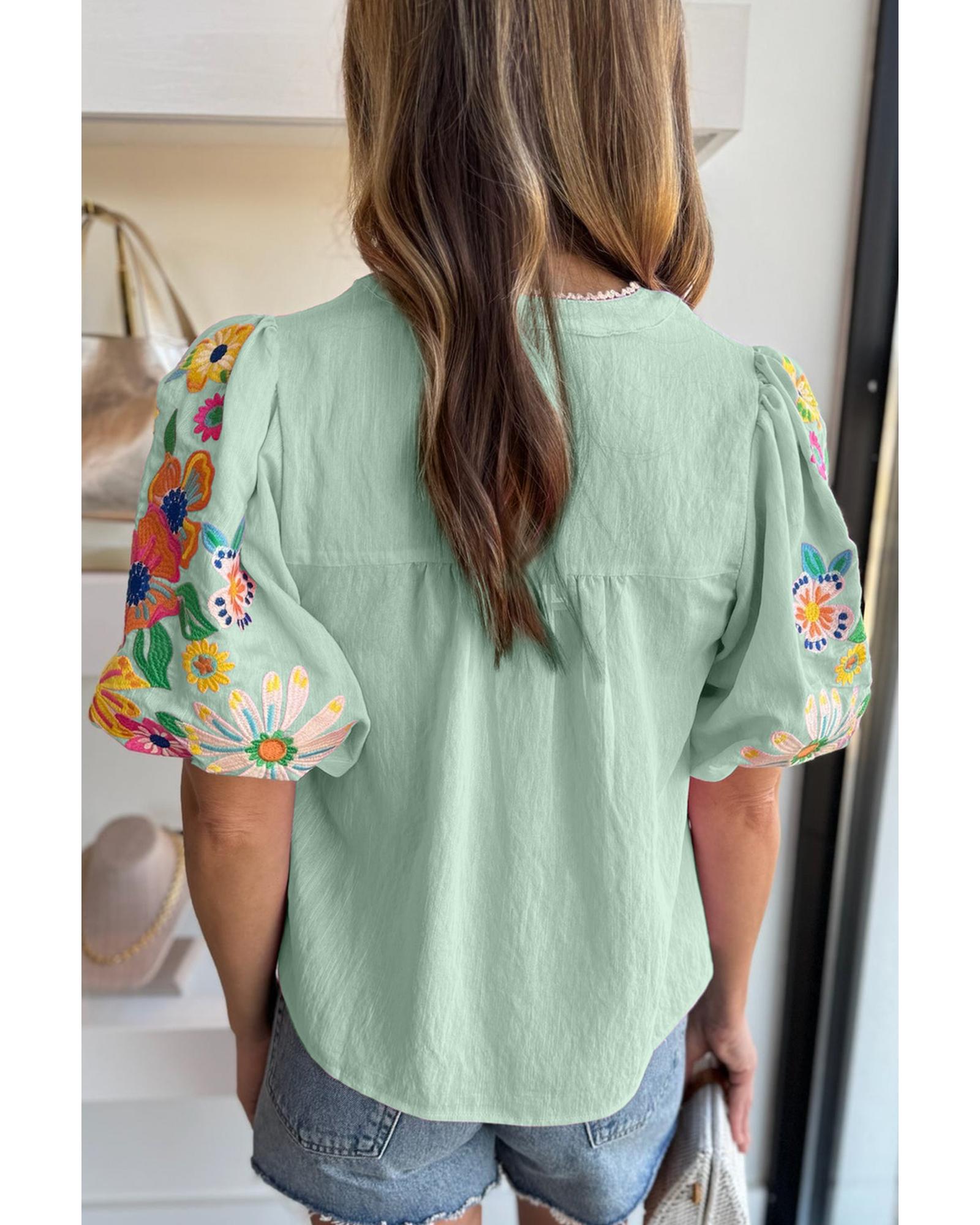 Clearly Aqua Floral Embroidered Puff Sleeve Split Neck Blouse – S