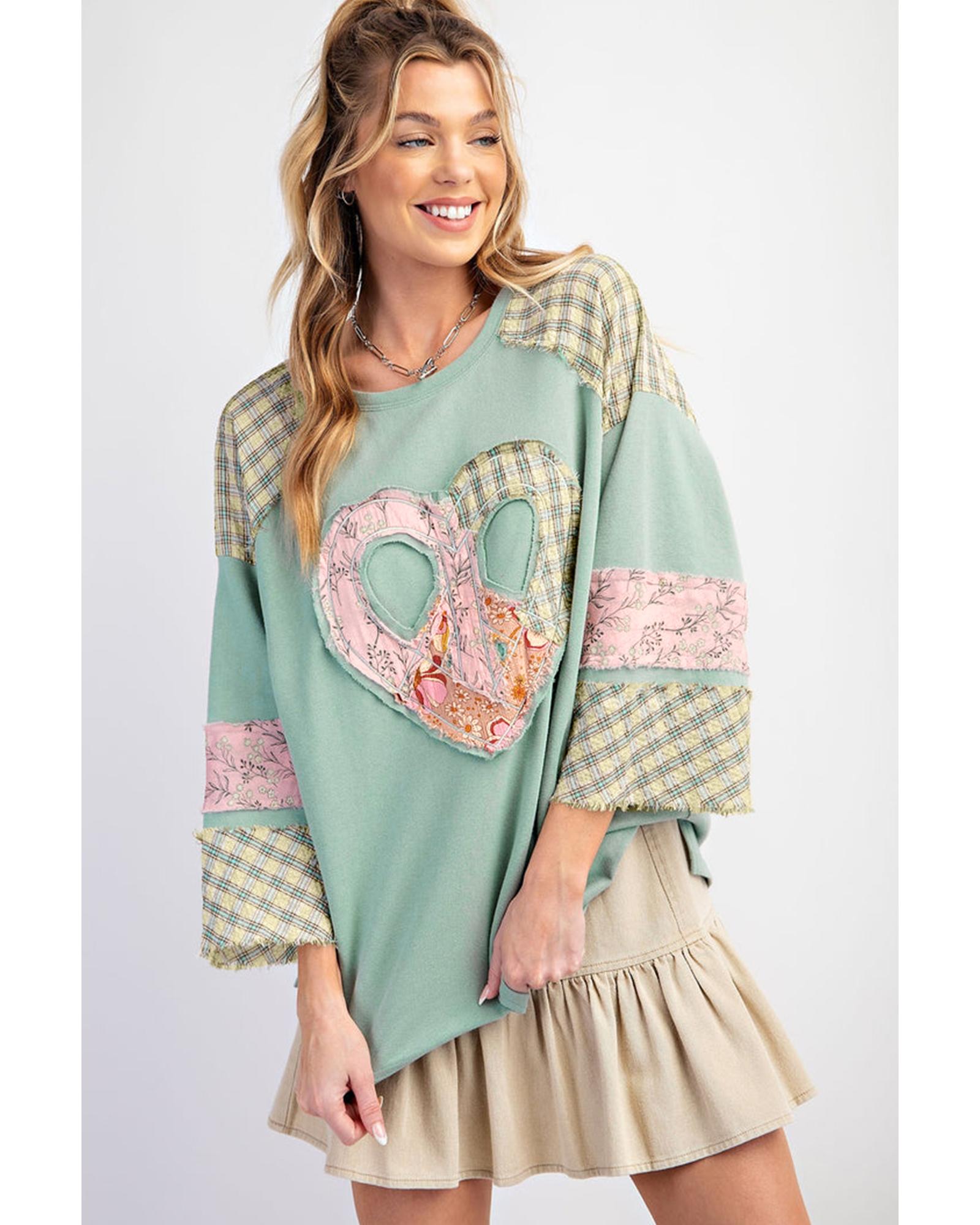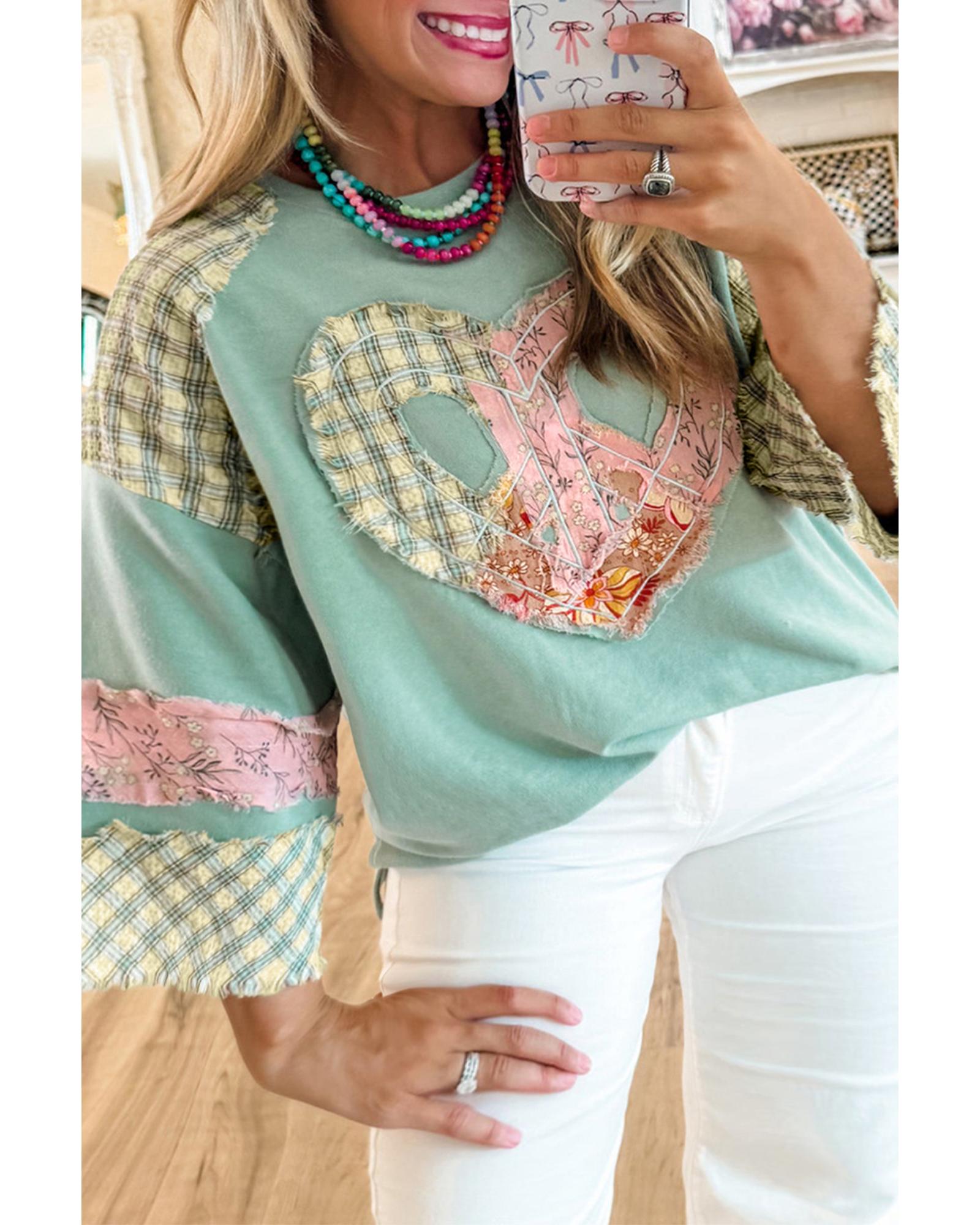 Clearly Aqua Plaid Floral Peace Heart Graphic Wide Long Sleeve Top – S