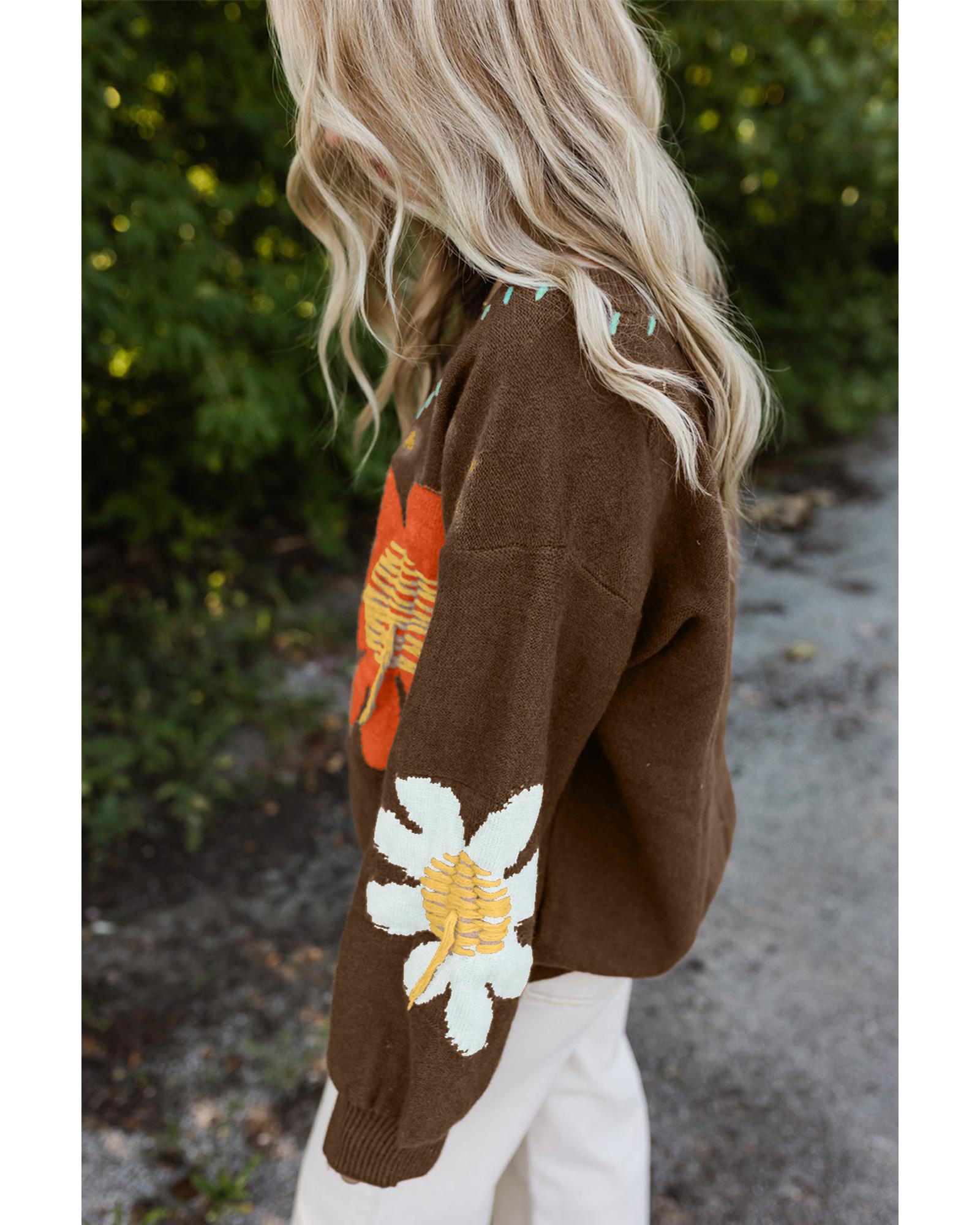 Coffee Big Flower Pattern V Neck Drop Shoulder Sweater – S
