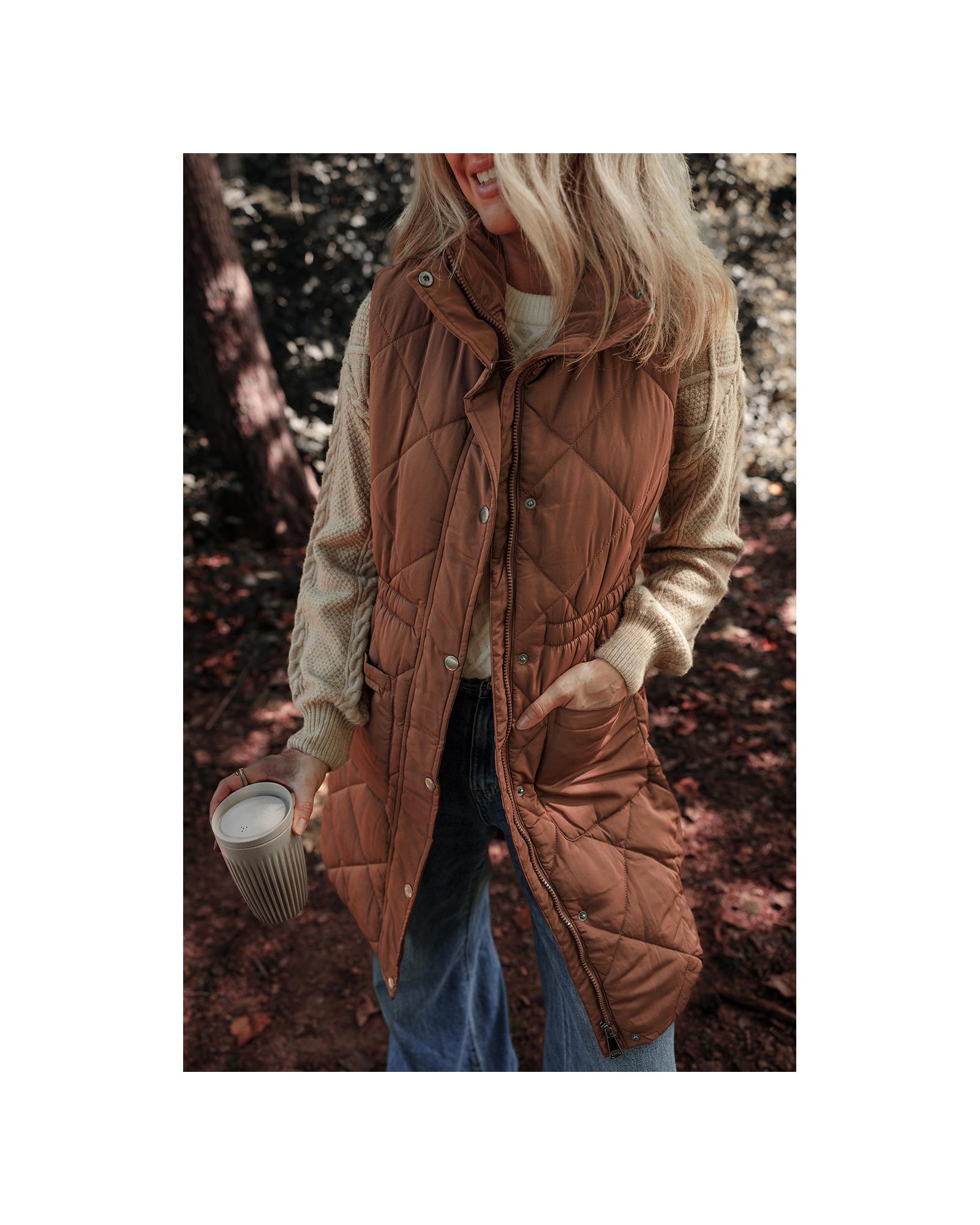 Coffee Longline Quilted Stand Collar Puffer Vest – XL