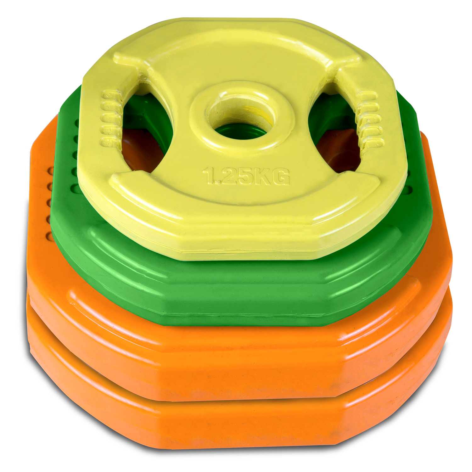 Our 30kg set is perfect for home or gym fitness pump/studio/aerobics classes. Our 8-sided anti-roll design plates are rubber coated, great for all surfaces and will minimise any damage to flooring.