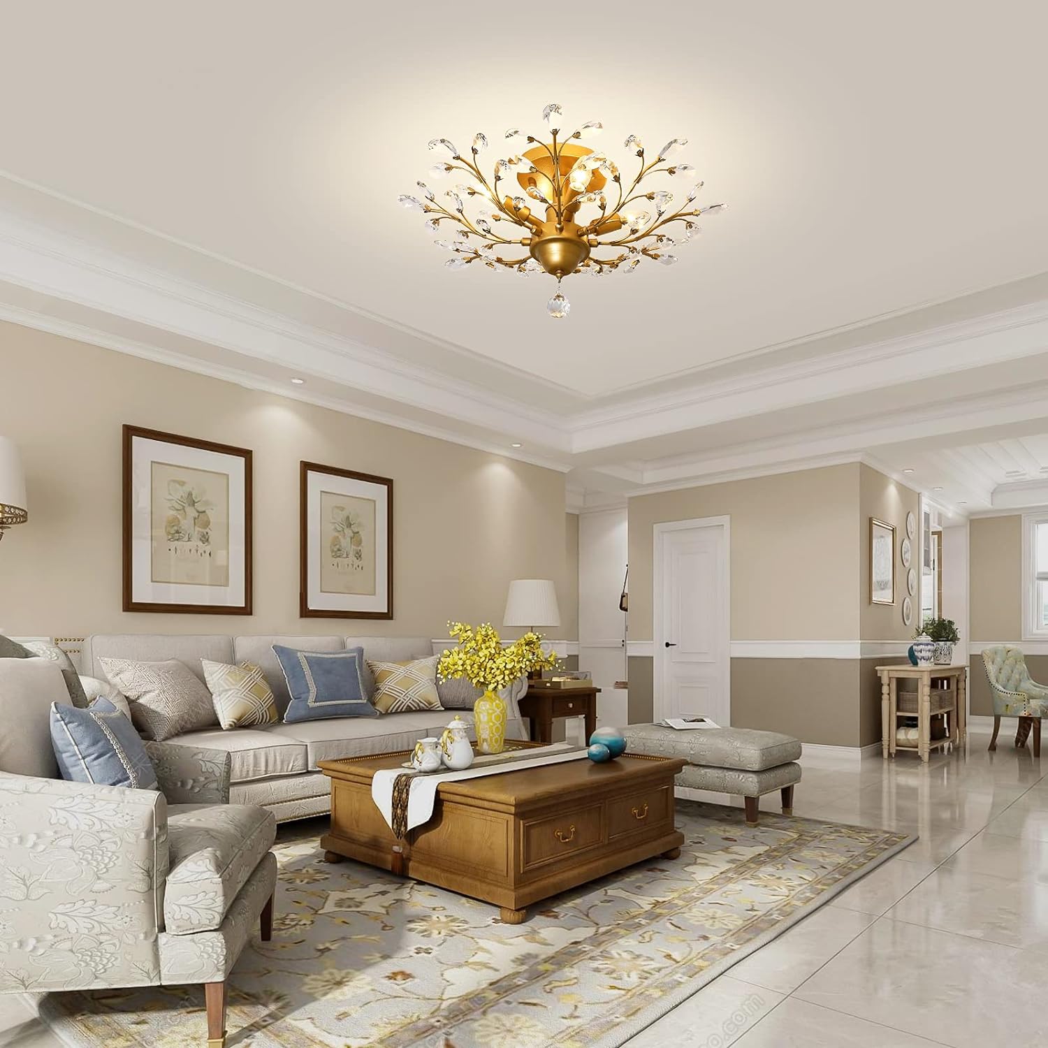 - ELEGANT GLOW: Illuminate your space with this classic gold ceiling light featuring transparent K9 crystals that capture and reflect the light of the bulb. Enjoy a romantic, sweet evening atmosphere with plenty of light and reflection. Easily replace the light bulb to instantly upgrade the look of your home’s ceiling.
