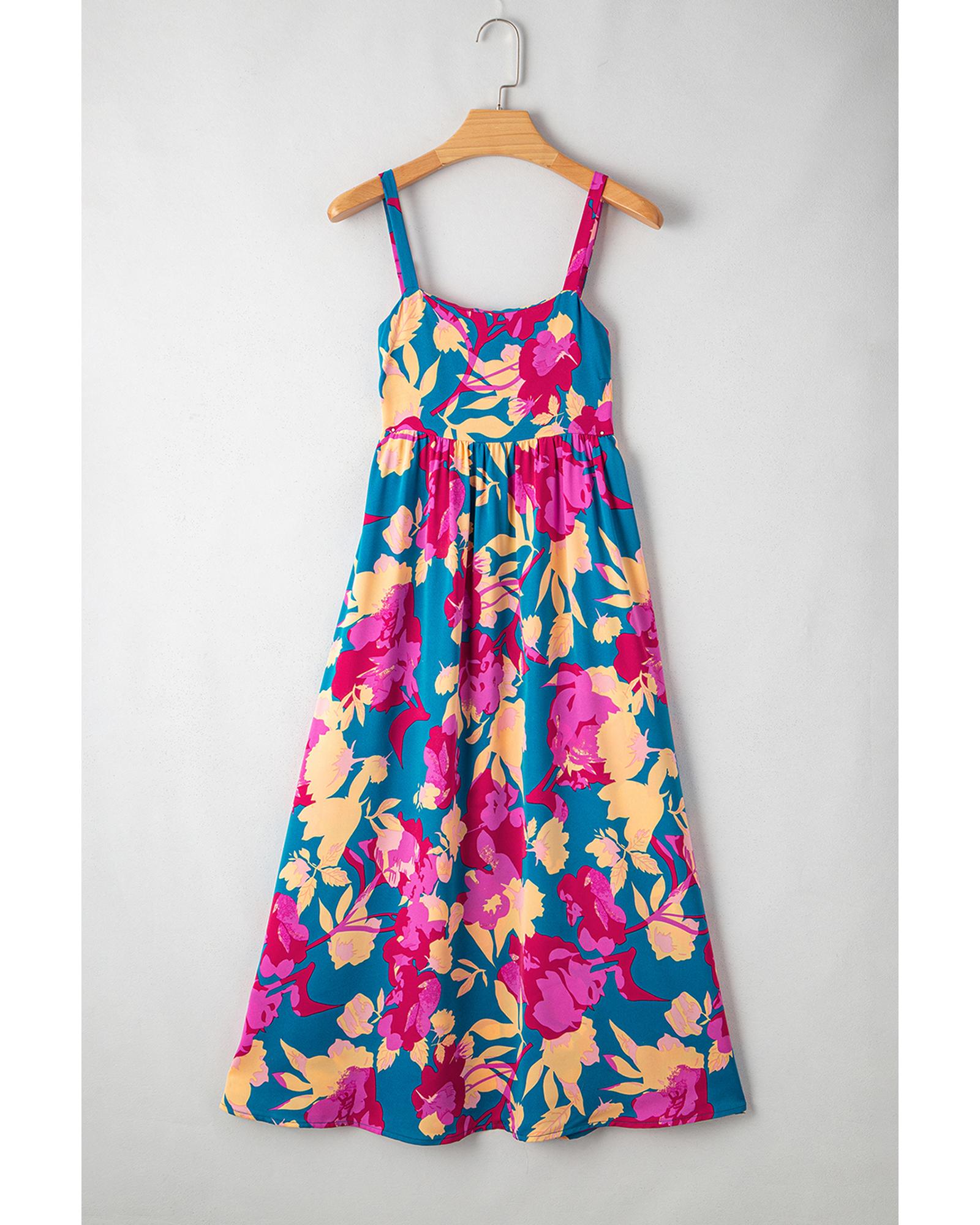 Dark Blue Floral High Waist Sleeveless Flared Long Dress - M