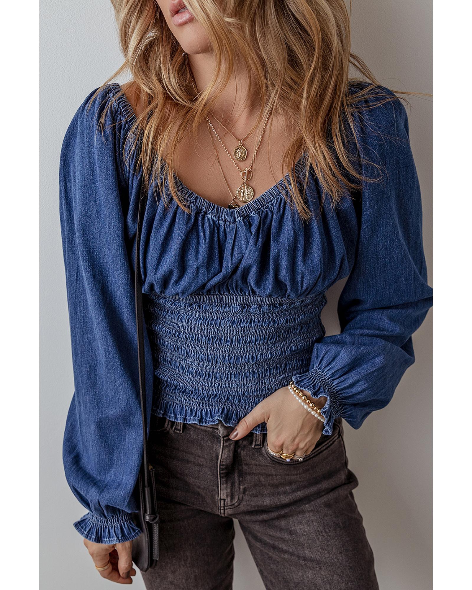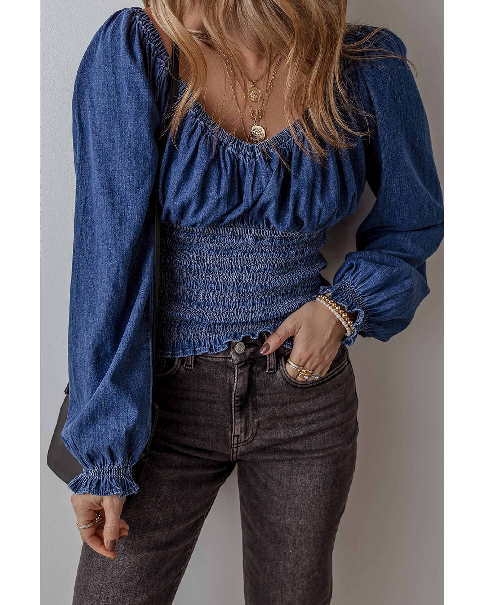 Dark Blue Smocked Ruffled Puff Sleeve V Neck Denim Blouse – S