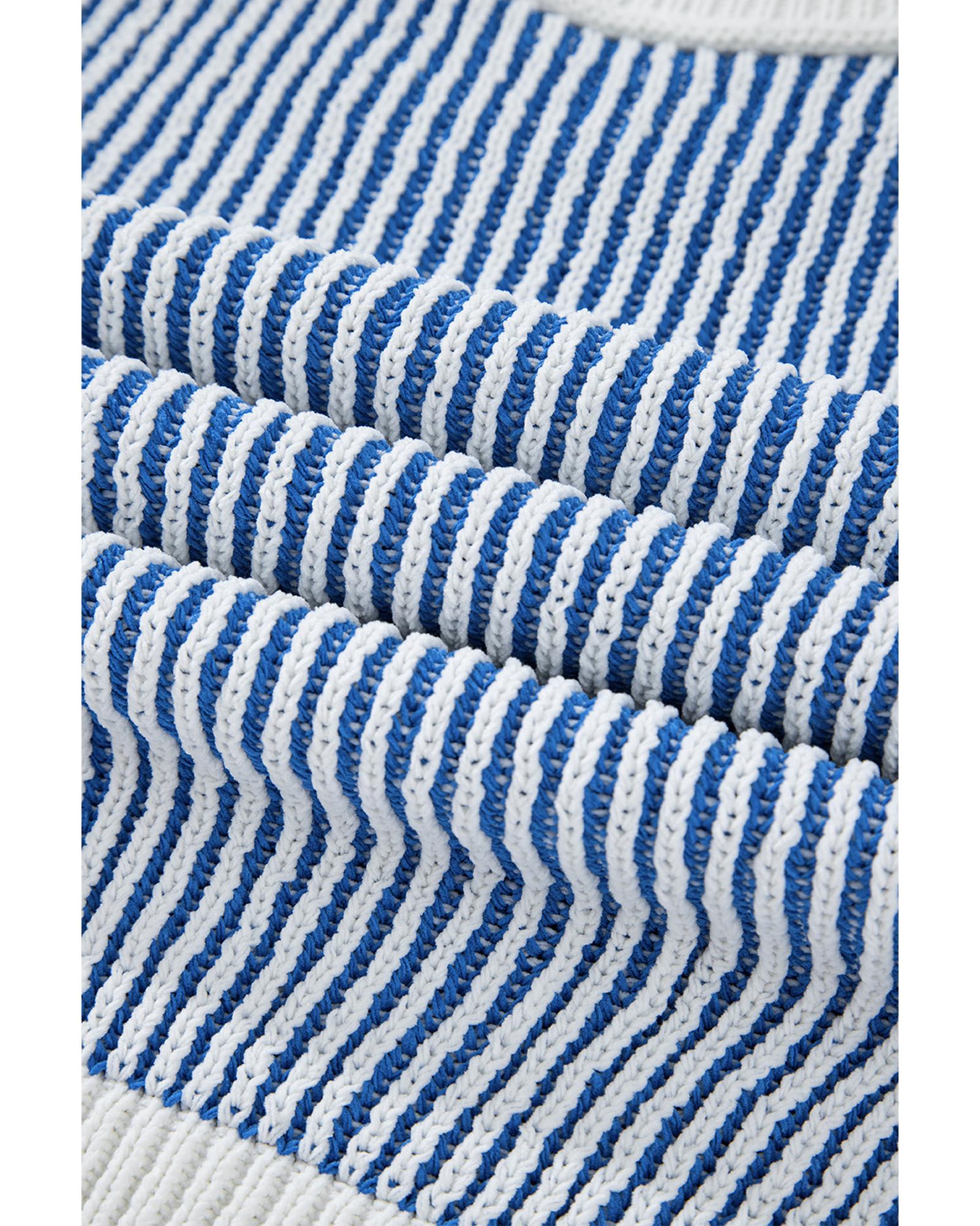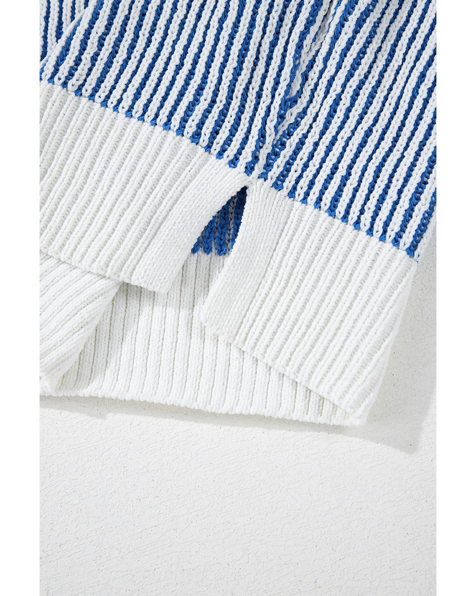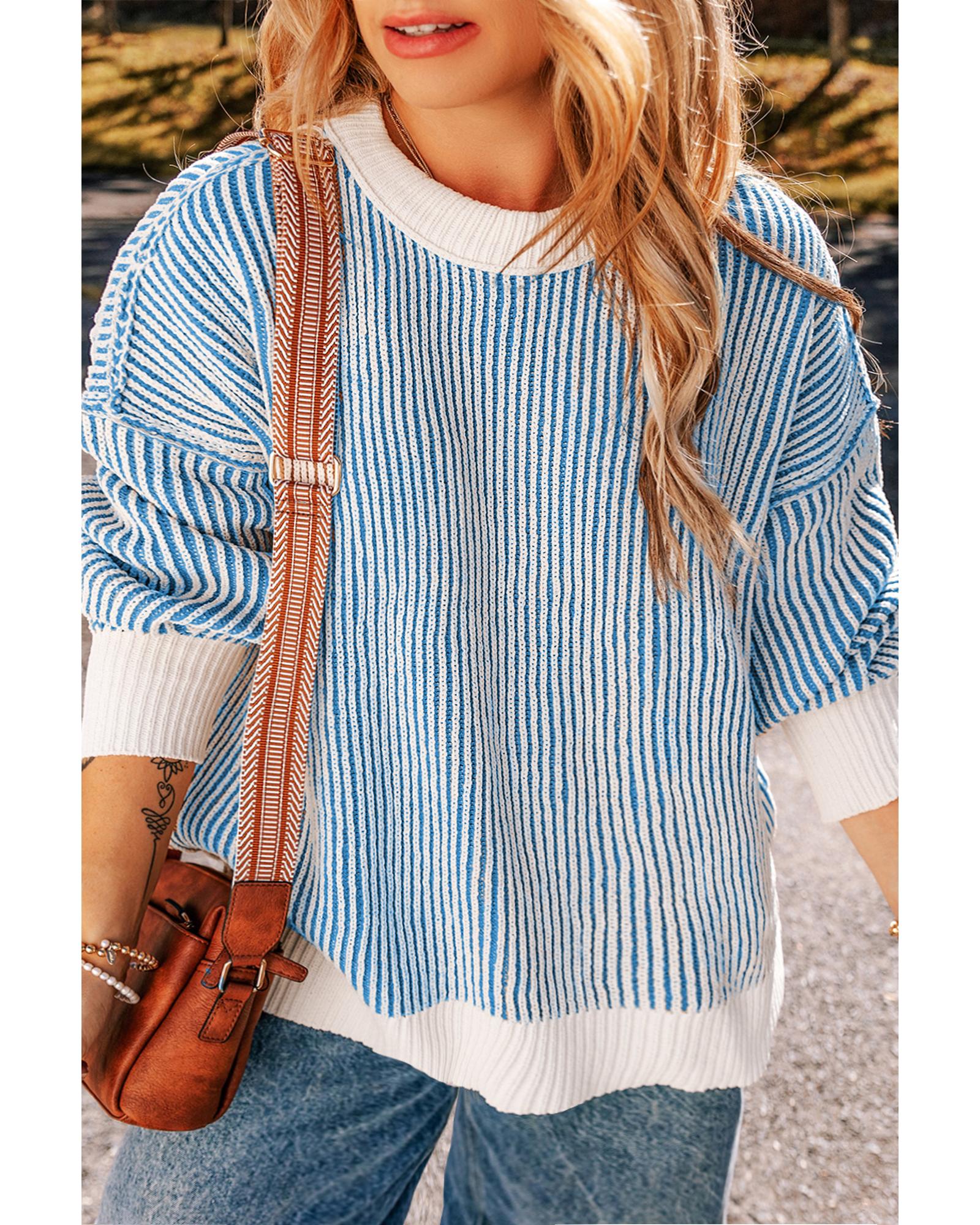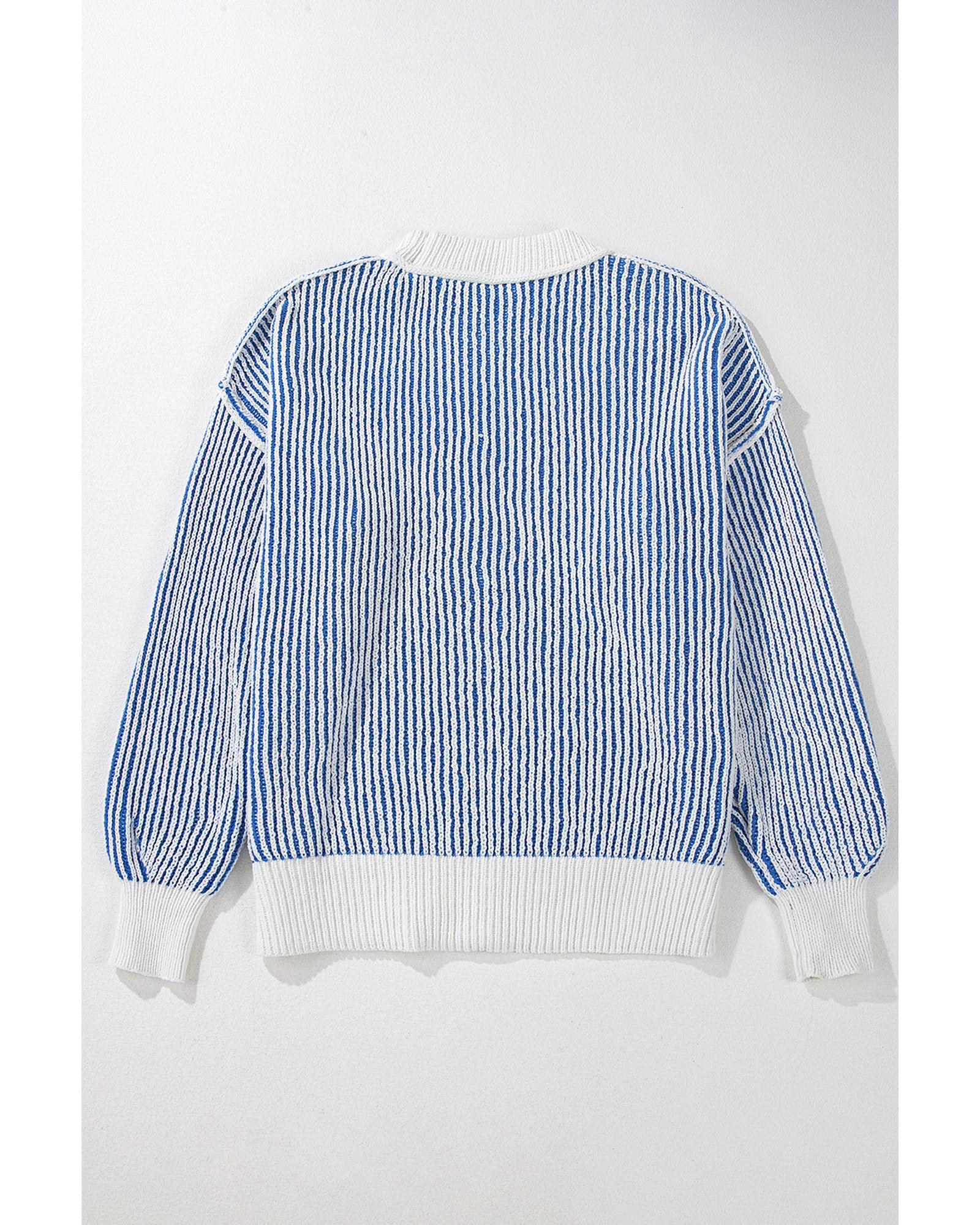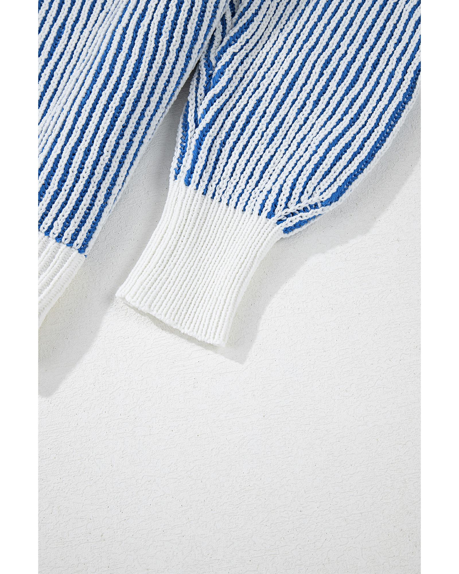 • Dark Blue Striped Textured Knit Contrast Edge Loose Sweater