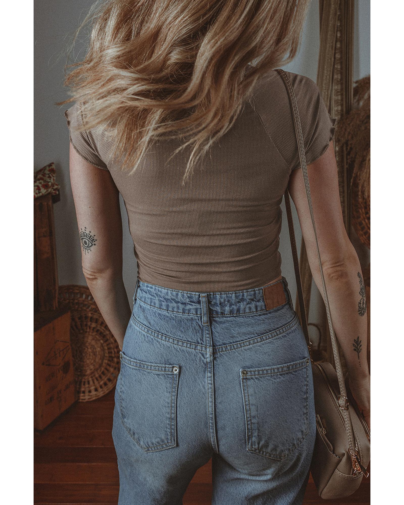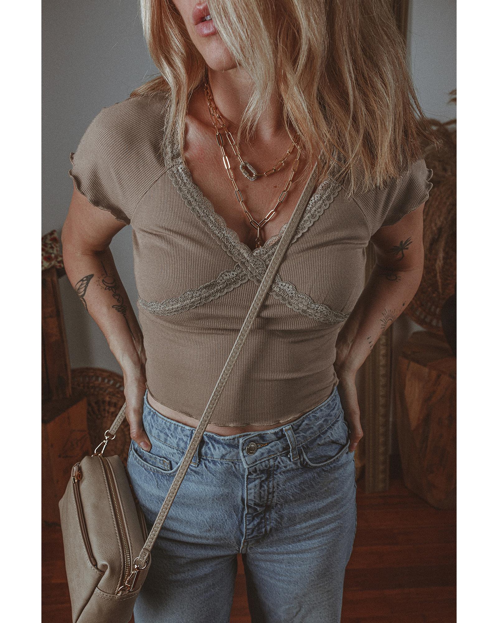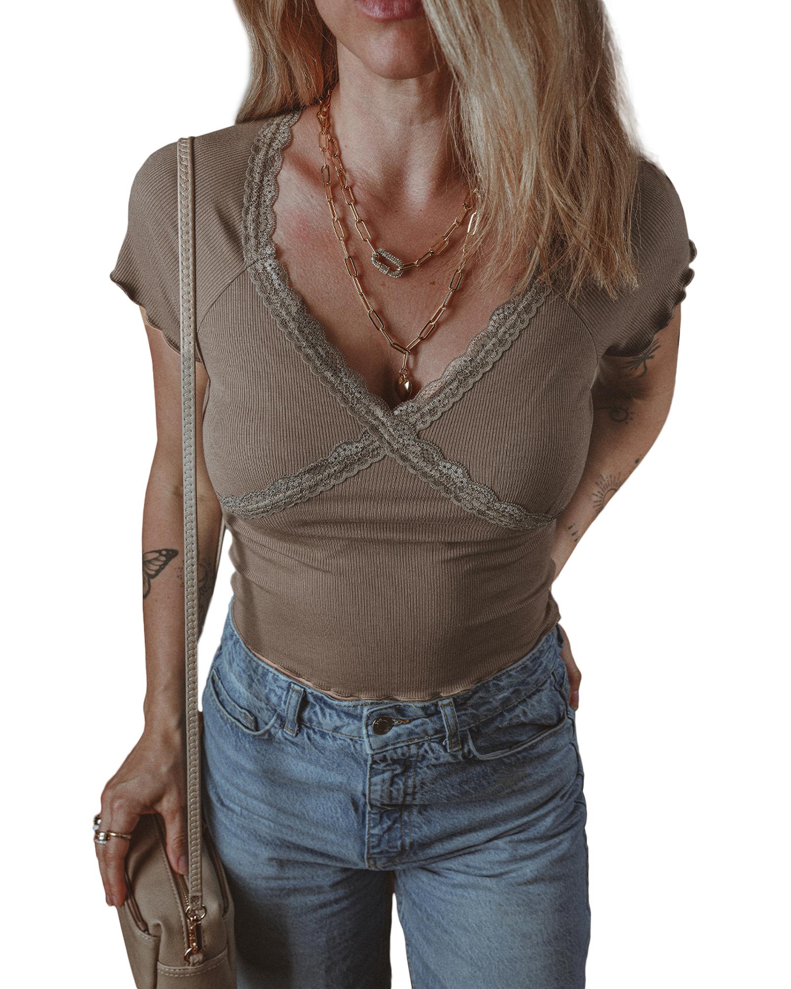 Dark Brown Lace Splicing Criss Cross Slim Fit V Neck T Shirt – L