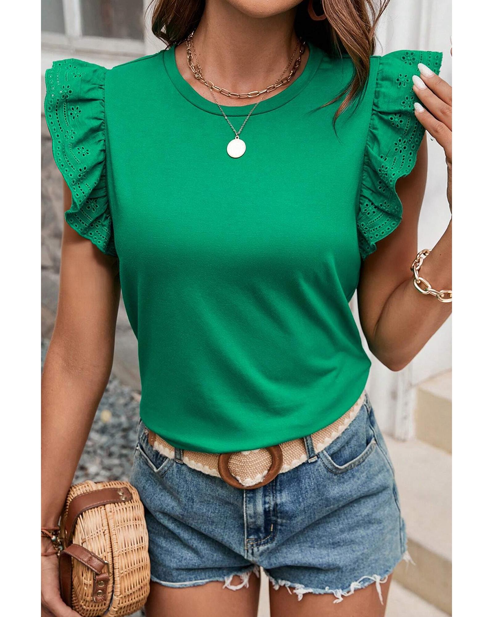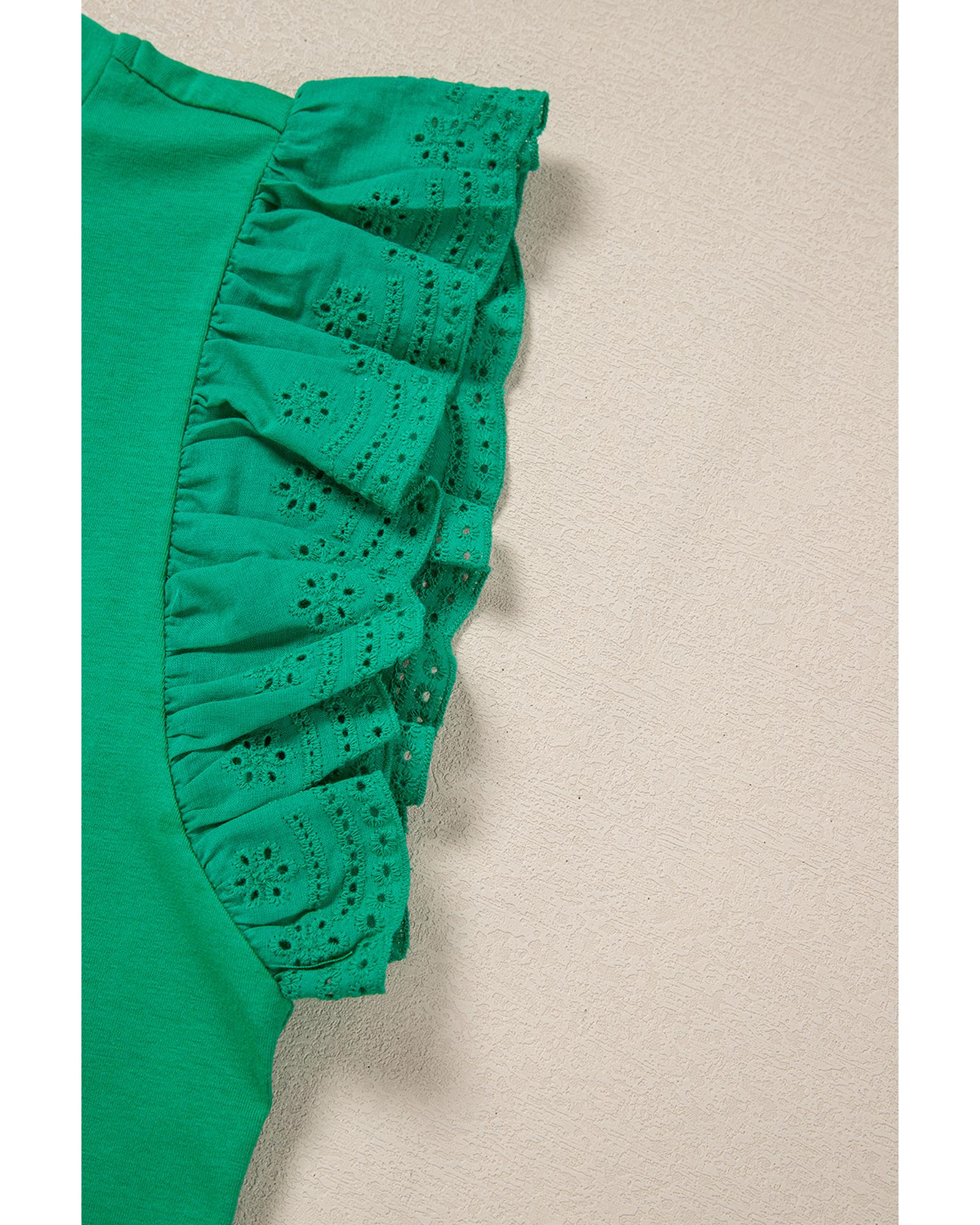 Dark Green Embroidered Ruffled Sleeve Slim Fit Crew Neck Top – S