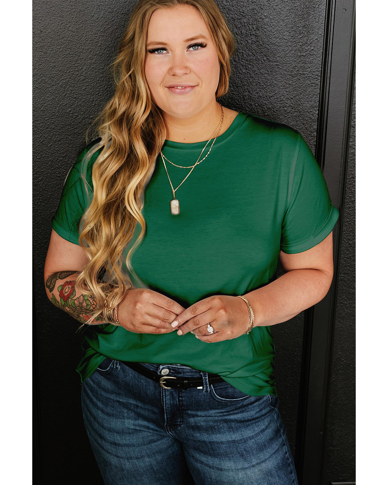 Dark Green Round Neck Rolled Sleeve Plus Size T-shirt – 3X