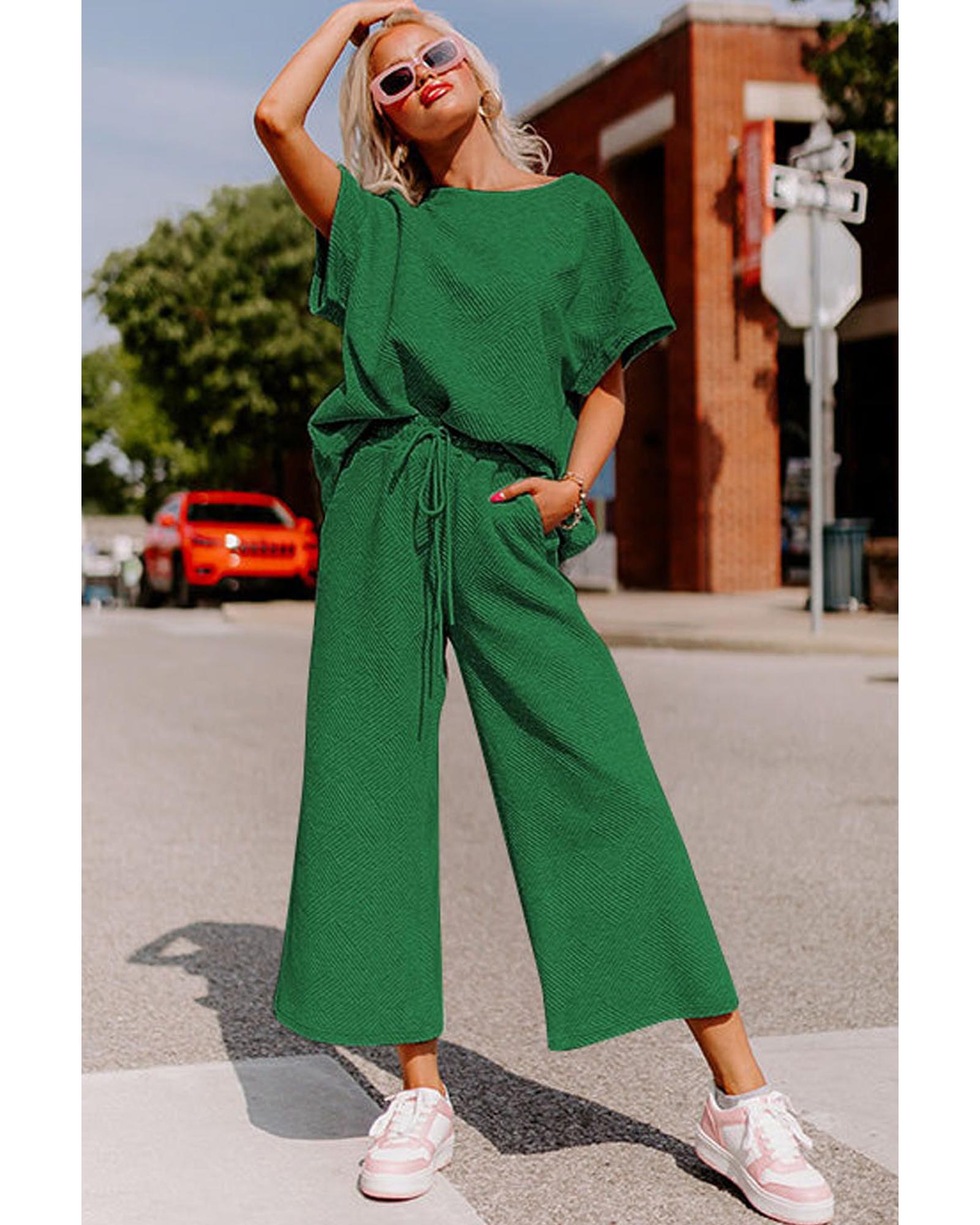 Dark Green Textured Loose Fit T Shirt and Drawstring Pants Set – L
