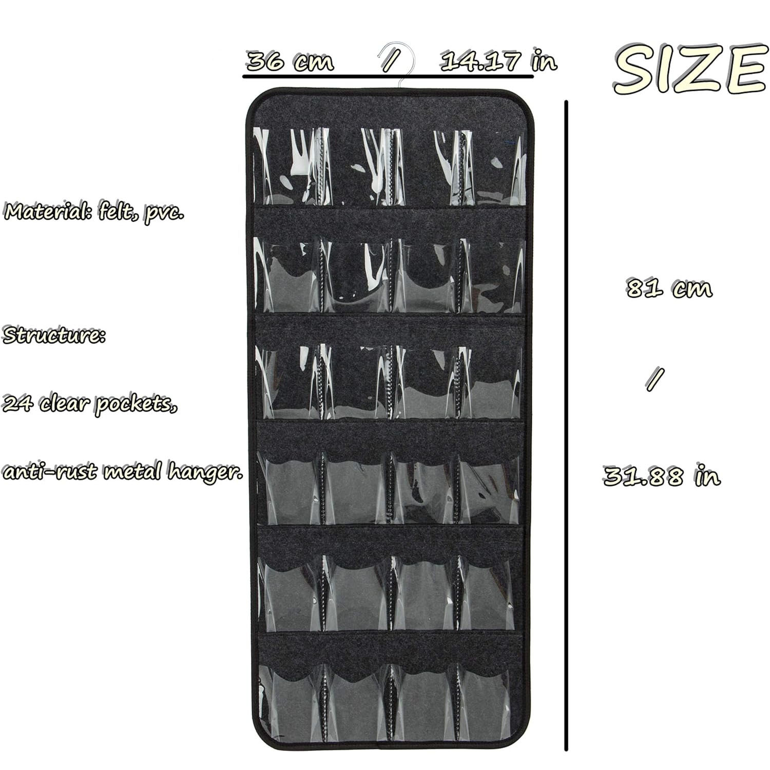 - 24 Clear Pockets: Designed to hold up to 12 pairs of shoes or various items such as toys, accessories, and more.
